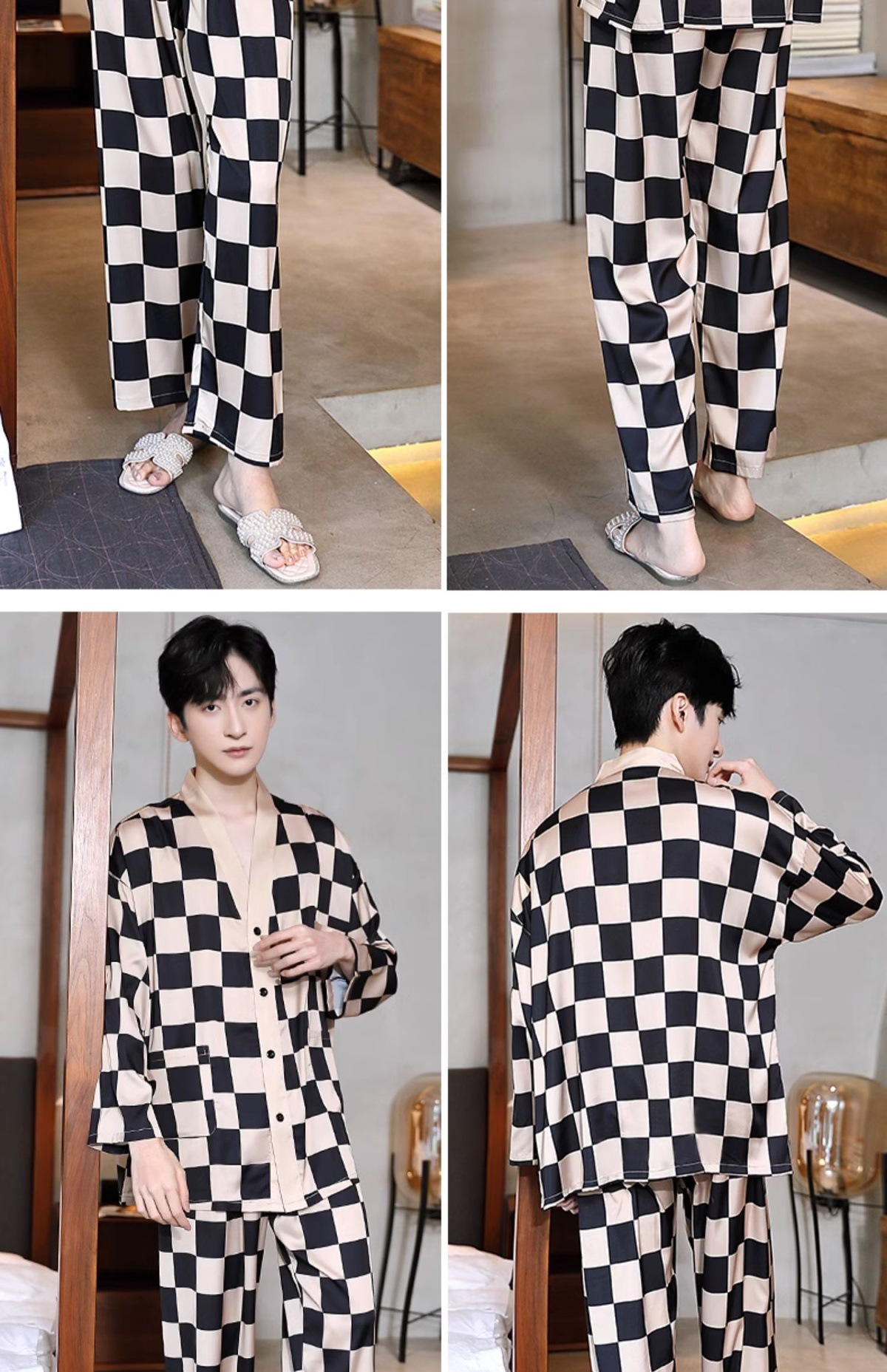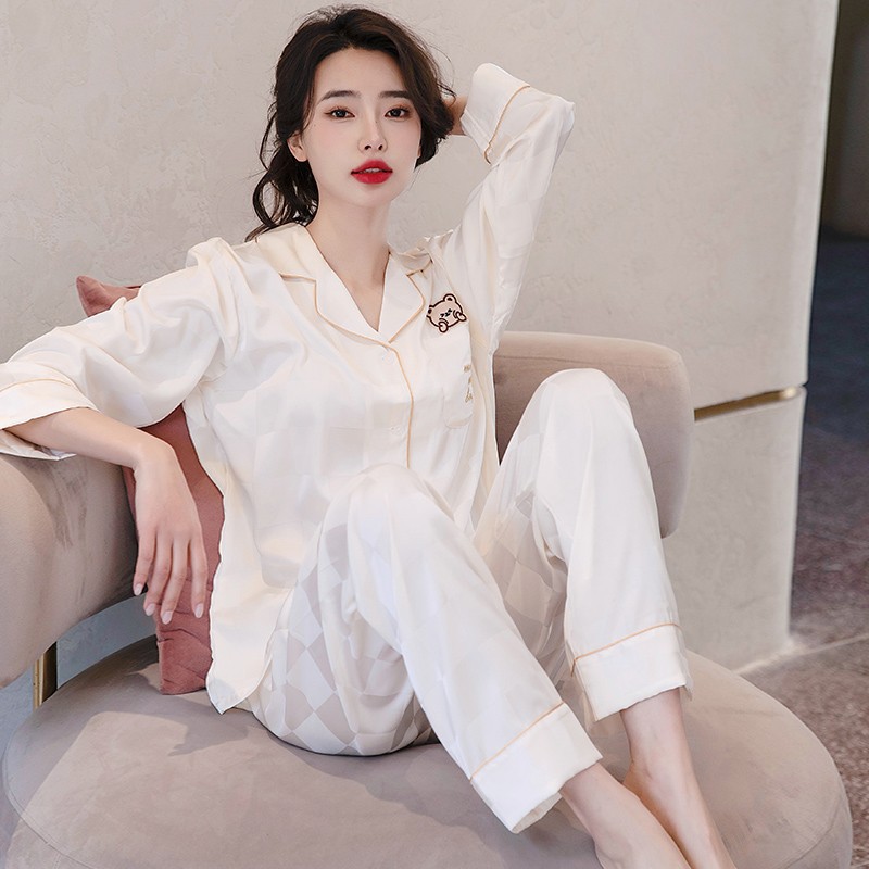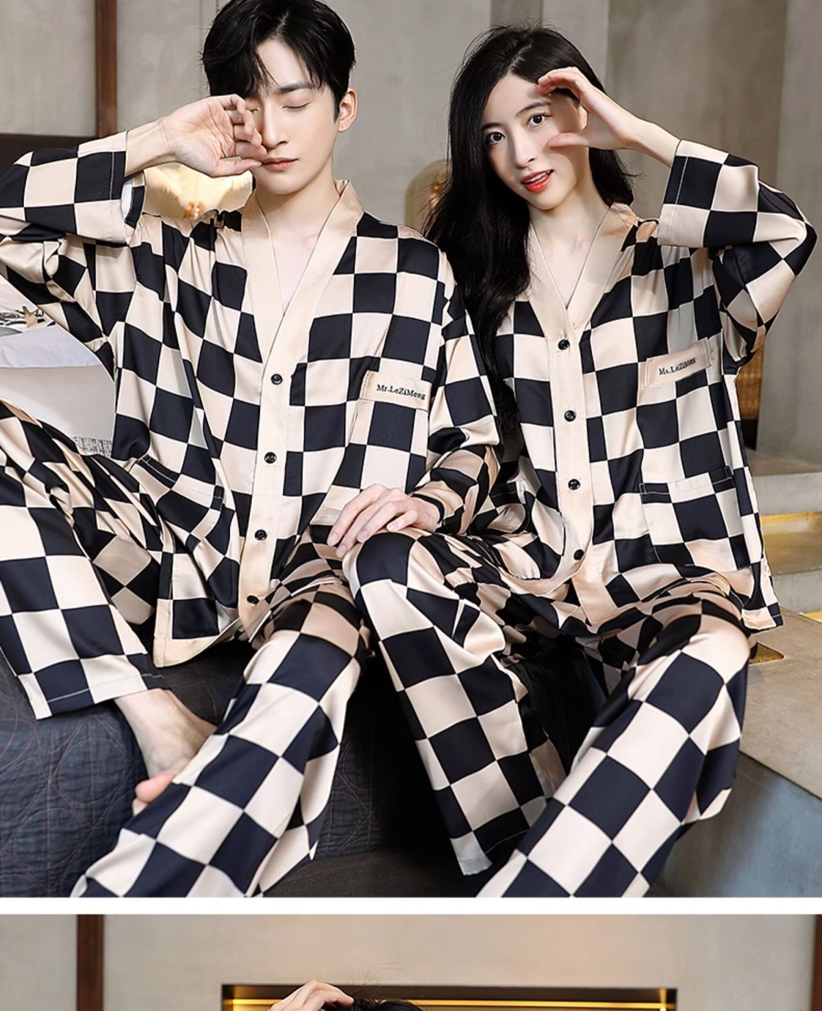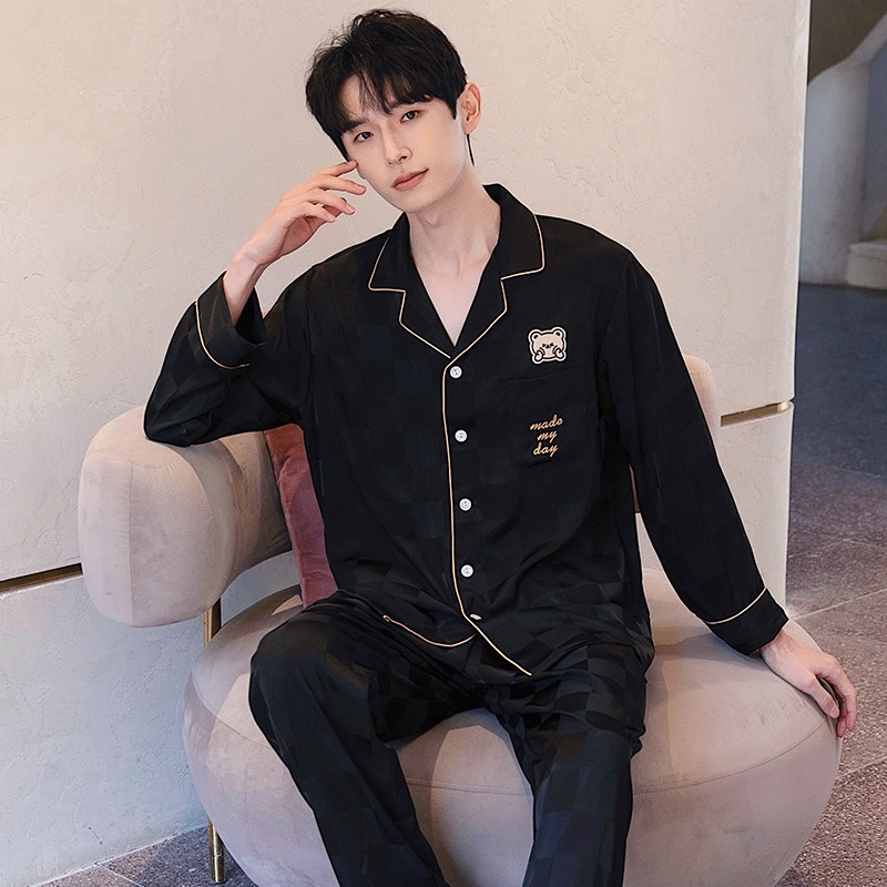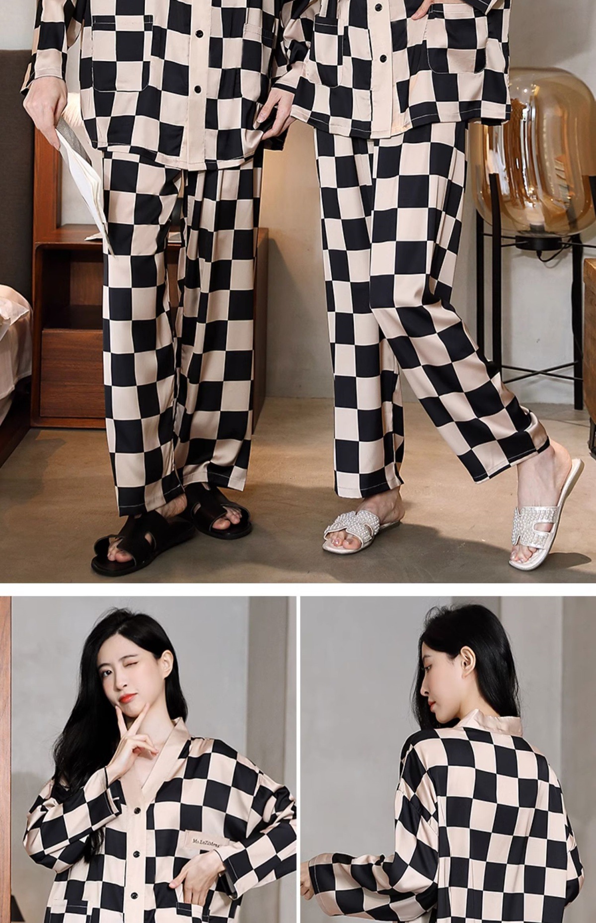 남성과 여성을 위한 아이스 실크 잠옷 커플 세트 봄, 가을 V 넥 체커보드 체크 무늬 긴팔 카디건 실크 홈웨어스토어 가기
