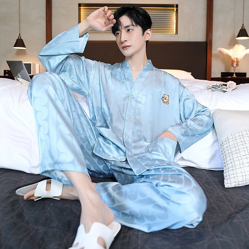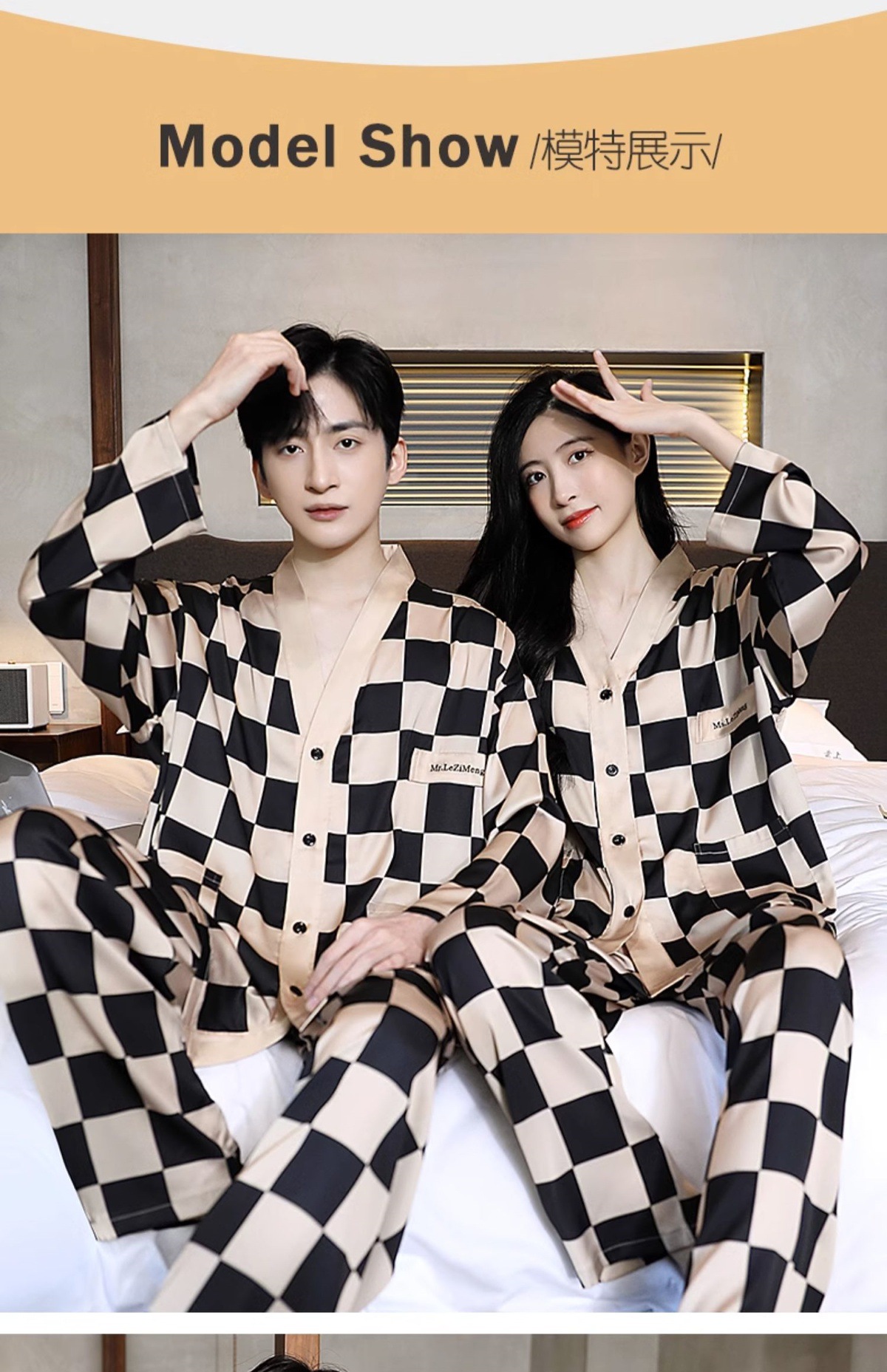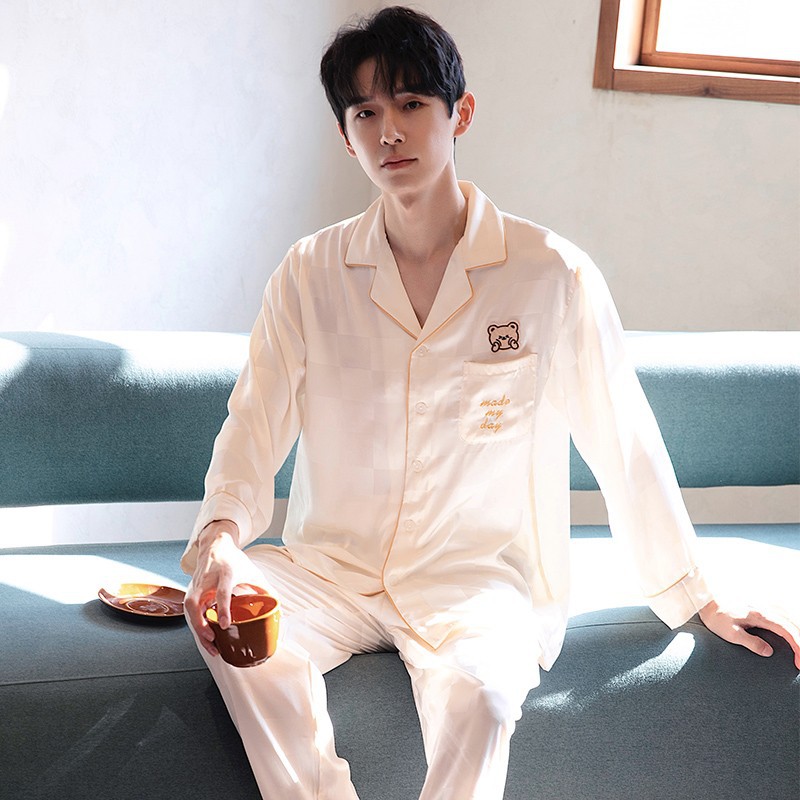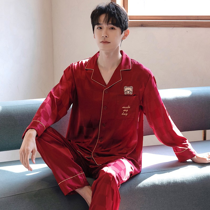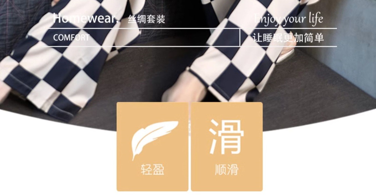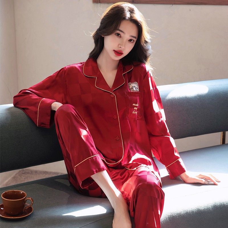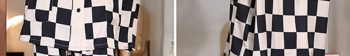 남성과 여성을 위한 아이스 실크 잠옷 커플 세트 봄, 가을 V 넥 체커보드 체크 무늬 긴팔 카디건 실크 홈웨어스토어 가기