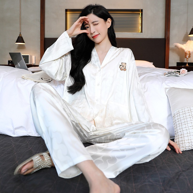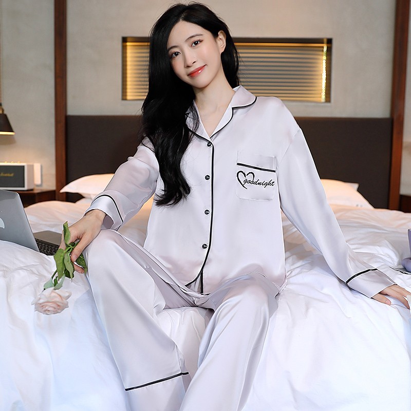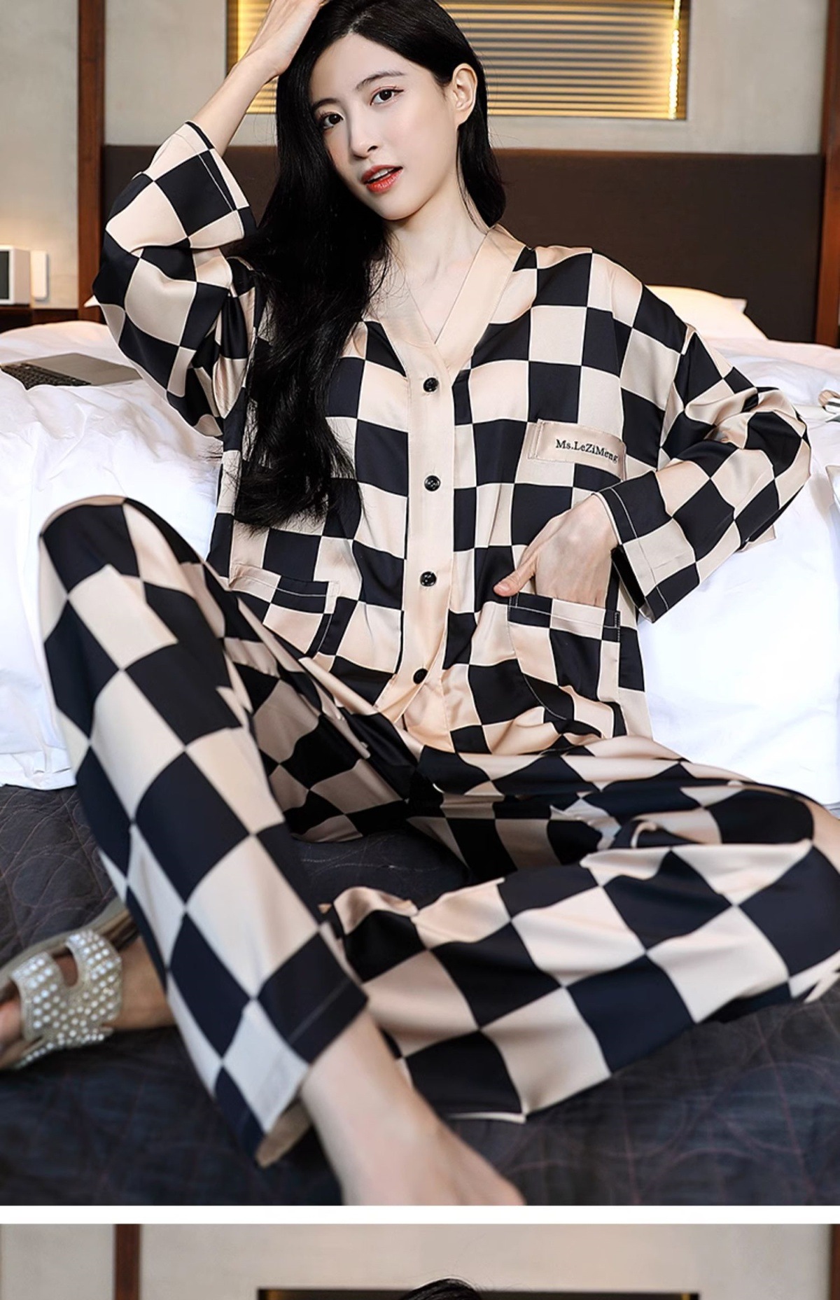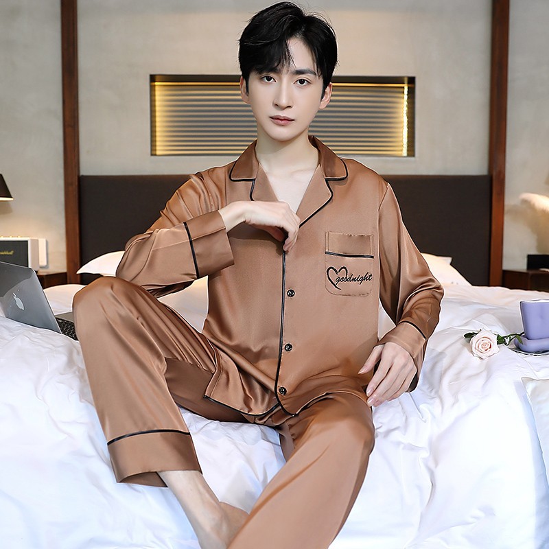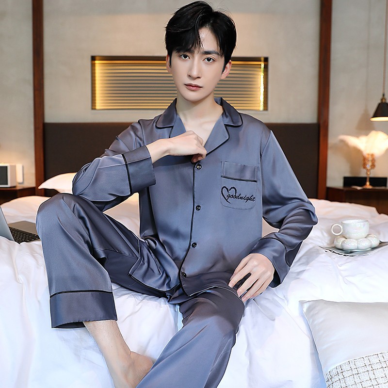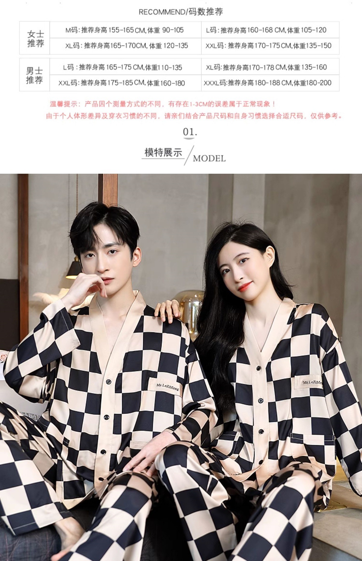남성과 여성을 위한 아이스 실크 잠옷 커플 세트 봄, 가을 V 넥 체커보드 체크 무늬 긴팔 카디건 실크 홈웨어스토어 가기