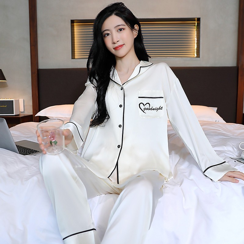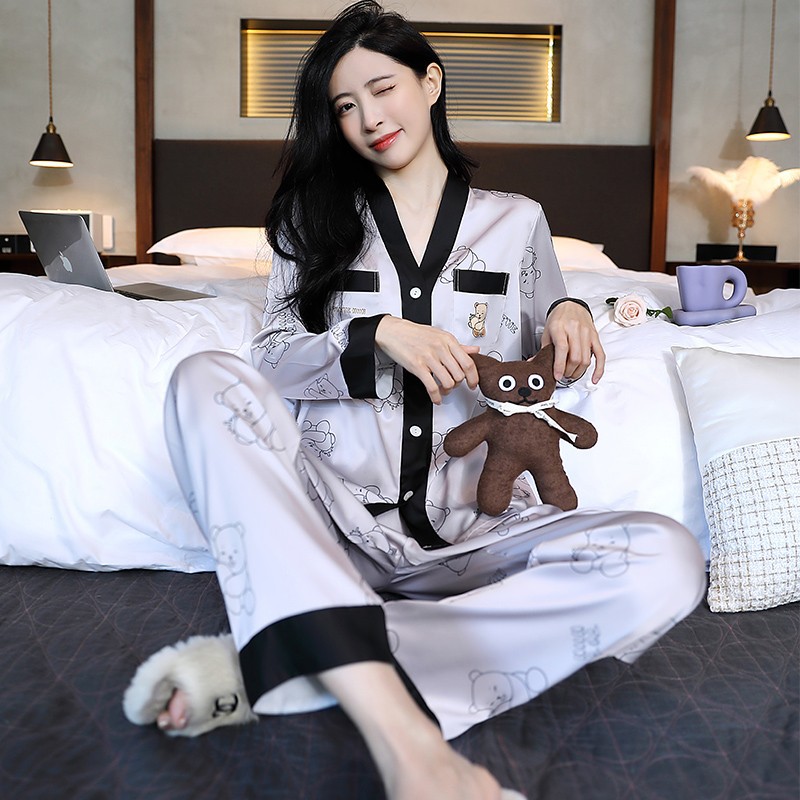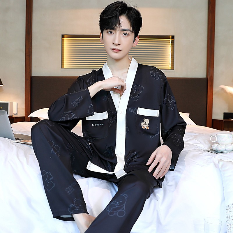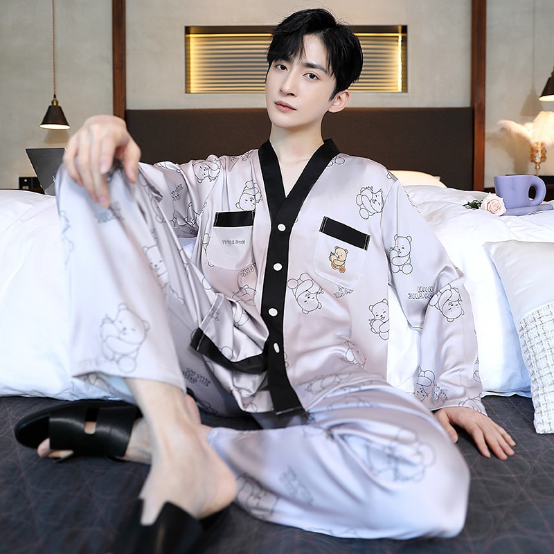 남성과 여성을 위한 아이스 실크 잠옷 커플 세트 봄, 가을 V 넥 체커보드 체크 무늬 긴팔 카디건 실크 홈웨어