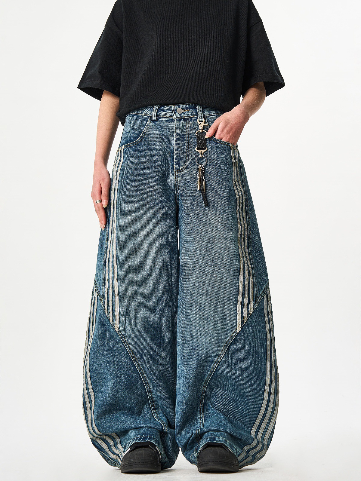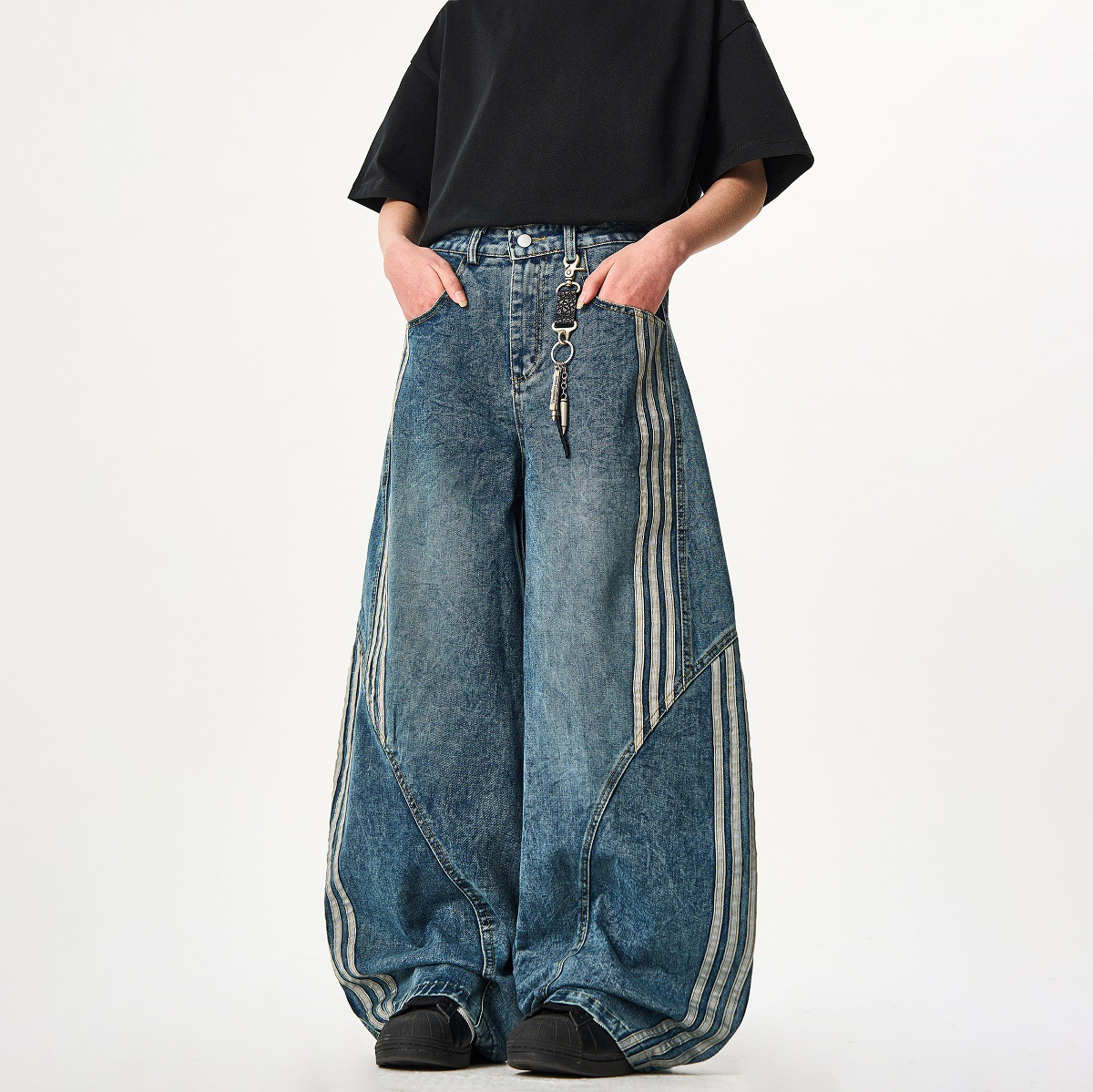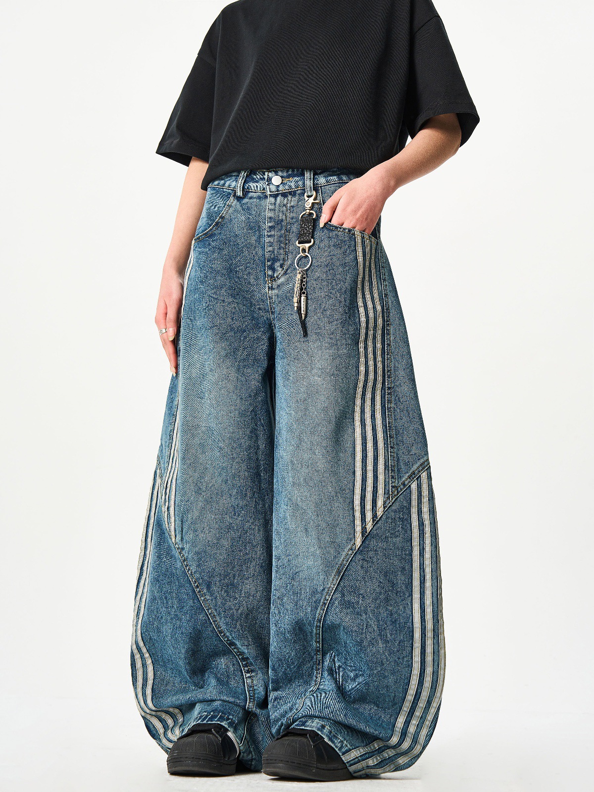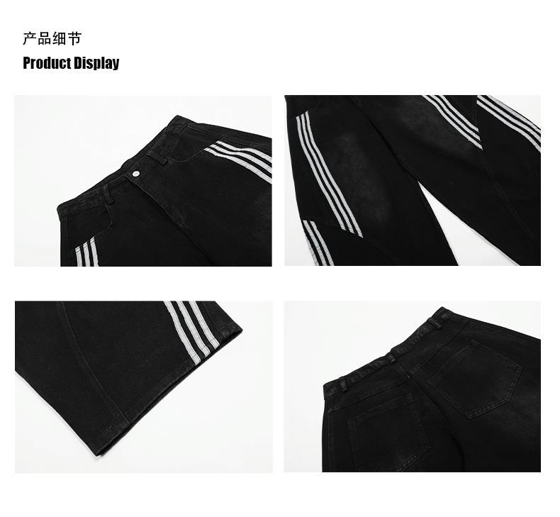 Woostop American Vintage Washed Deconstructed Machete Jeans 여성용 3 개 바 바지 줄무늬 스티칭 넓은 다리 바지스토어 가기