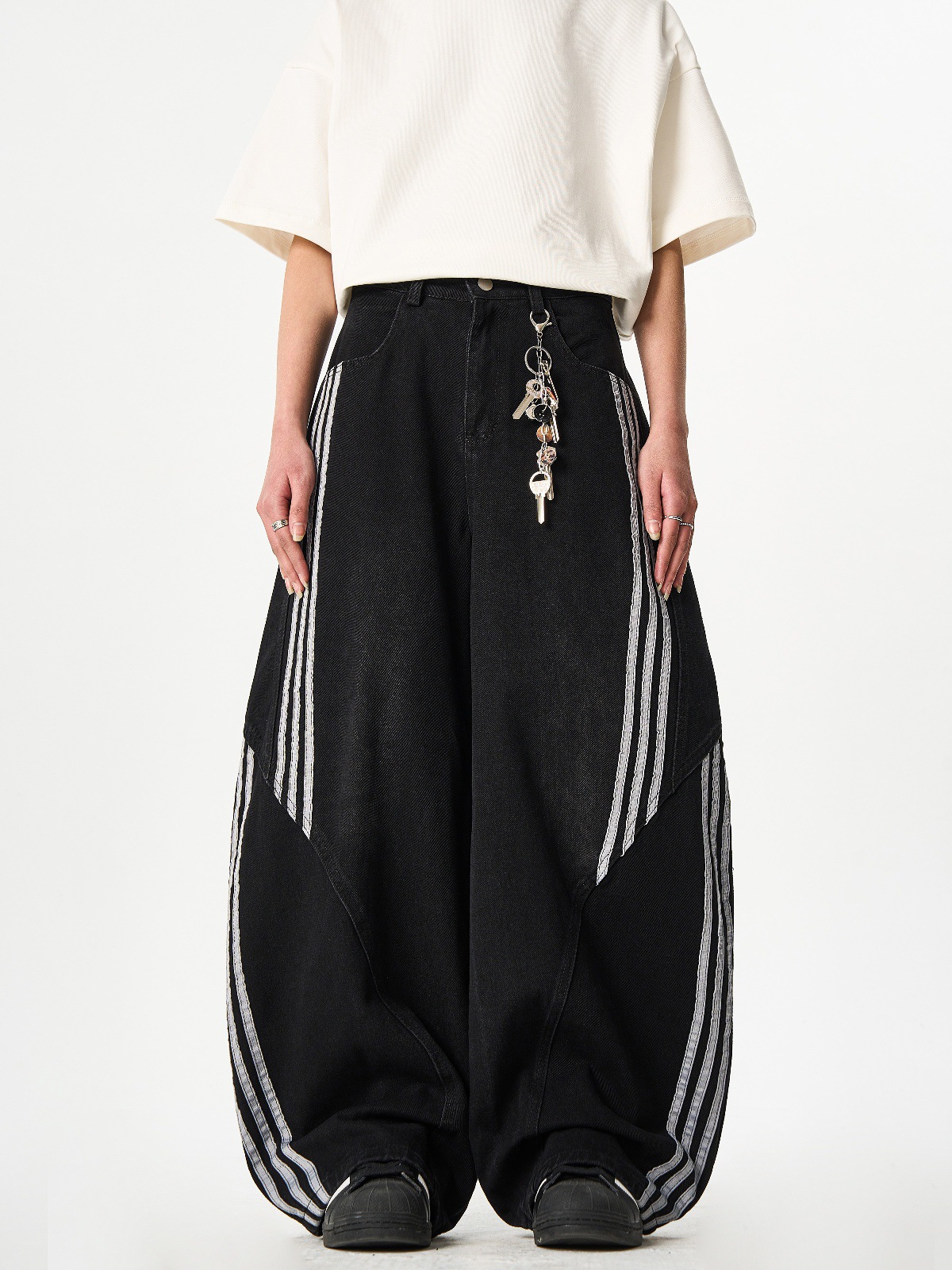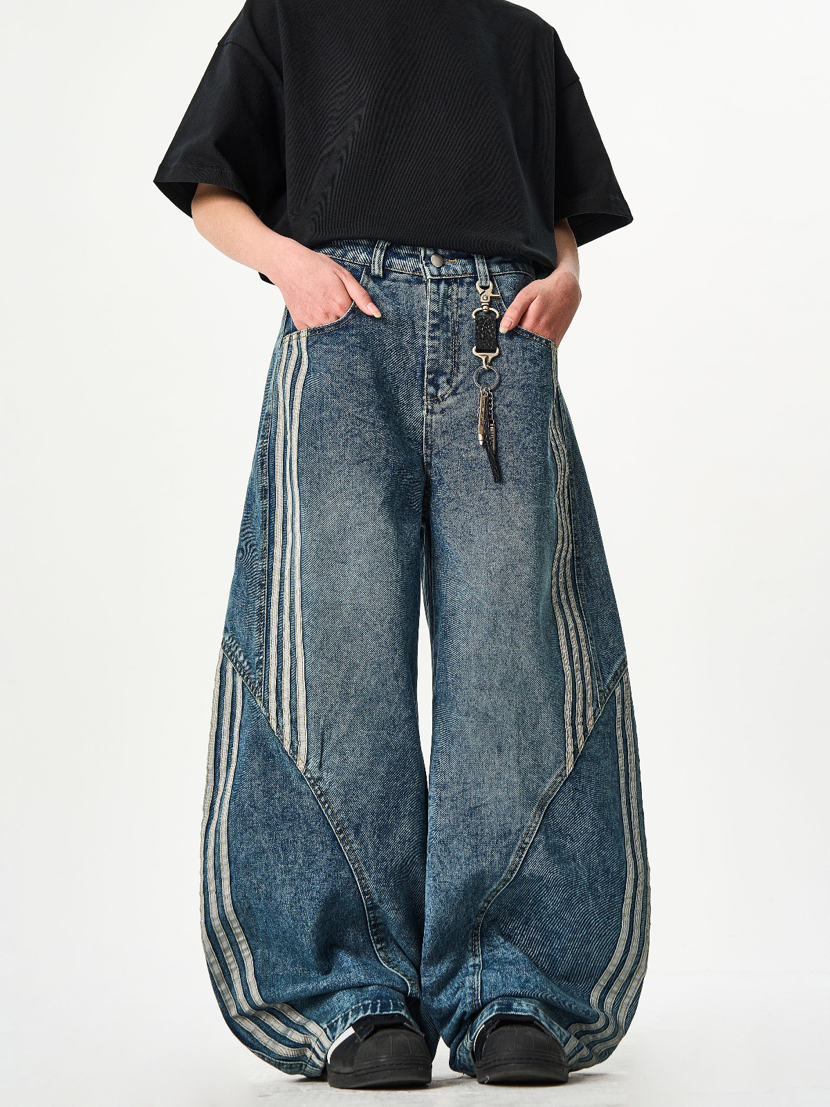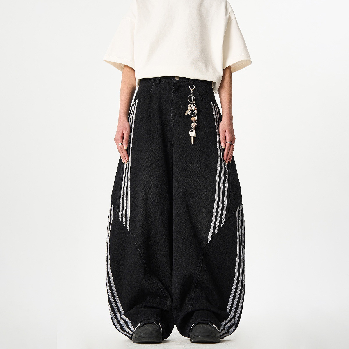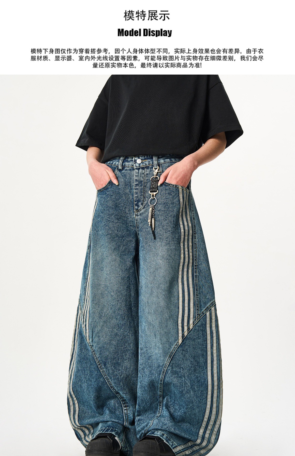 Woostop American Vintage Washed Deconstructed Machete Jeans 여성용 3 개 바 바지 줄무늬 스티칭 넓은 다리 바지스토어 가기