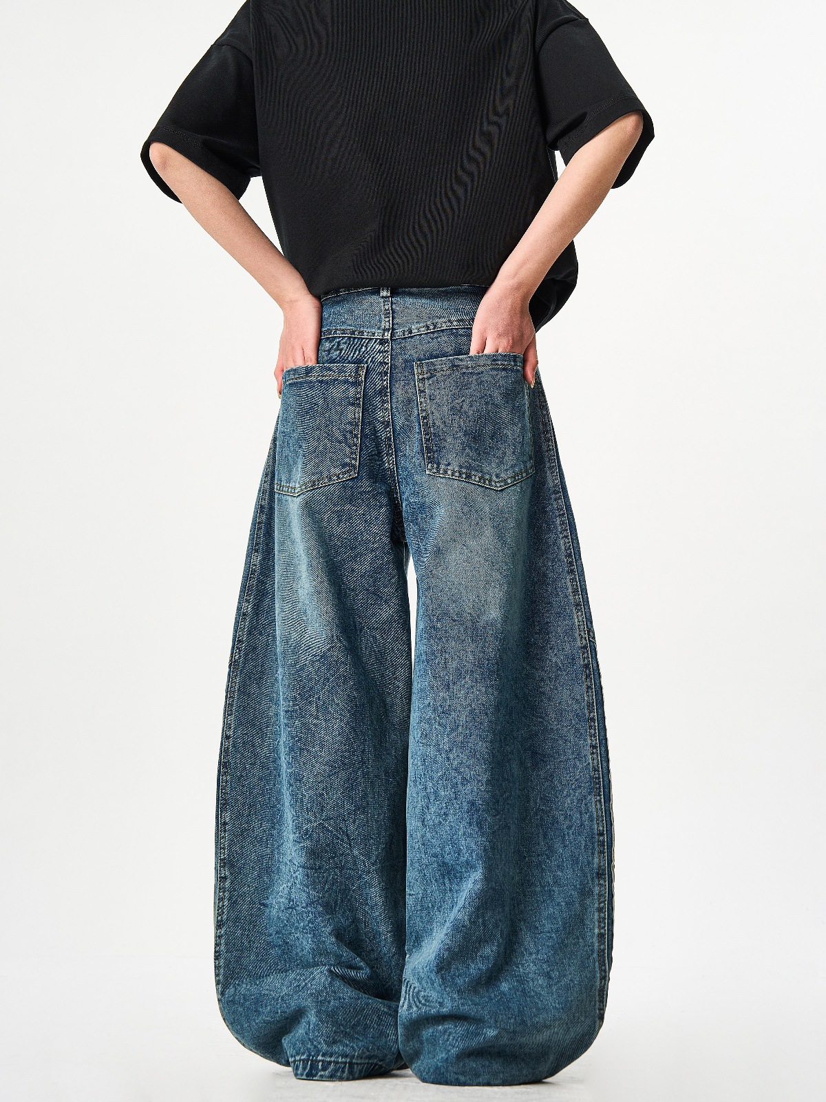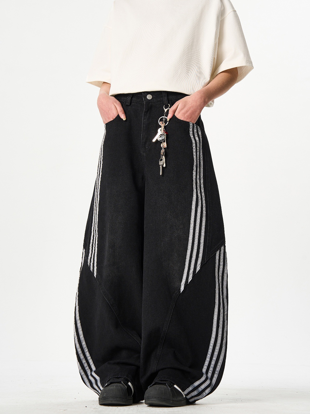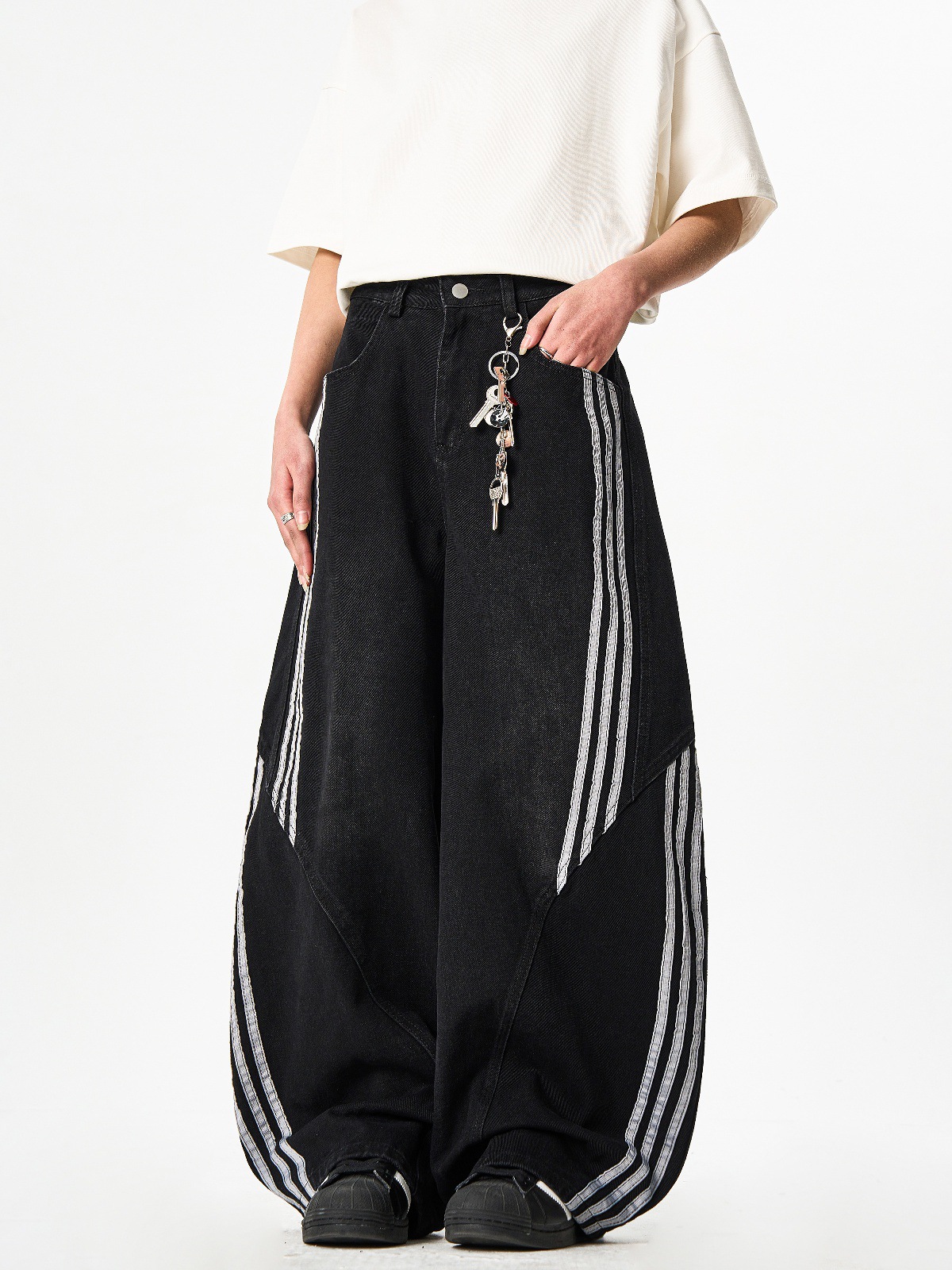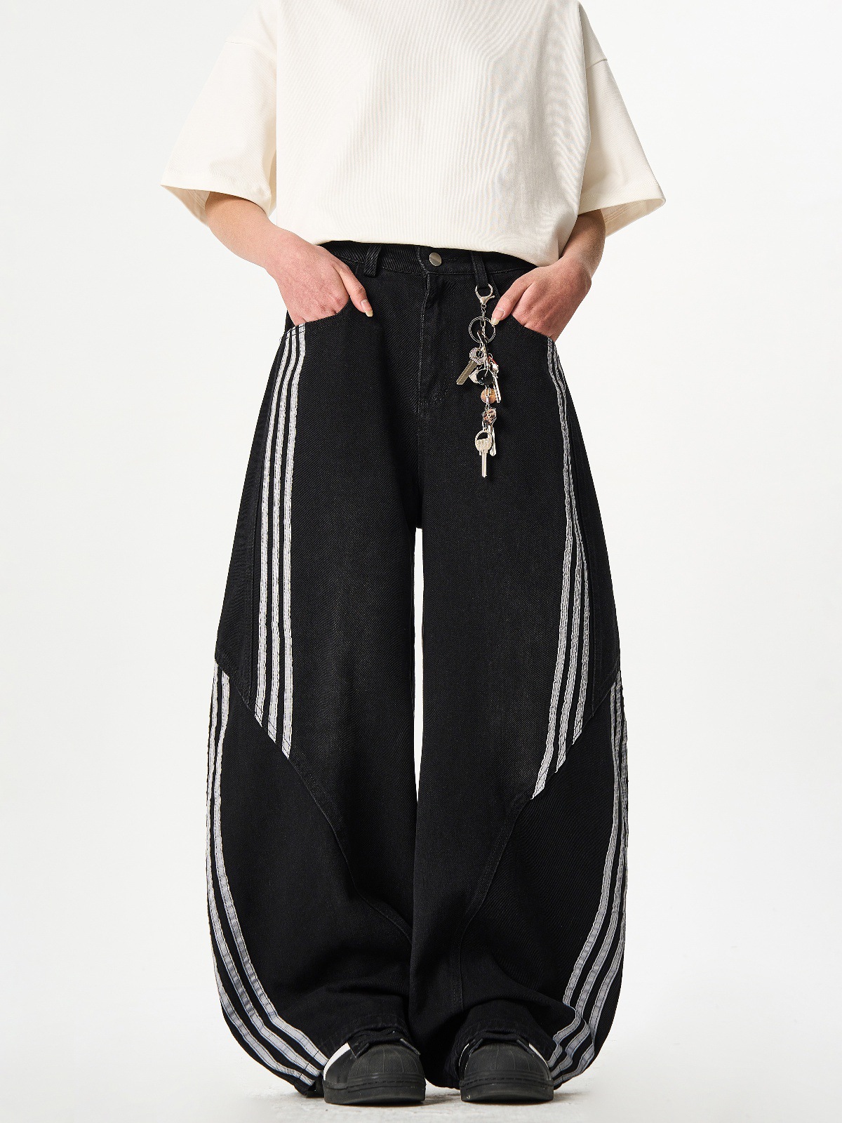 Woostop American Vintage Washed Deconstructed Machete Jeans 여성용 3 개 바 바지 줄무늬 스티칭 넓은 다리 바지스토어 가기