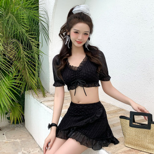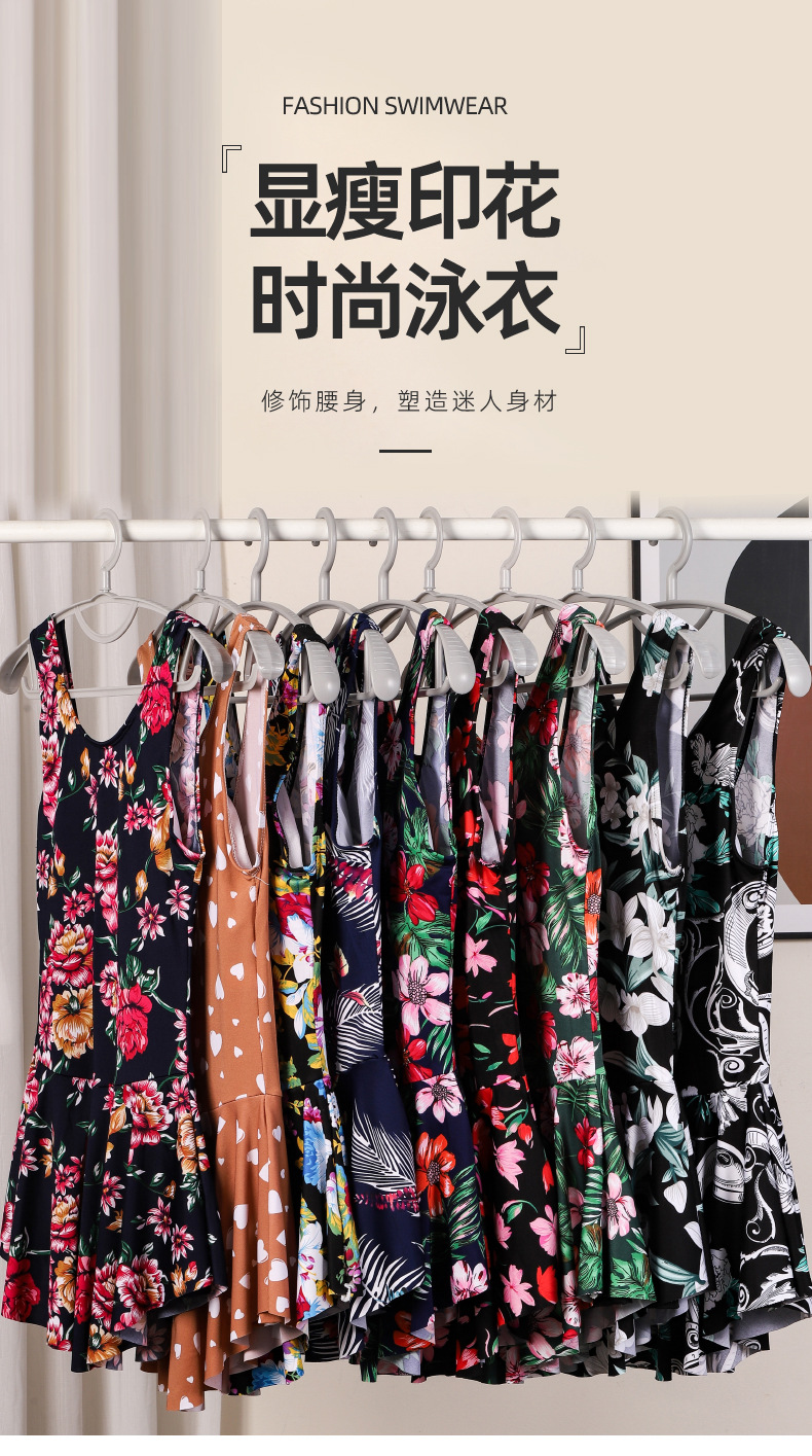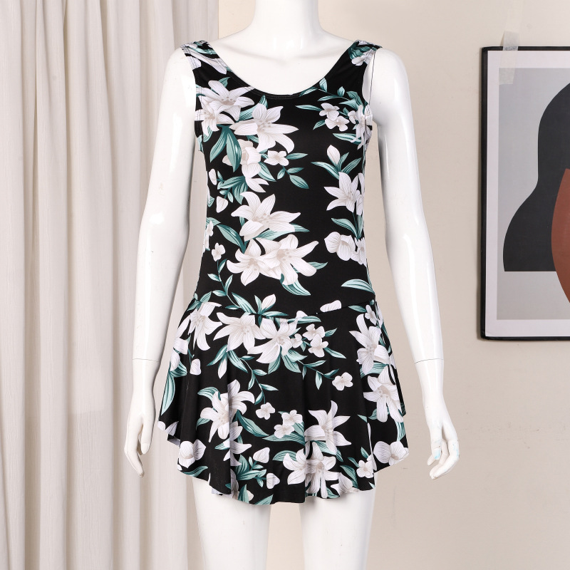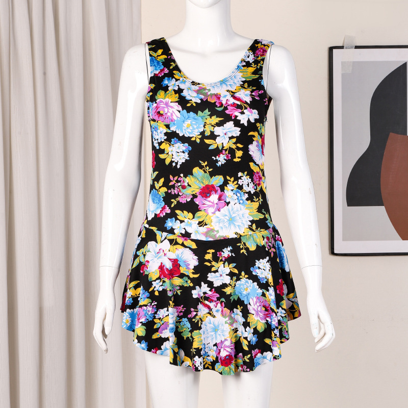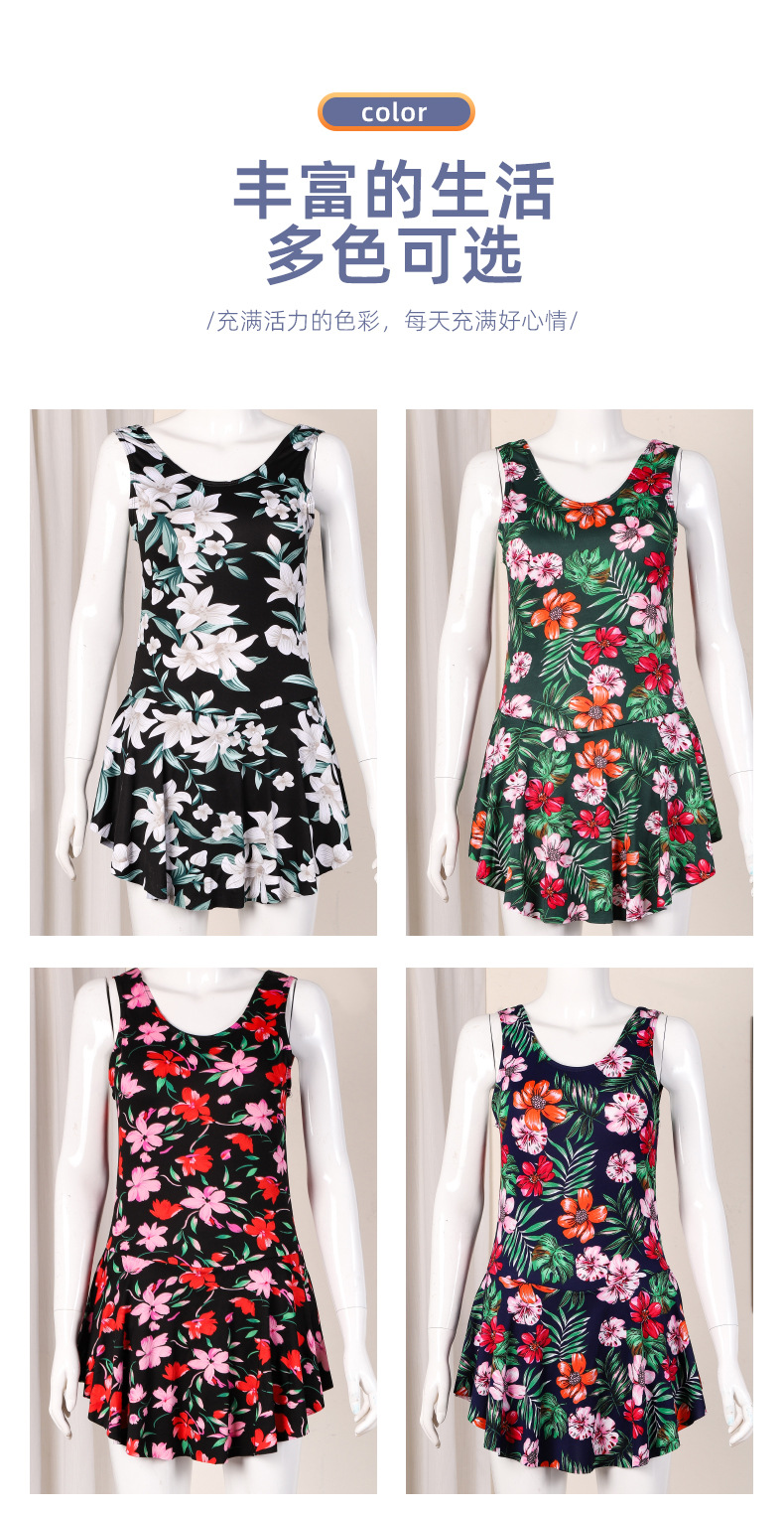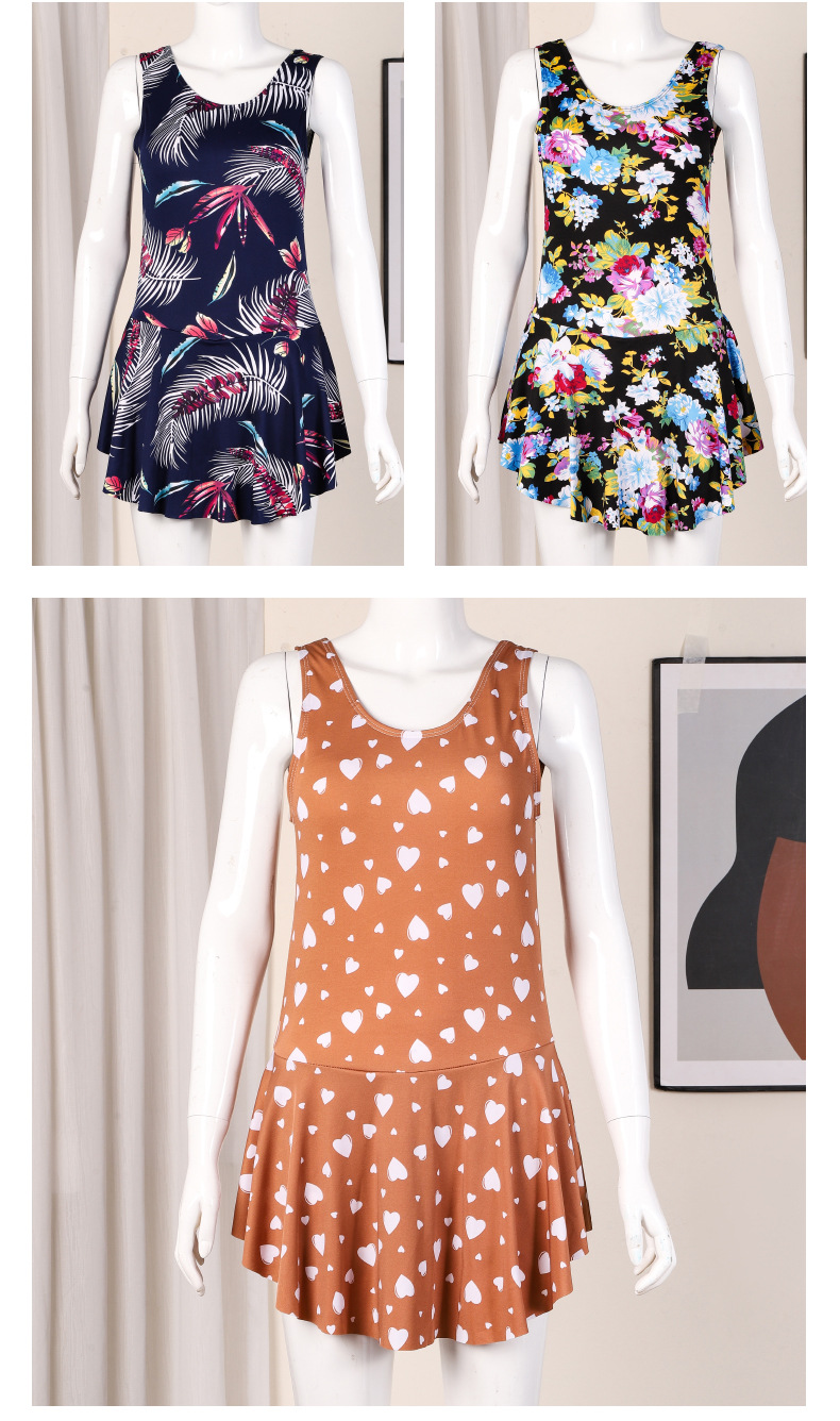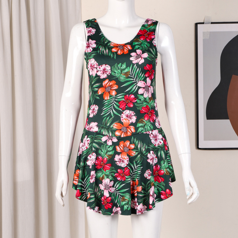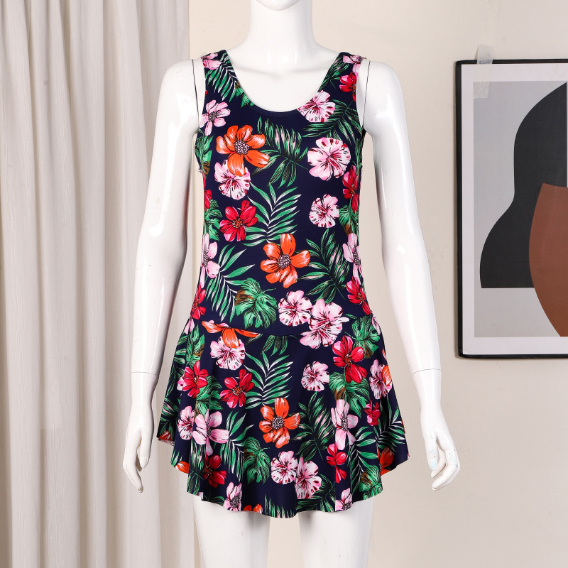 새로운 원피스 민소매 플러스 사이즈 슬리밍 수영복 여름 신제품 라운드 넥 스커트 스타일 프린트 편안한 속건성 수영복 도매스토어 가기