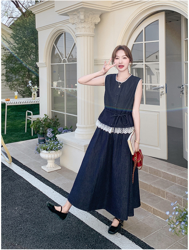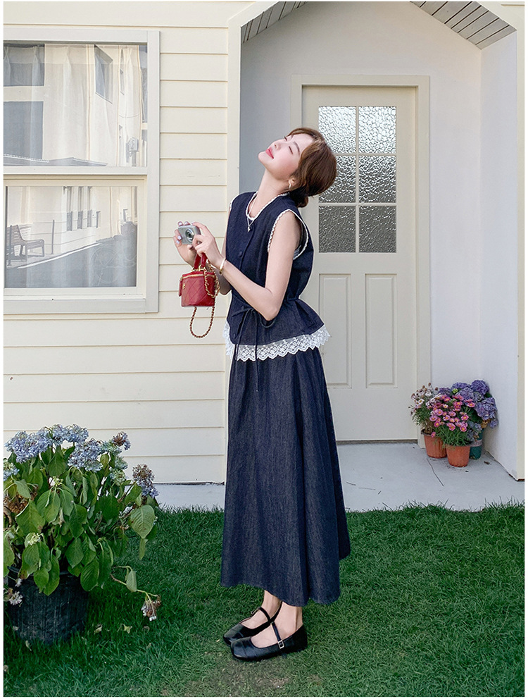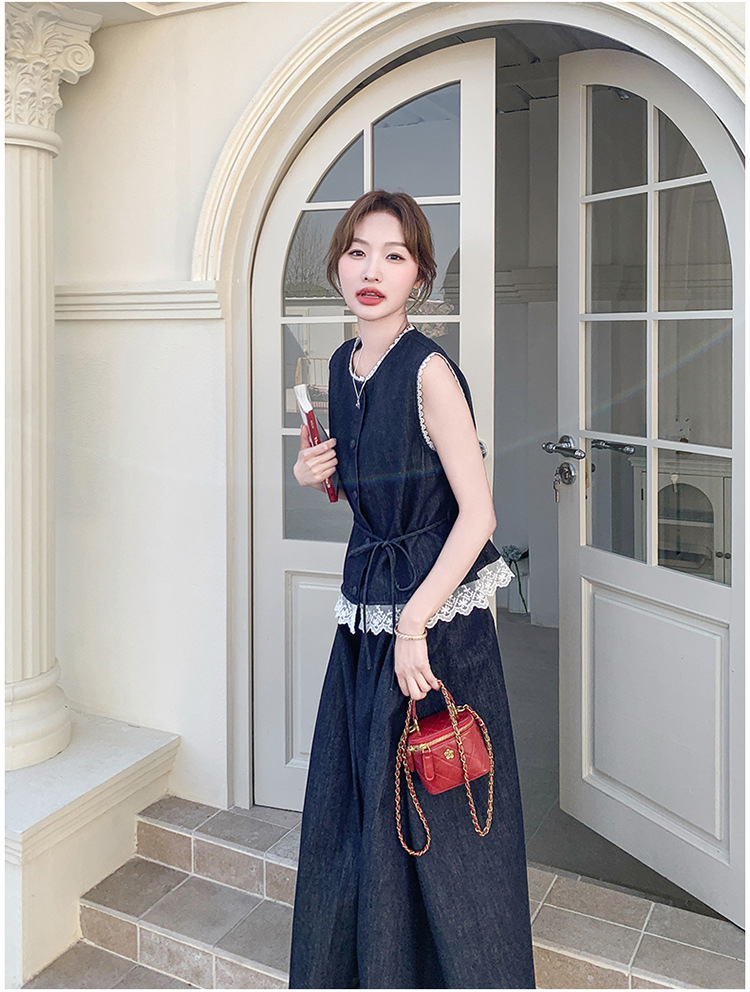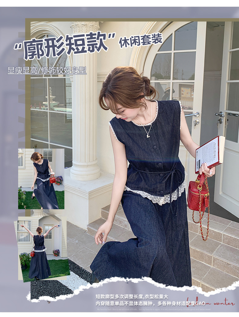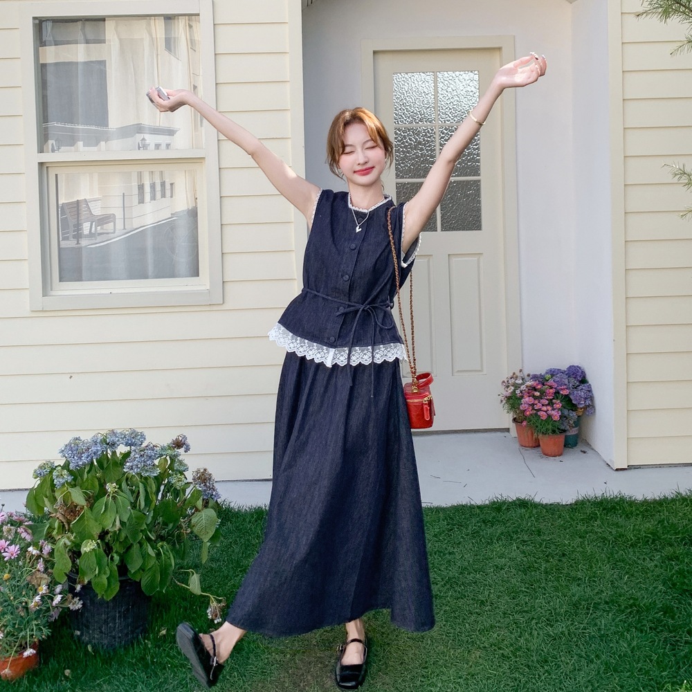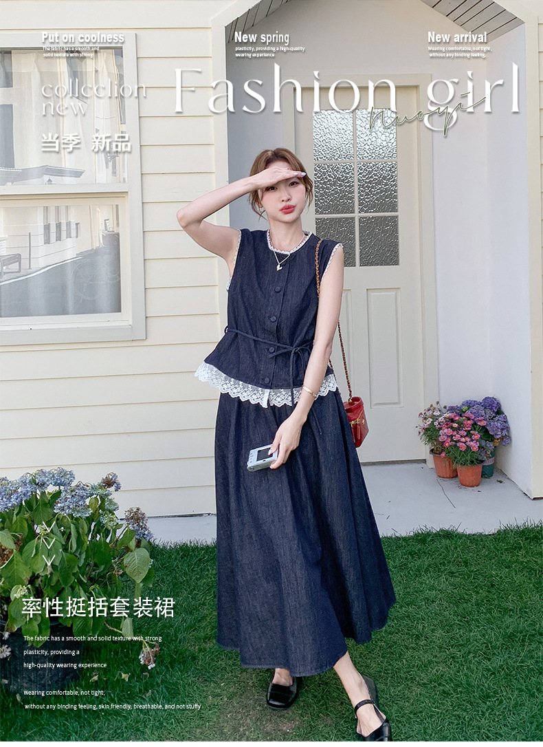 네이비 한국식 우아한 투피스 세트 여자 2025 년 여름 새 스타일 레이스 민소매 데님 조끼 투피스 세트스토어 가기