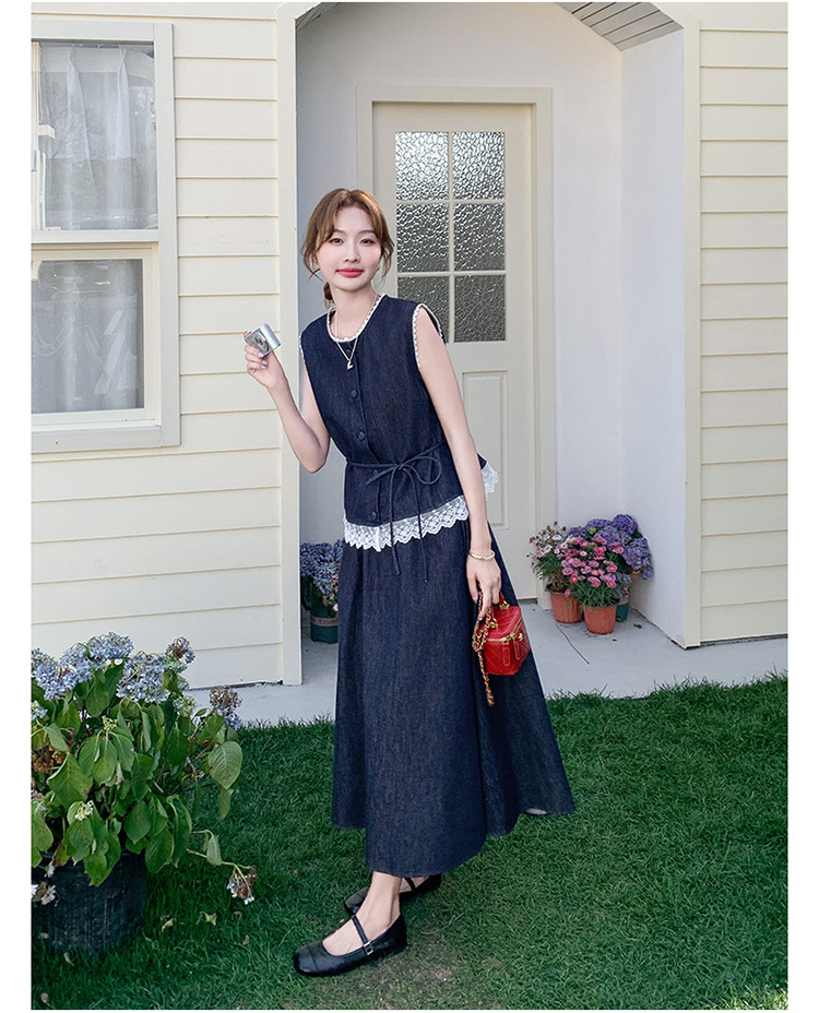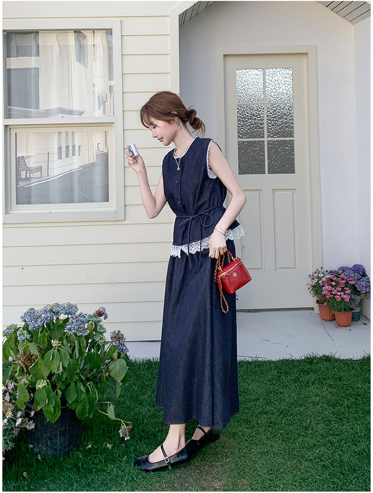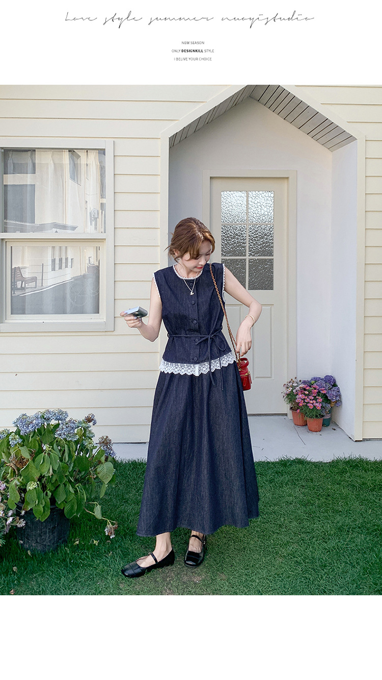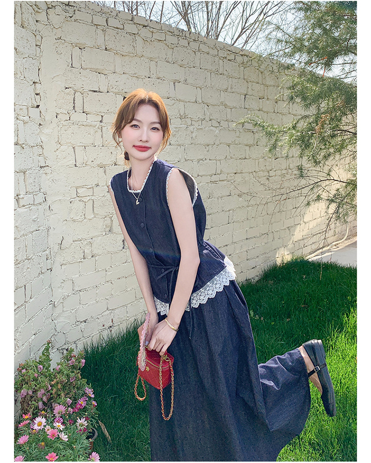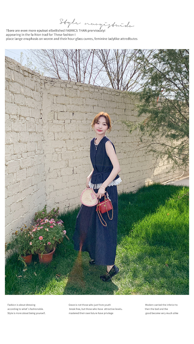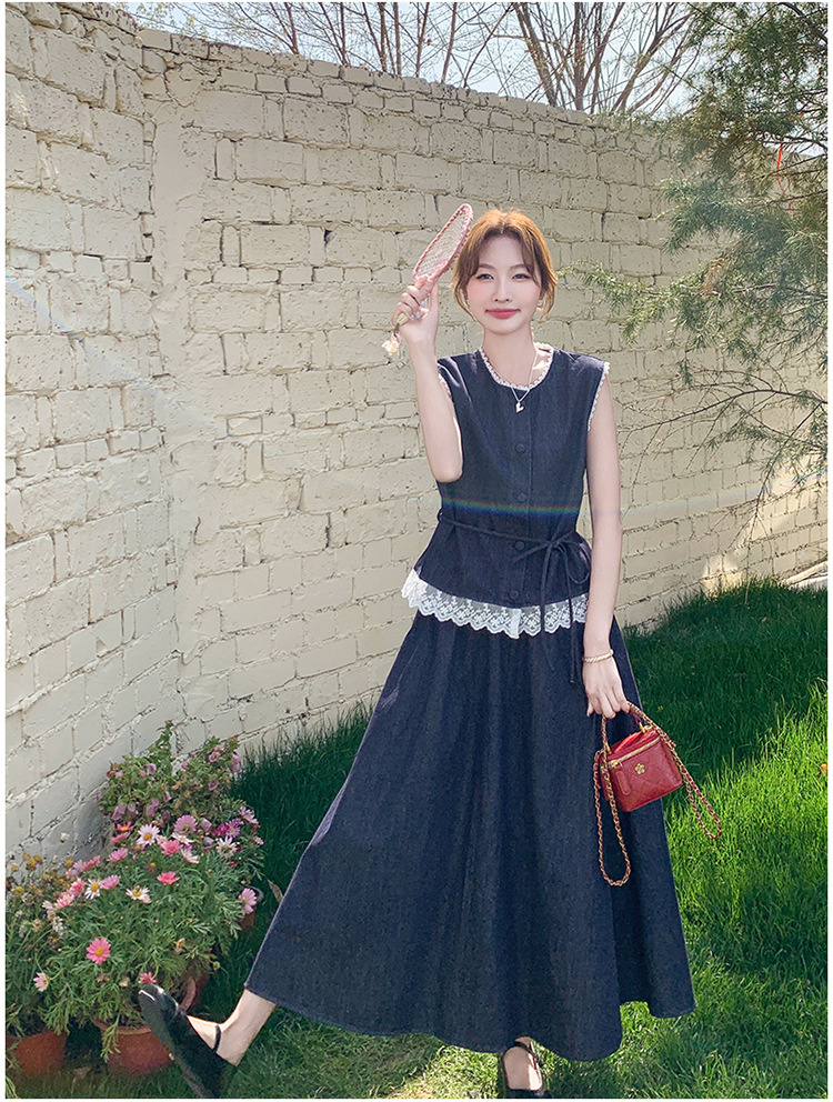 네이비 한국식 우아한 투피스 세트 여자 2025 년 여름 새 스타일 레이스 민소매 데님 조끼 투피스 세트스토어 가기