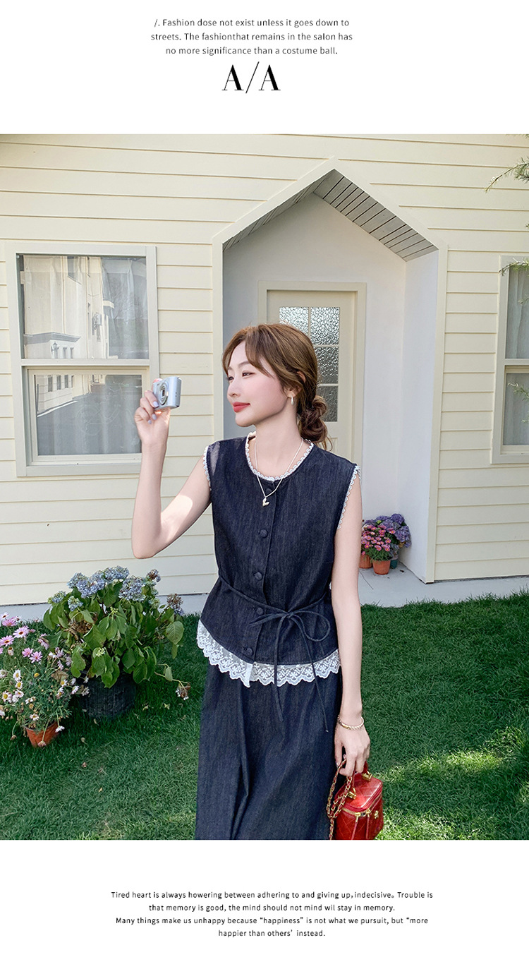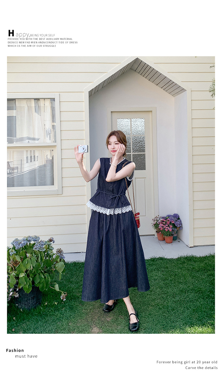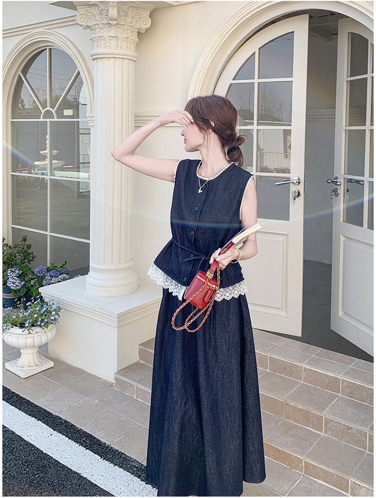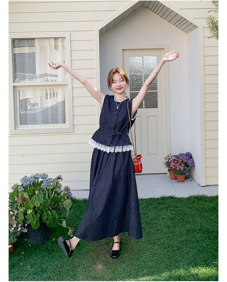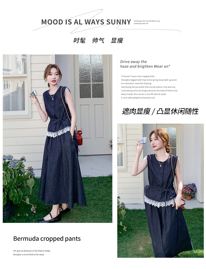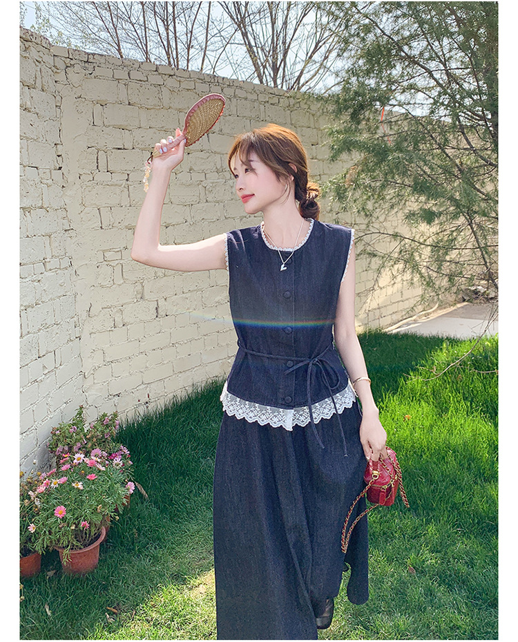 네이비 한국식 우아한 투피스 세트 여자 2025 년 여름 새 스타일 레이스 민소매 데님 조끼 투피스 세트스토어 가기