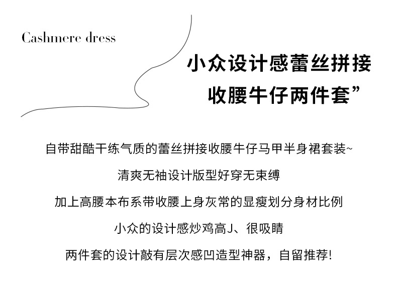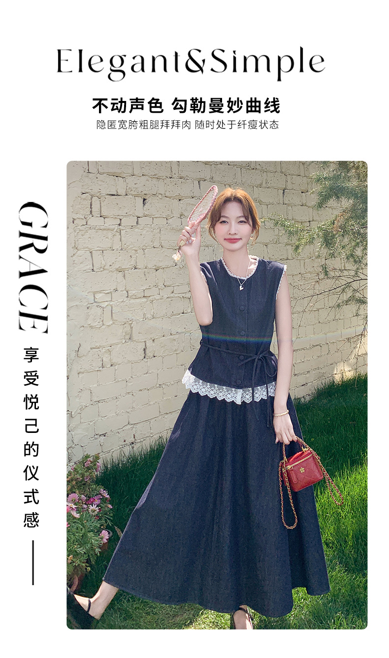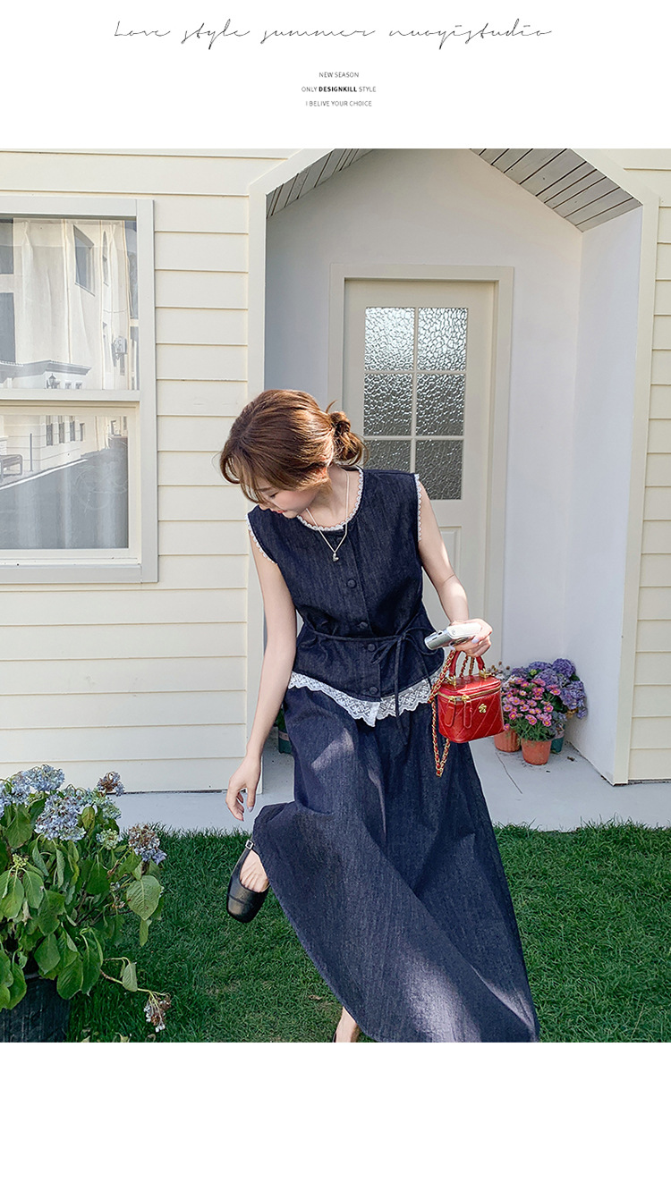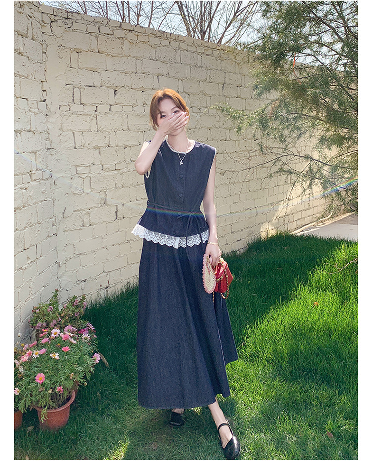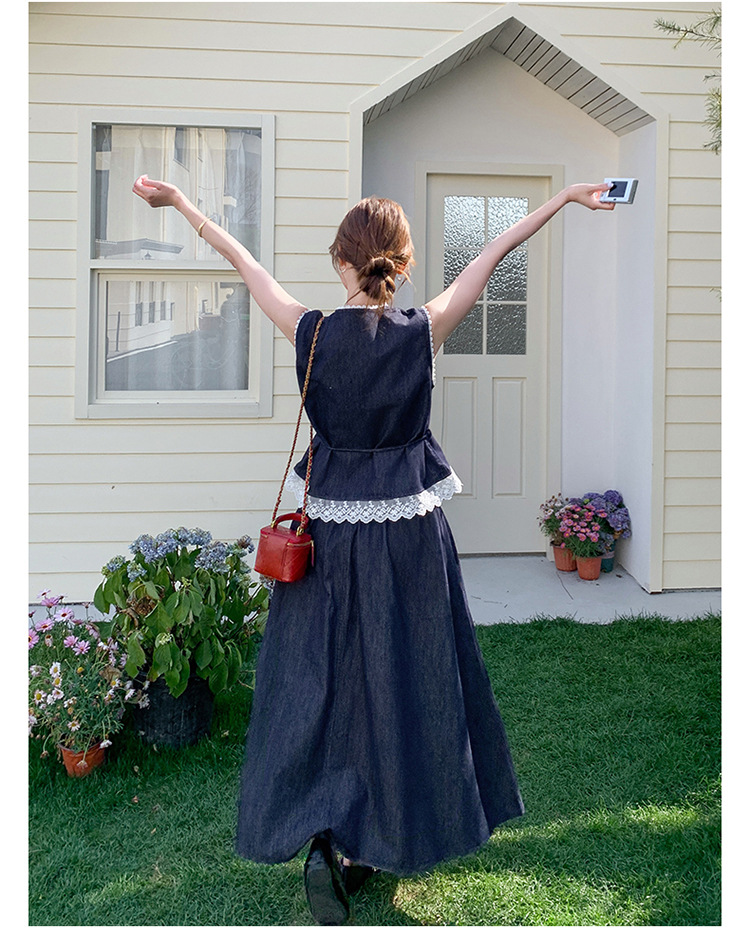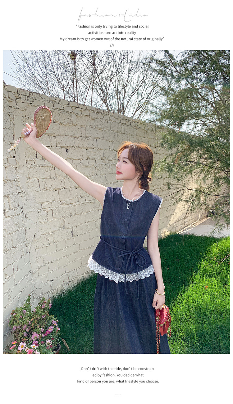 네이비 한국식 우아한 투피스 세트 여자 2025 년 여름 새 스타일 레이스 민소매 데님 조끼 투피스 세트스토어 가기
