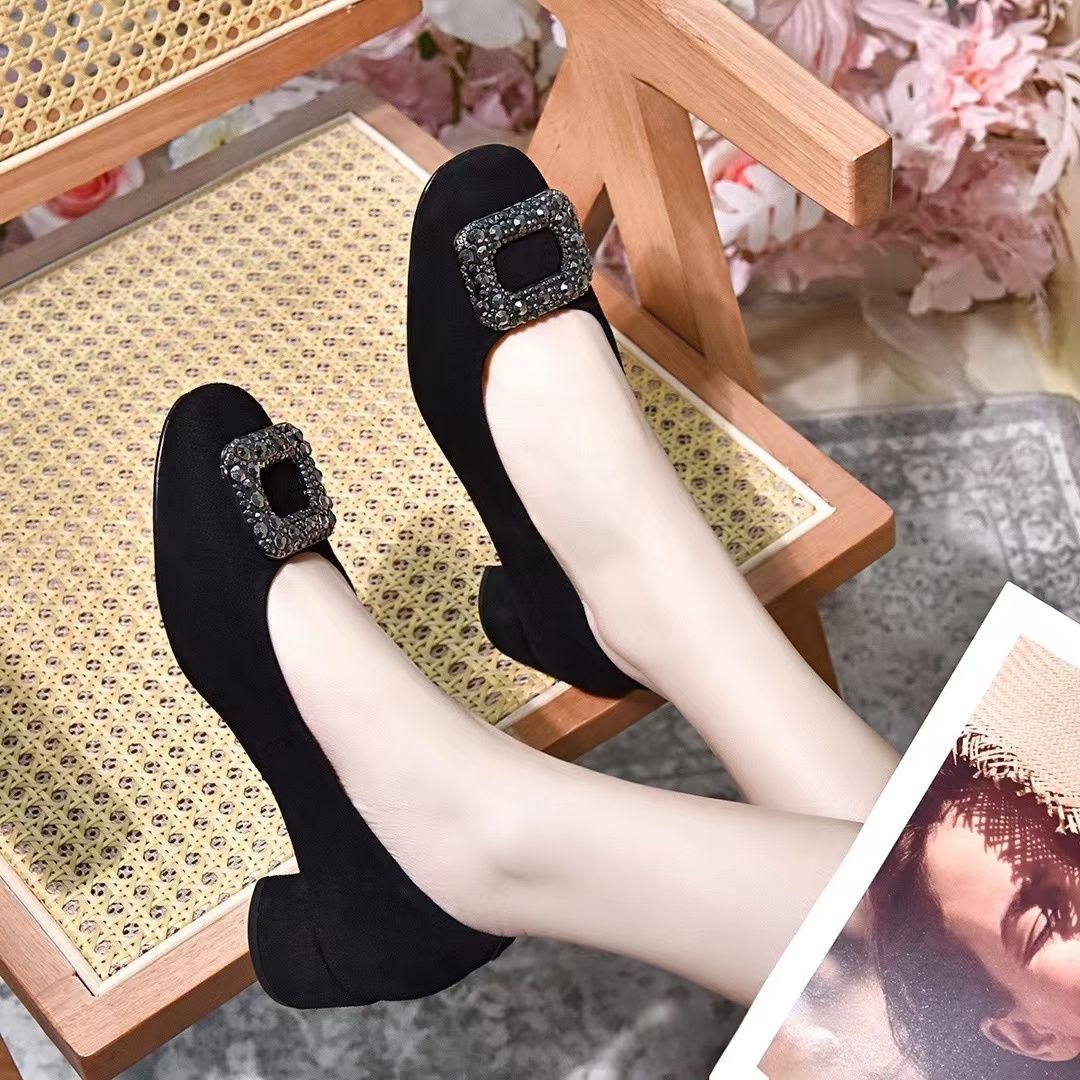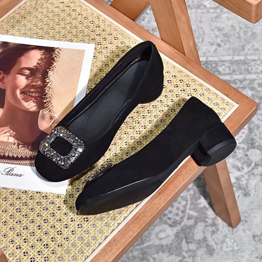 여성을위한 작은 부드러운 가죽 두꺼운 굽 신발 2025 봄과 가을 새로운 스타일의 얕은 입 저녁 신발 프랑스 스타일 라인 석 낮은 굽 작업 신발