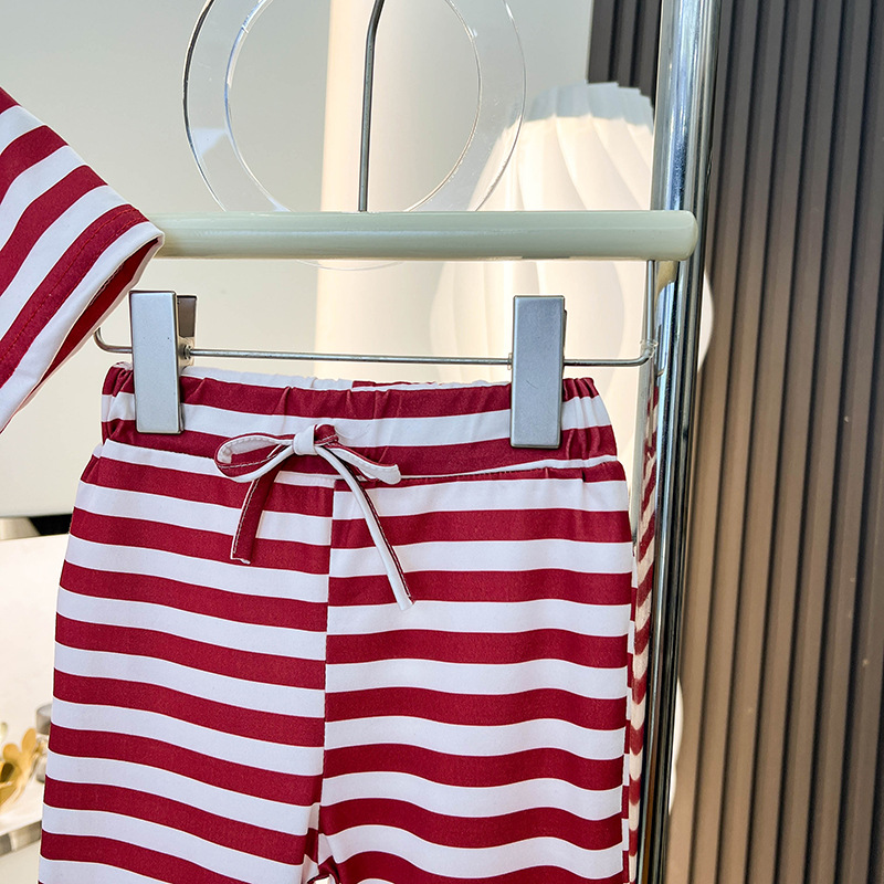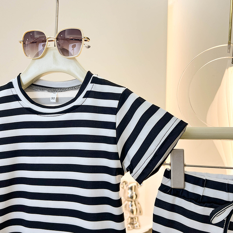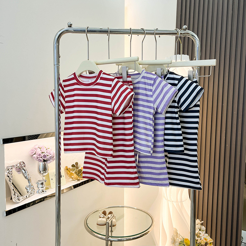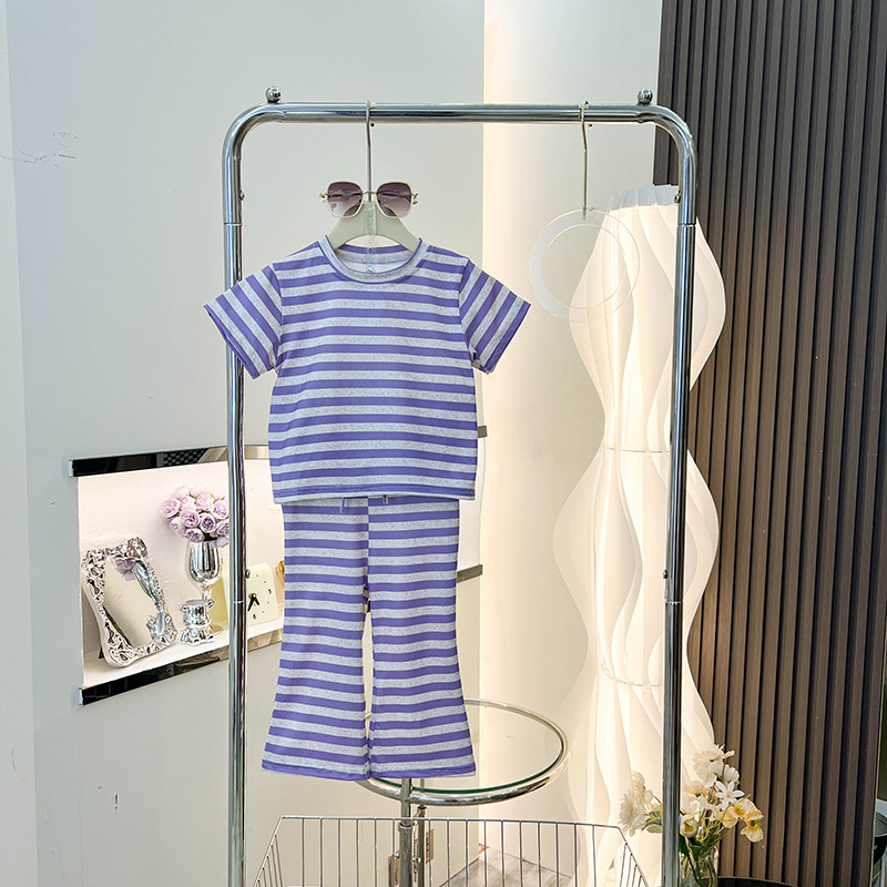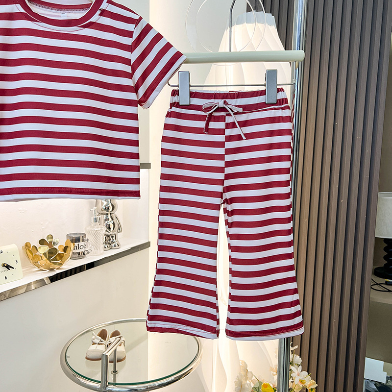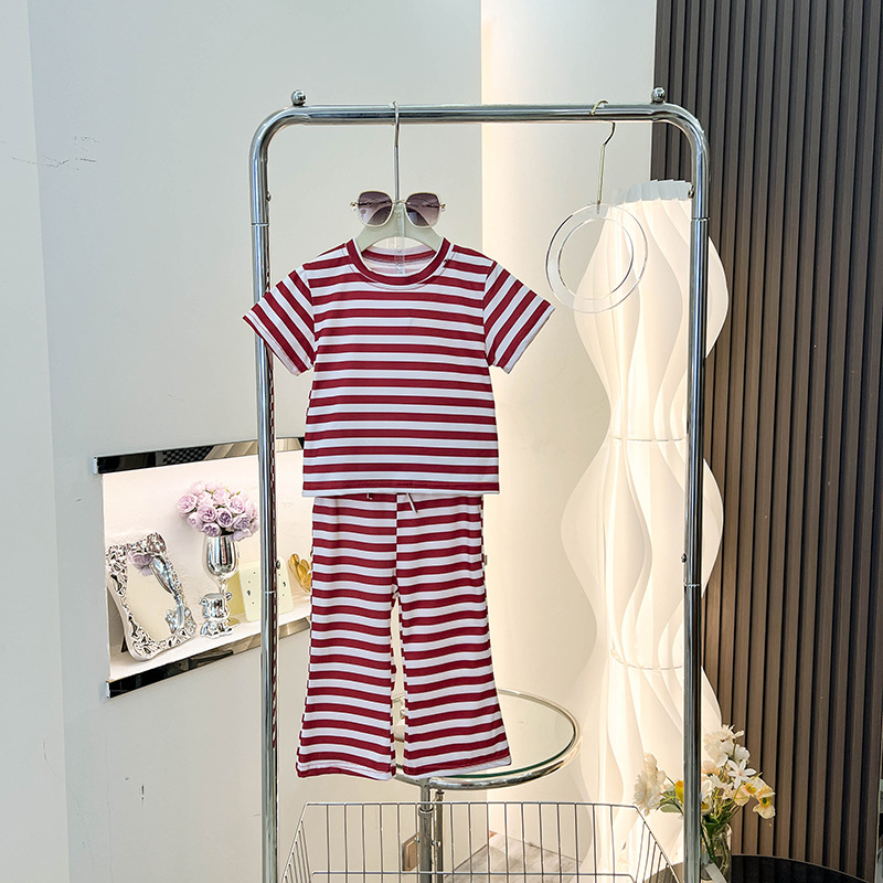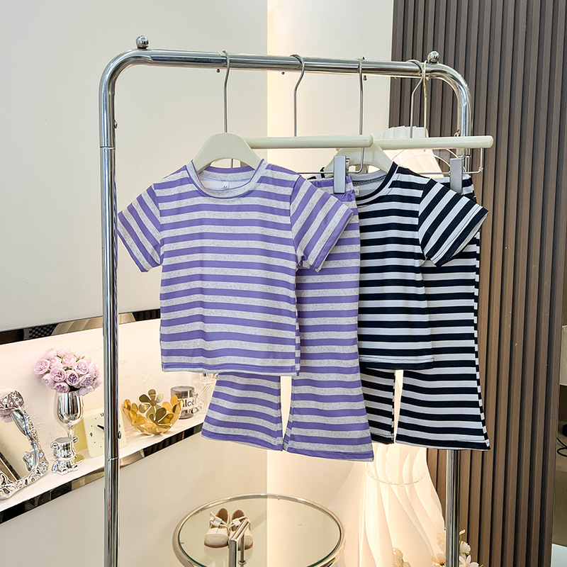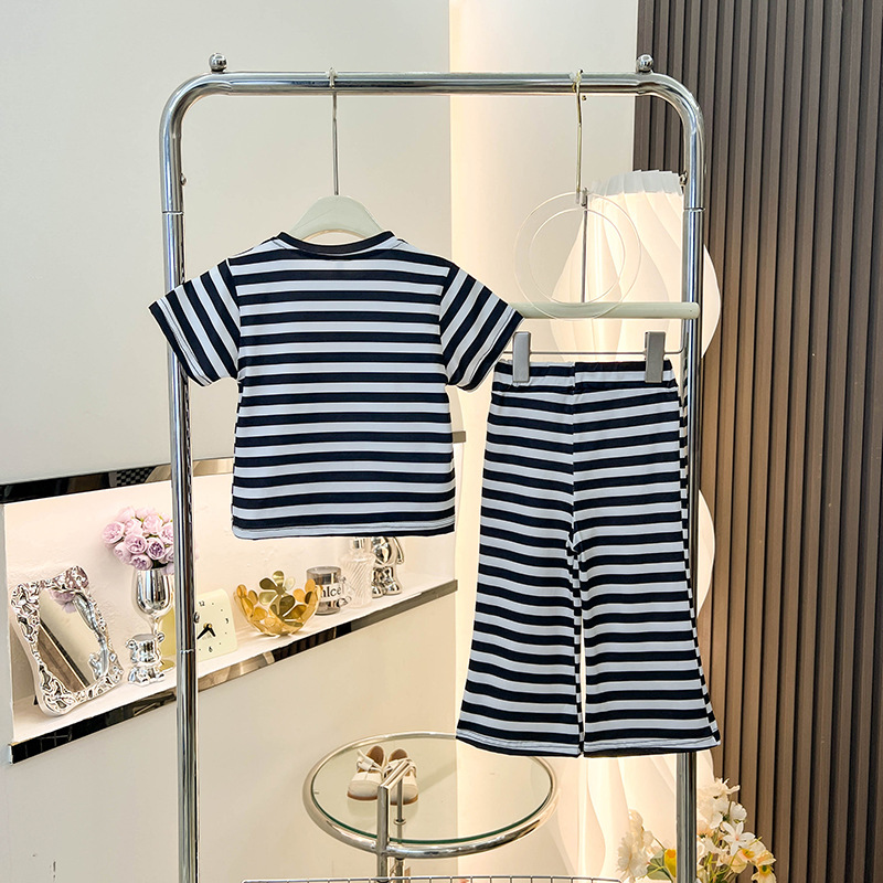 여아 반팔 티셔츠 신작 여름옷, 중소형 아동복 상의, 스트라이프 슈트, 나팔바지 투피스 세트, 트렌디스토어 가기