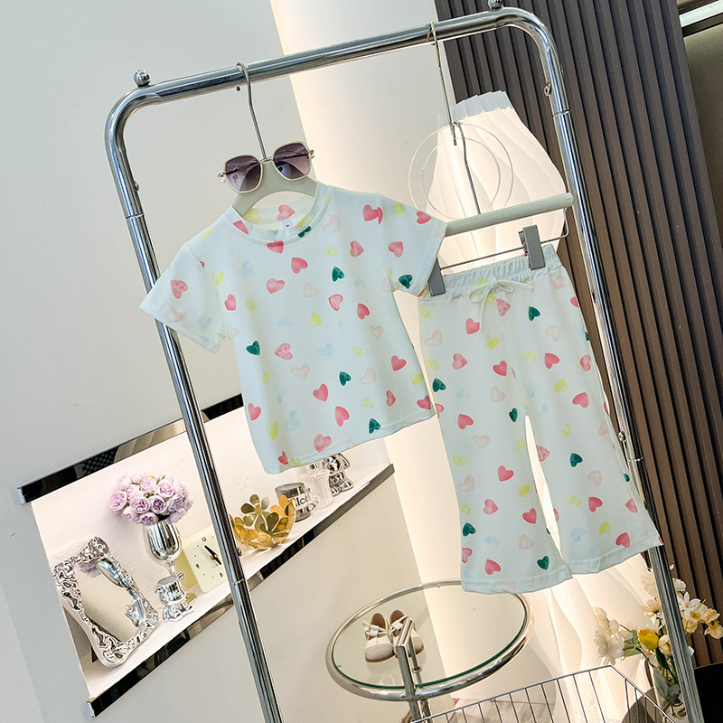 여아 반팔 티셔츠 신작 여름옷, 중소형 아동복 상의, 스트라이프 슈트, 나팔바지 투피스 세트, 트렌디