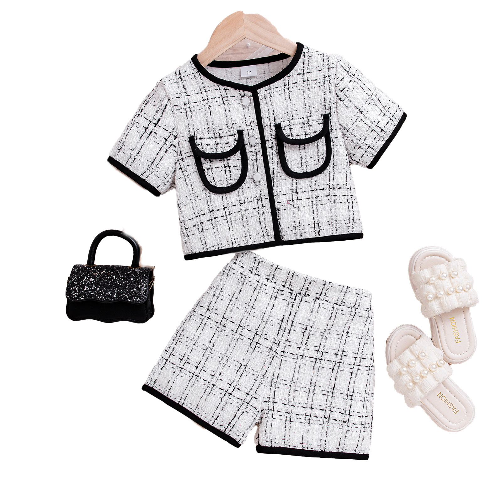 2025 국경을 넘나 드는 유럽과 미국 여름 새로운 스타일의 소녀들이 중소형 어린이 승무원 목 짧은 소매 반바지 투피스 세트를 세트.스토어 가기
