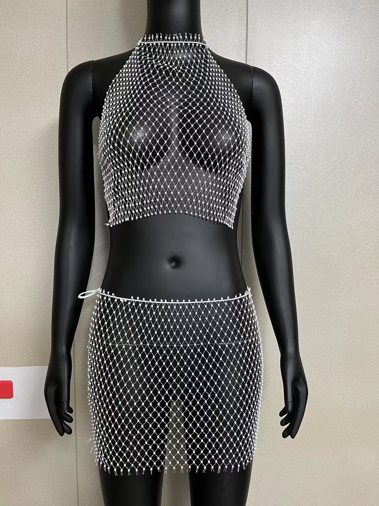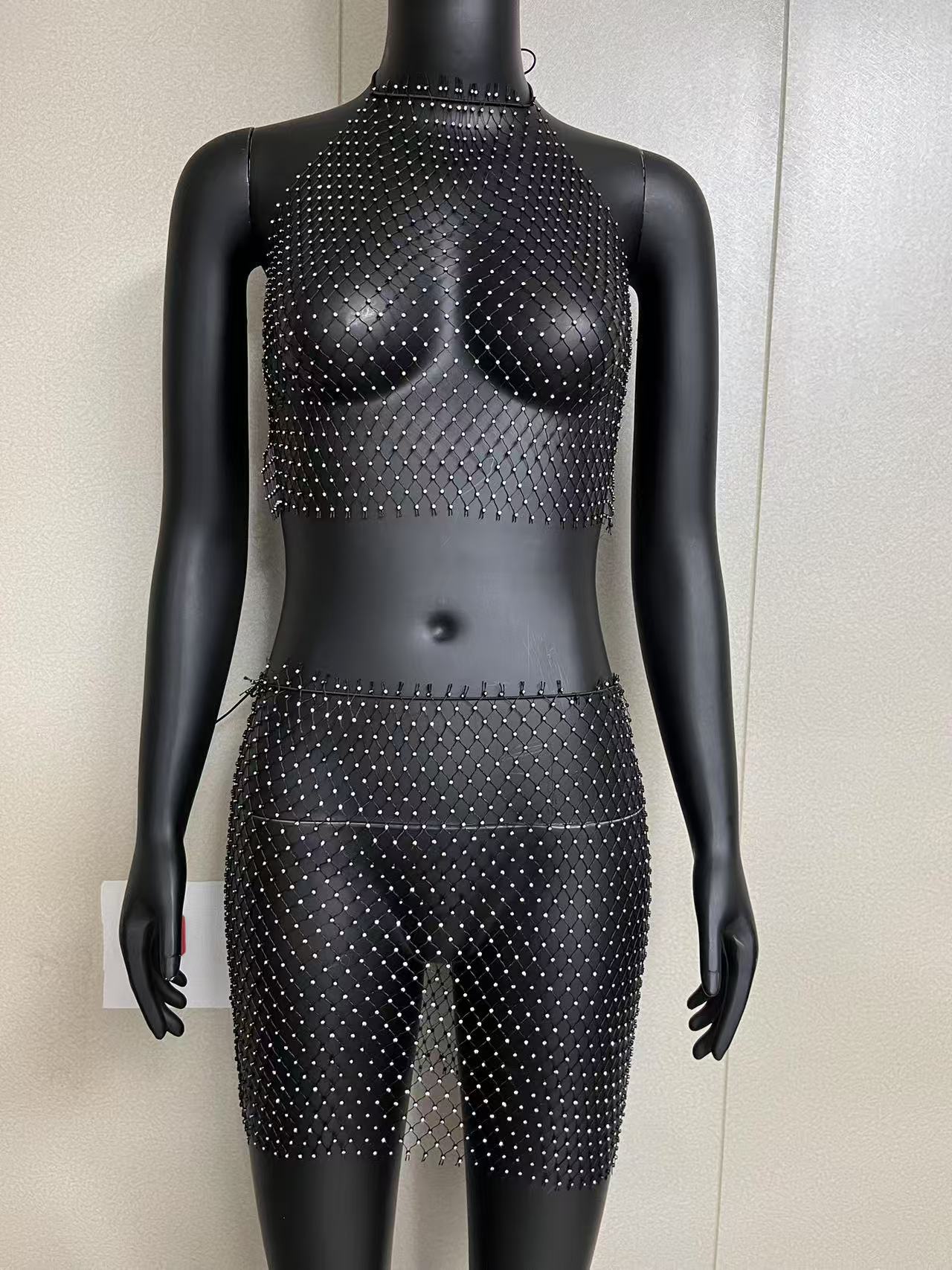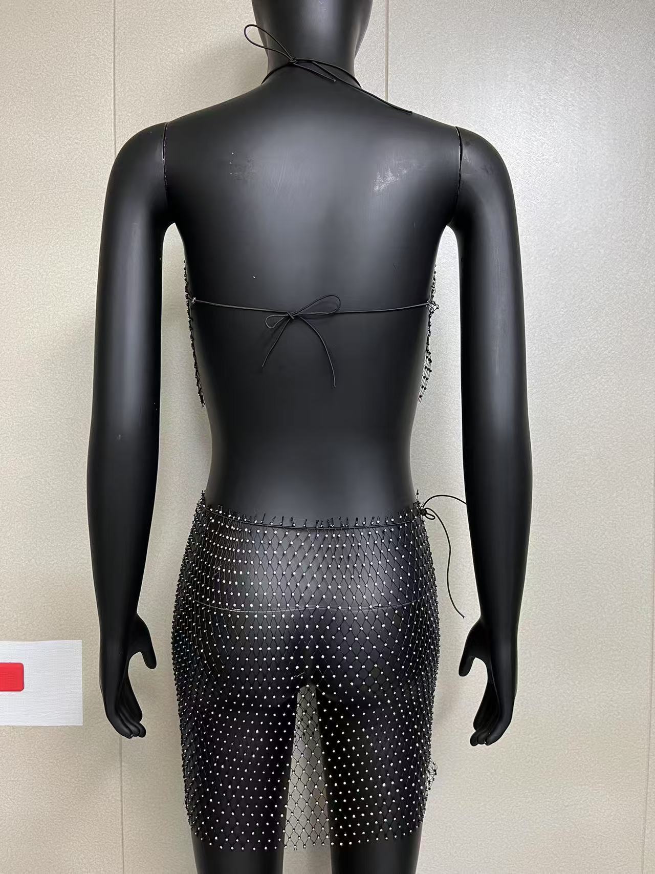 2025 유럽과 미국의 국경 간 아마존 라인스톤 망사 조끼 반짝이는 다이아몬드 메쉬 스커트 핫 소녀 정장 비치 스커트