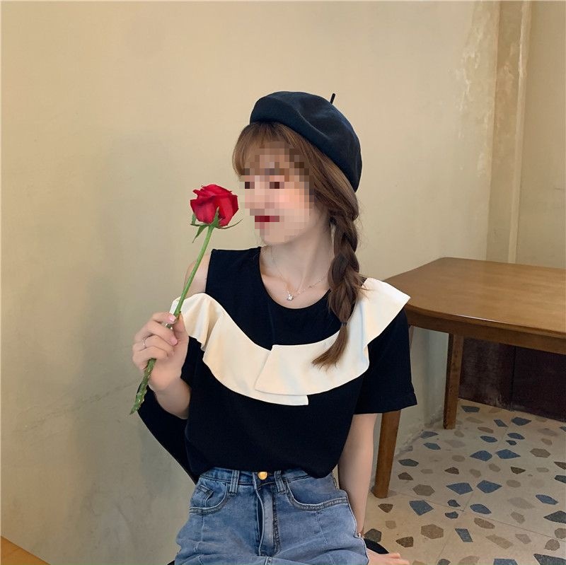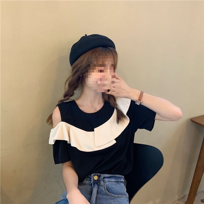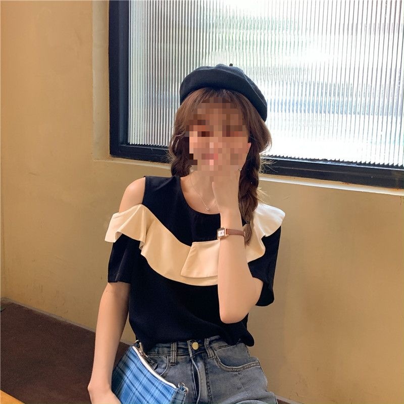 여름 여성을 위한 러플 오프숄더 반팔 셔츠 탑 새로운 스타일 프렌치 블랙 스플라이스 쉬폰 셔츠스토어 가기