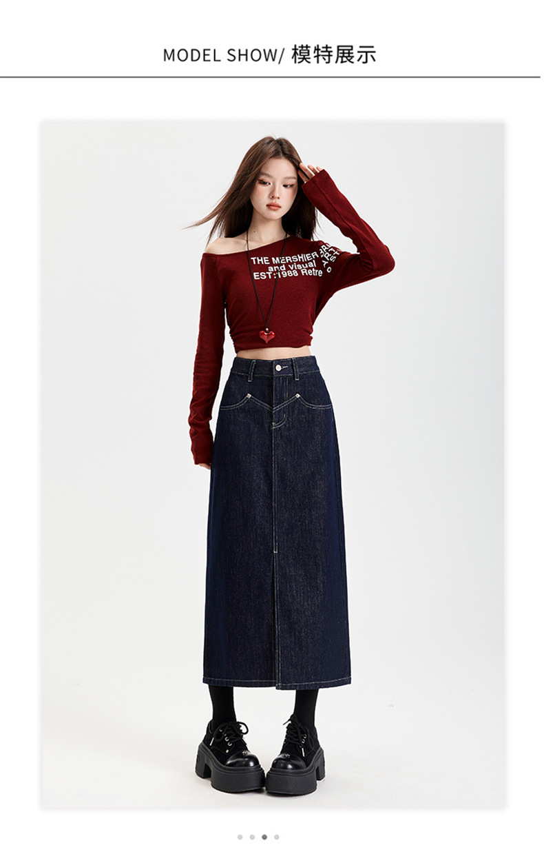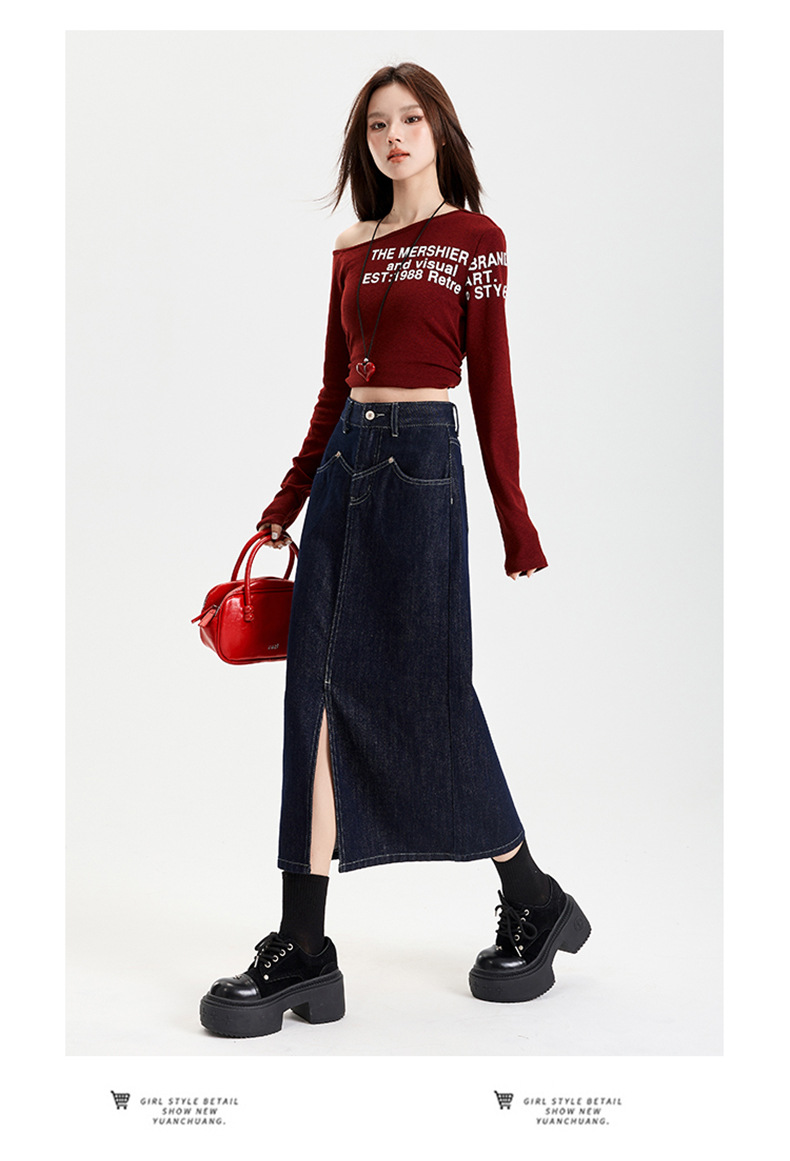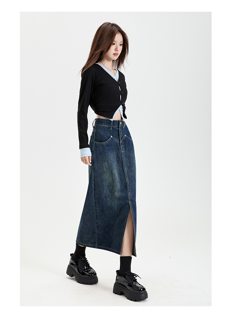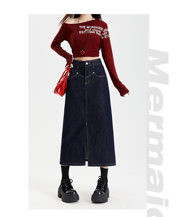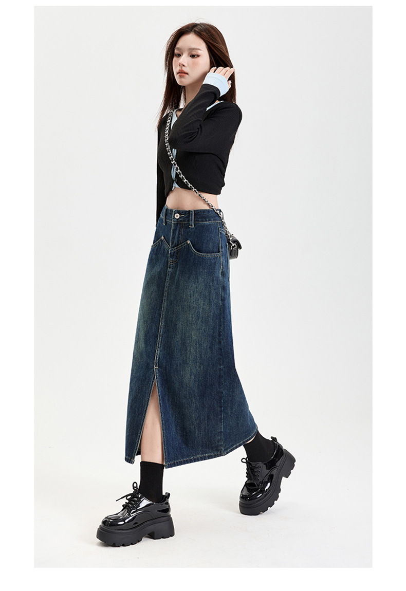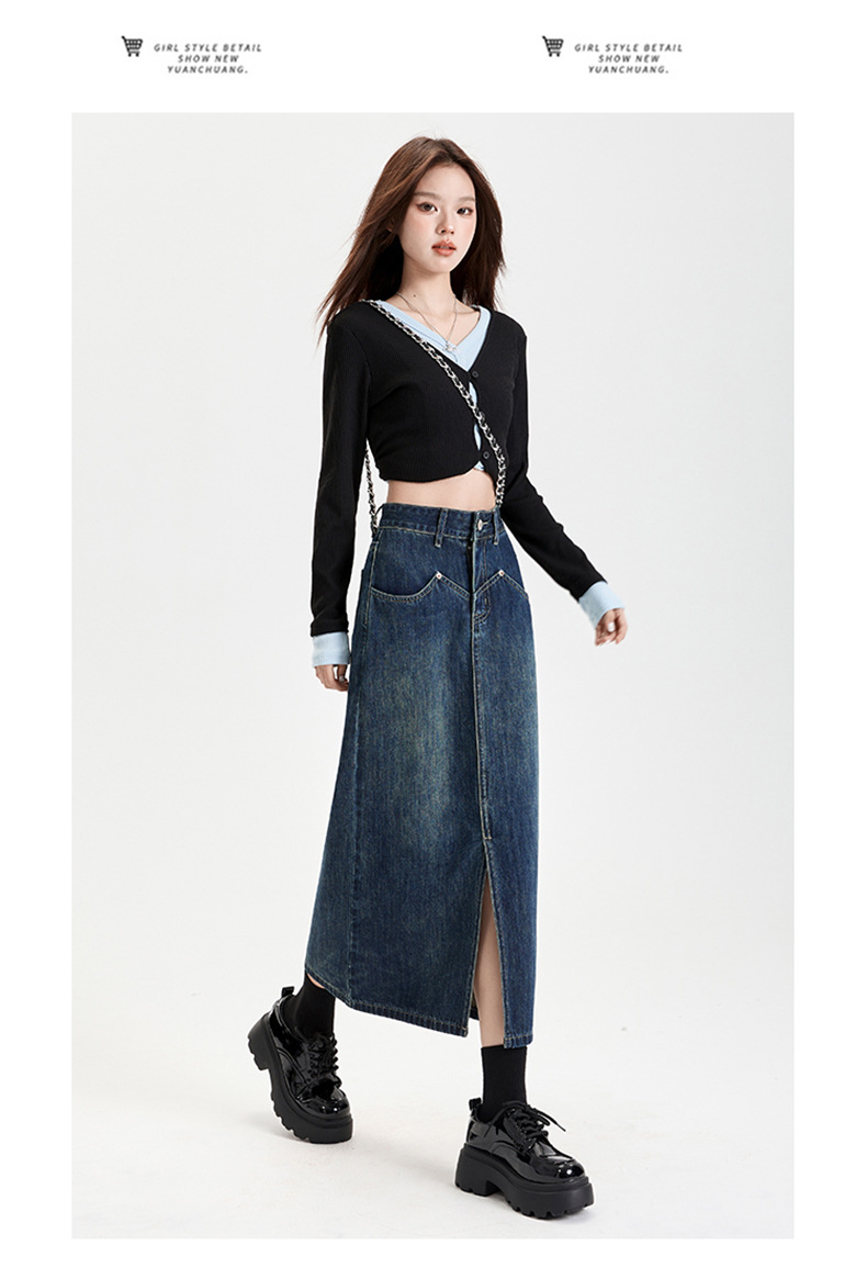 여성용 데님 블루 하이 웨이스트 데님 스커트 2025 봄, 가을 새로운 스타일 슬릿 중간 길이 슬리밍 힙 스커트 스판덱스스토어 가기