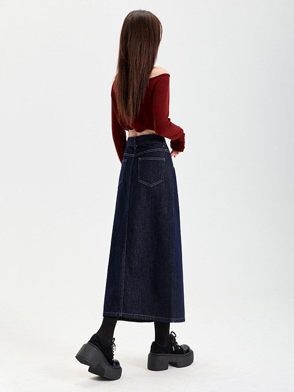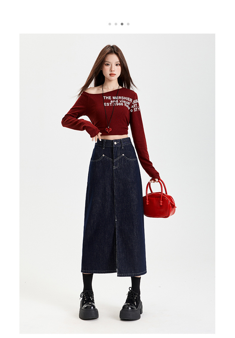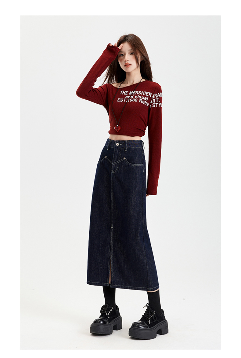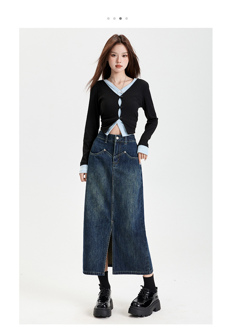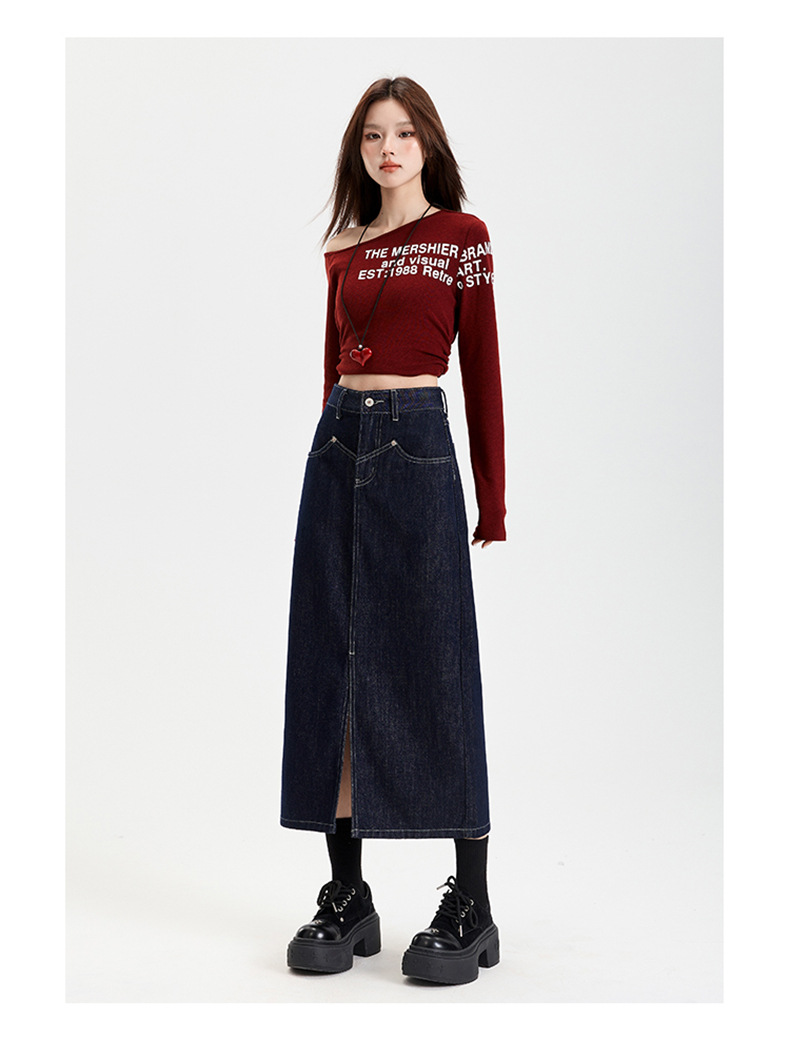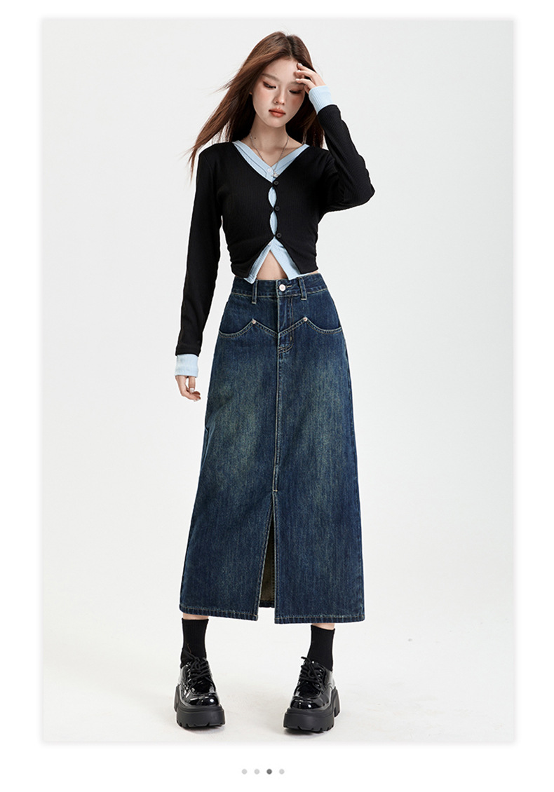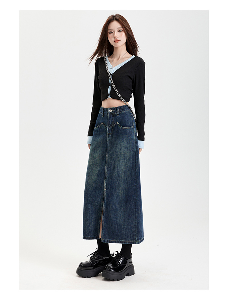 여성용 데님 블루 하이 웨이스트 데님 스커트 2025 봄, 가을 새로운 스타일 슬릿 중간 길이 슬리밍 힙 스커트 스판덱스스토어 가기