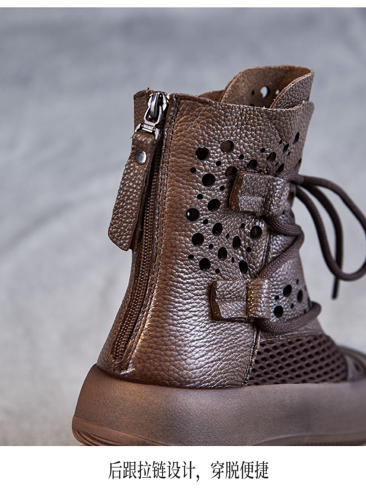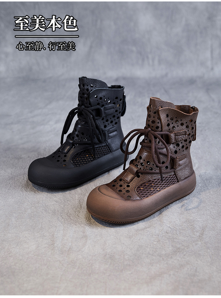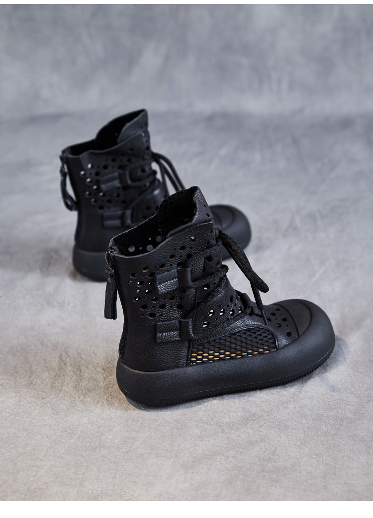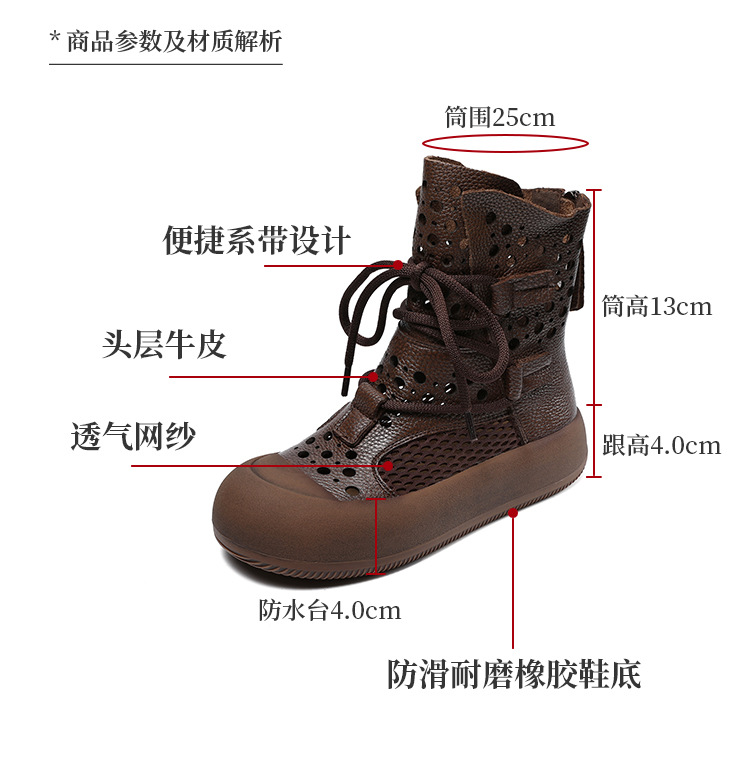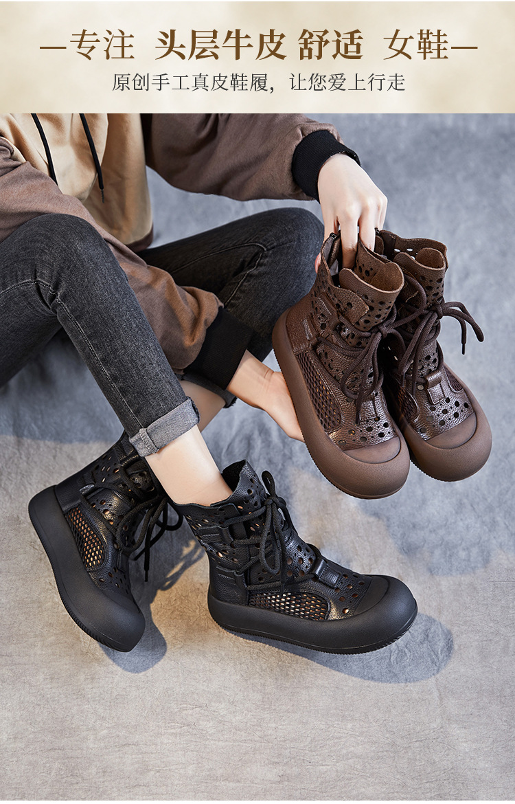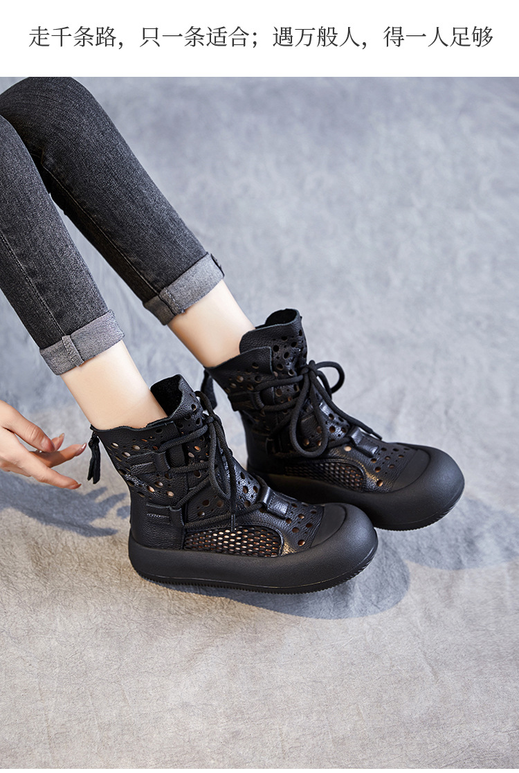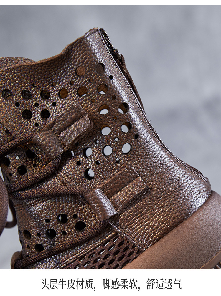 정품 가죽 중공 마틴 부츠 여성 2025 년 새로운 여름 얇은 통기성 메쉬 샌들 외부가 여름을위한 하이 탑 발목 부츠