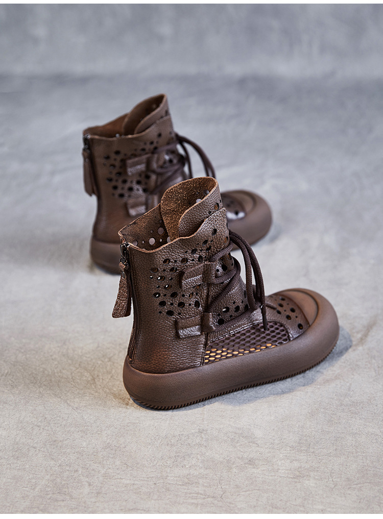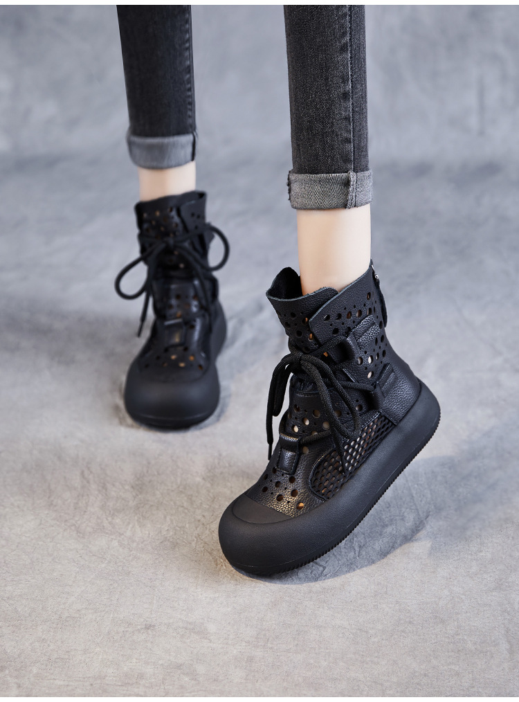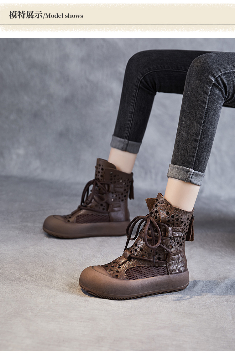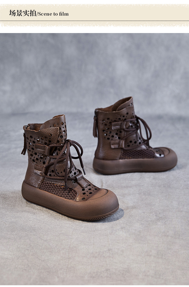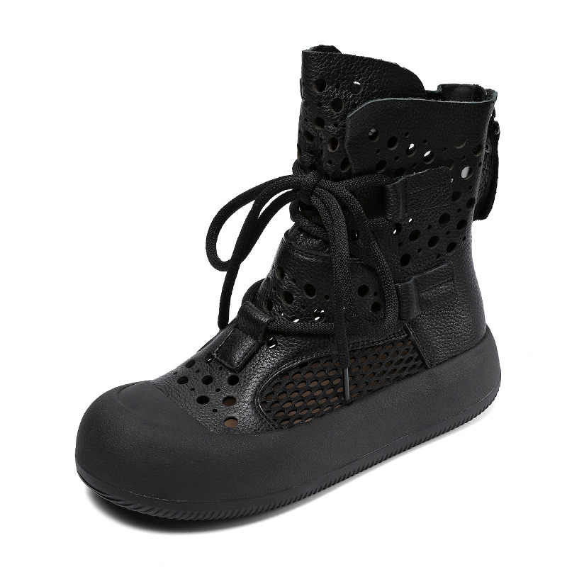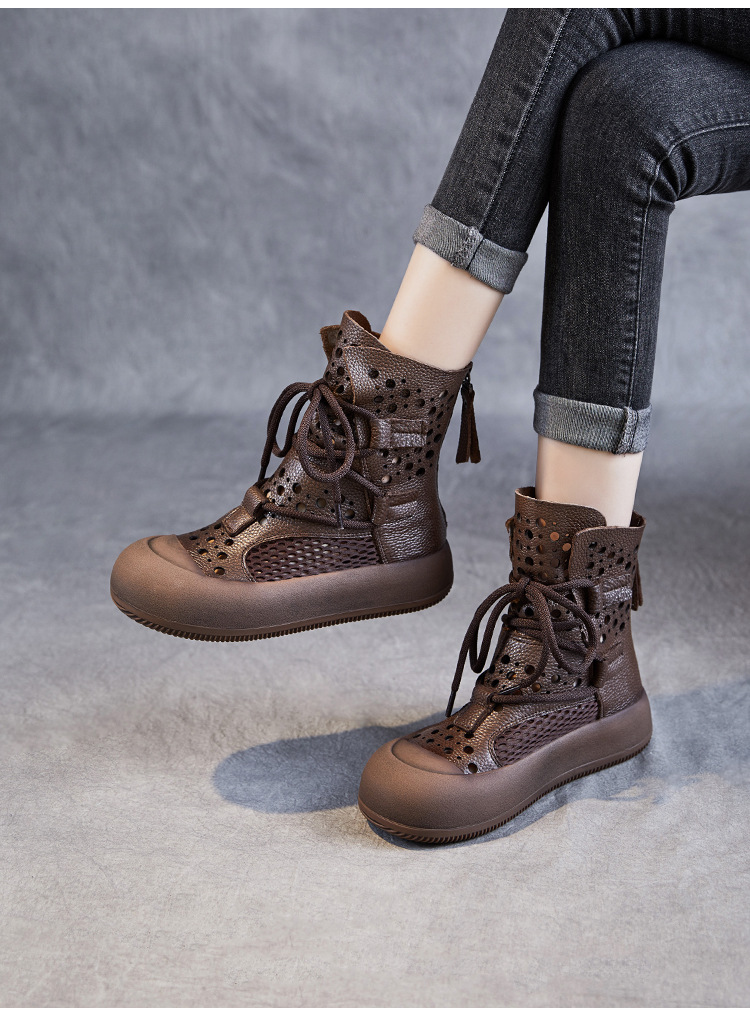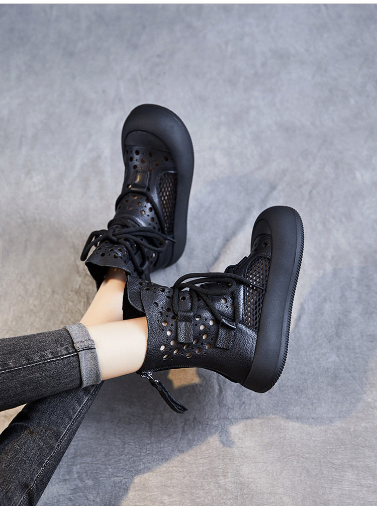 정품 가죽 중공 마틴 부츠 여성 2025 년 새로운 여름 얇은 통기성 메쉬 샌들 외부가 여름을위한 하이 탑 발목 부츠