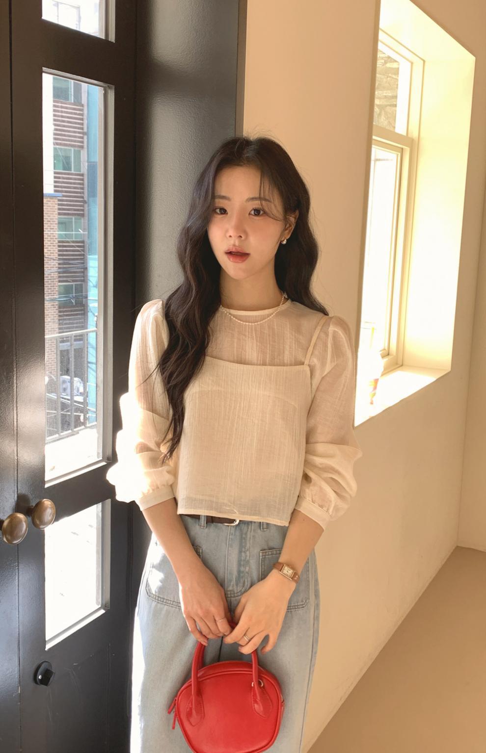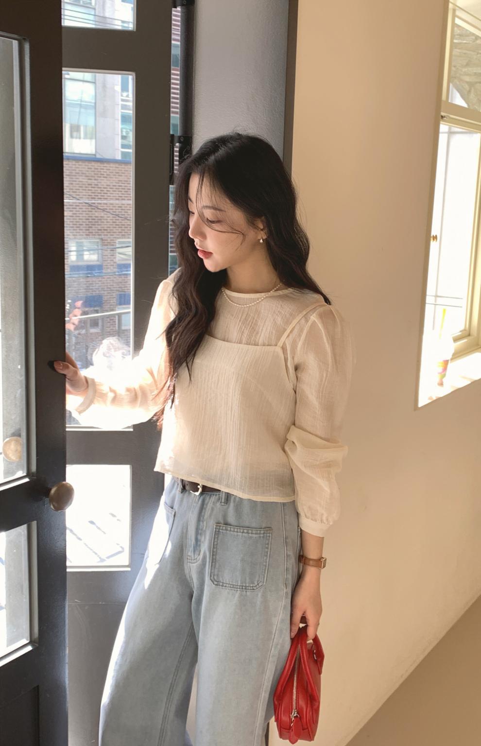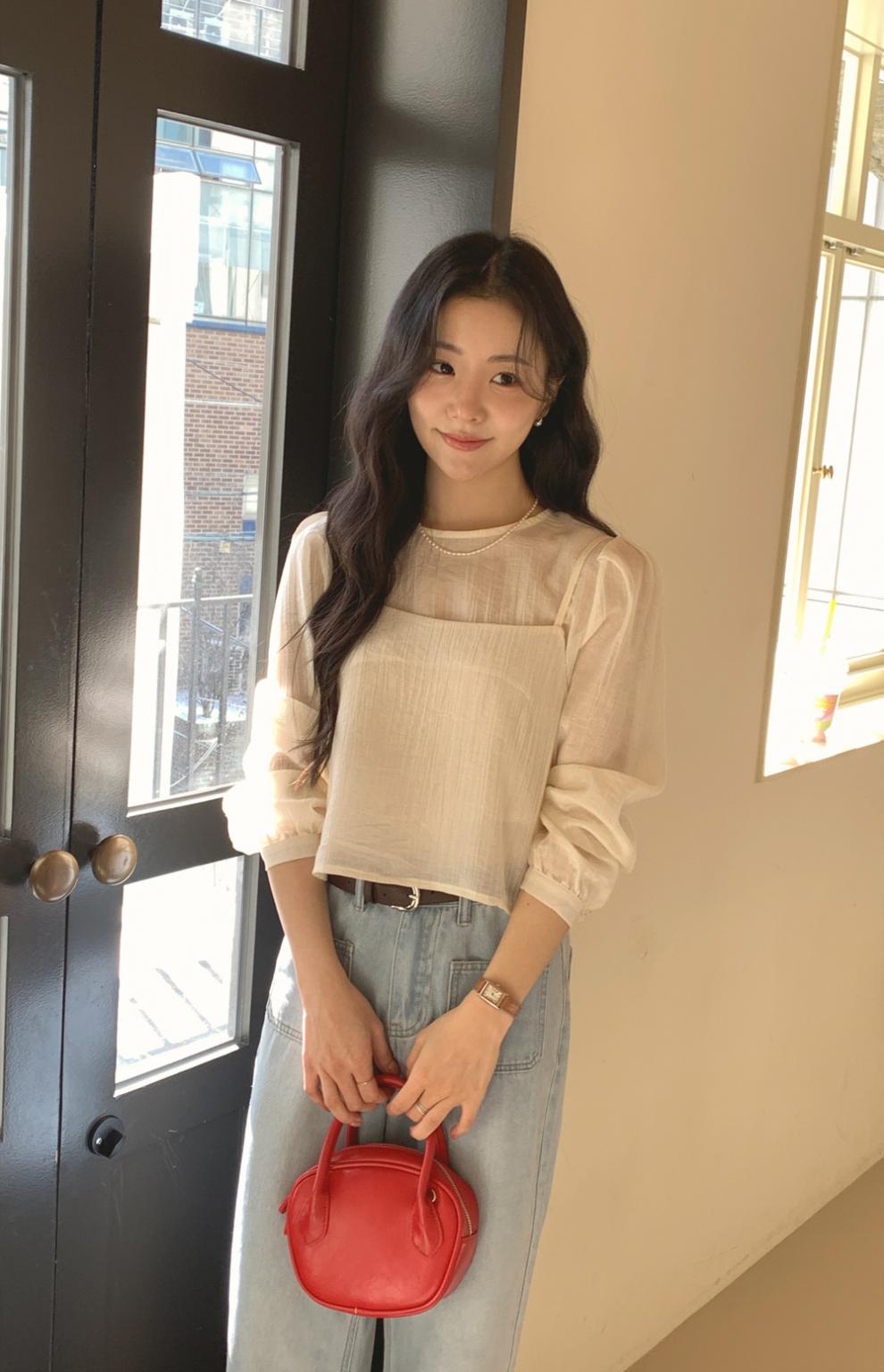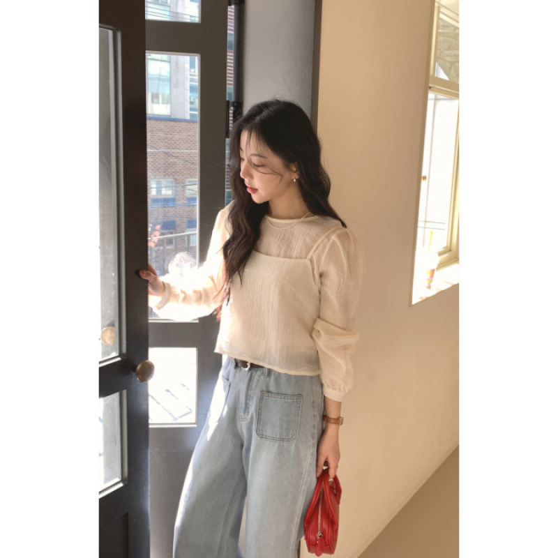 한국 chic2025 봄 신상품 프렌치 니치 시스루 셔츠 캐미솔 긴팔 셔츠 여성용 투피스 세트스토어 가기