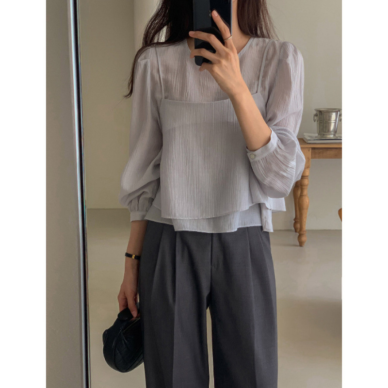 한국 chic2025 봄 신상품 프렌치 니치 시스루 셔츠 캐미솔 긴팔 셔츠 여성용 투피스 세트