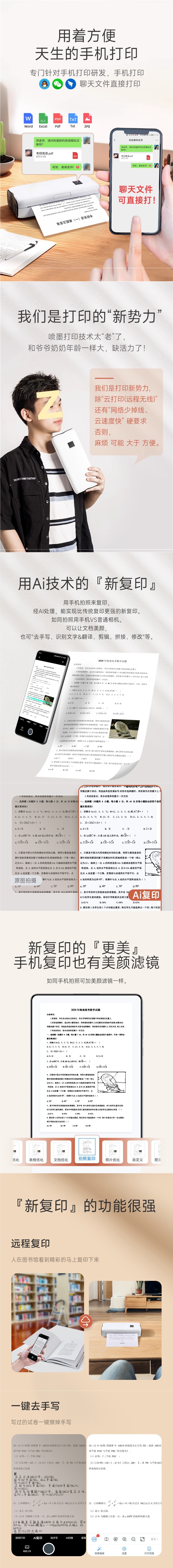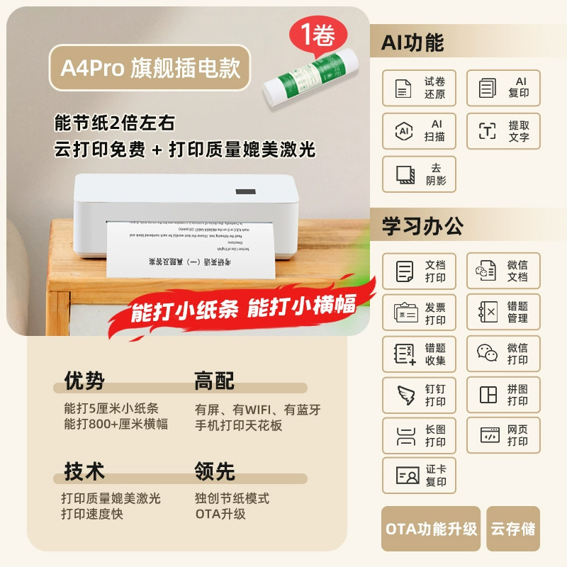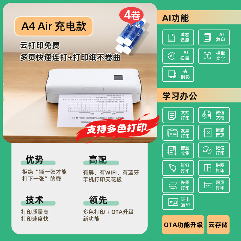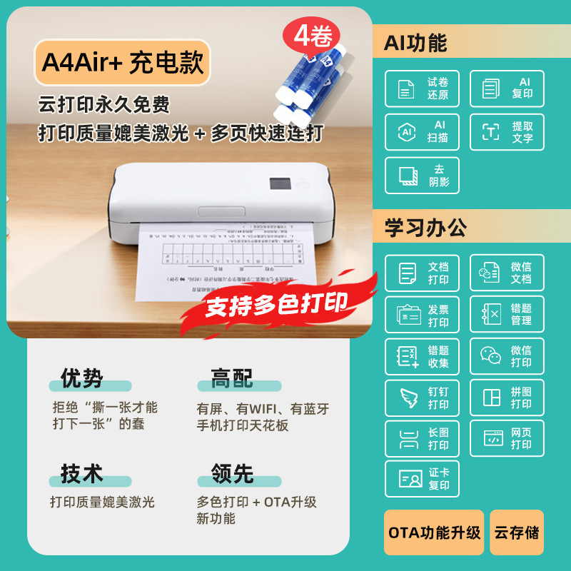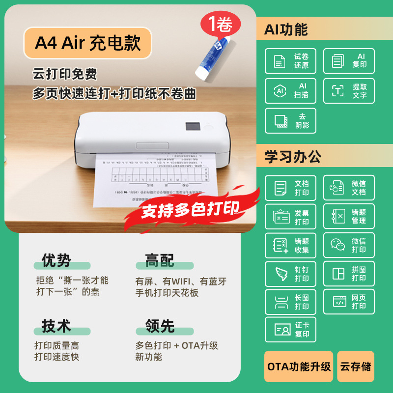 잉크 프리 조작 프린터 A4 가정용 소형 휴대 전화 블루투스 무선 잘못된 시험 용지 학생 기숙사 가족스토어 가기