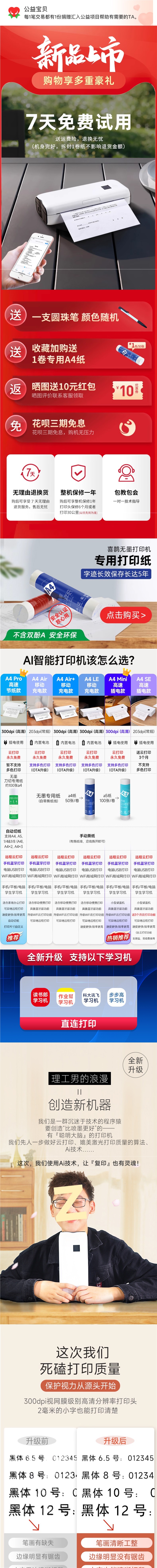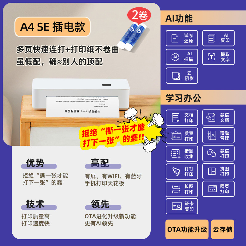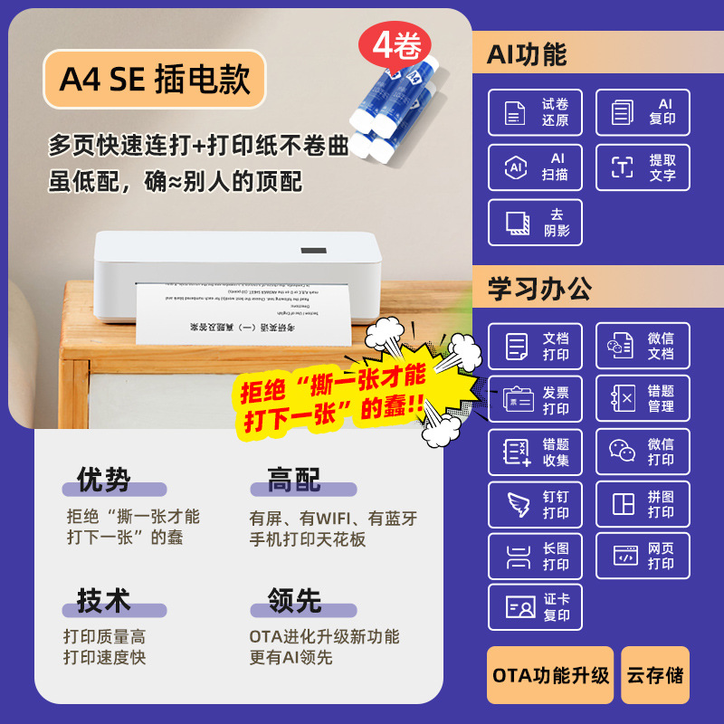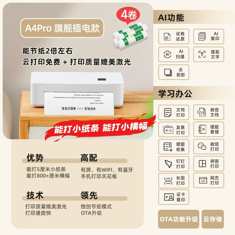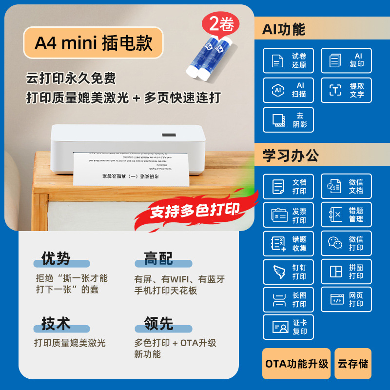 잉크 프리 조작 프린터 A4 가정용 소형 휴대 전화 블루투스 무선 잘못된 시험 용지 학생 기숙사 가족스토어 가기