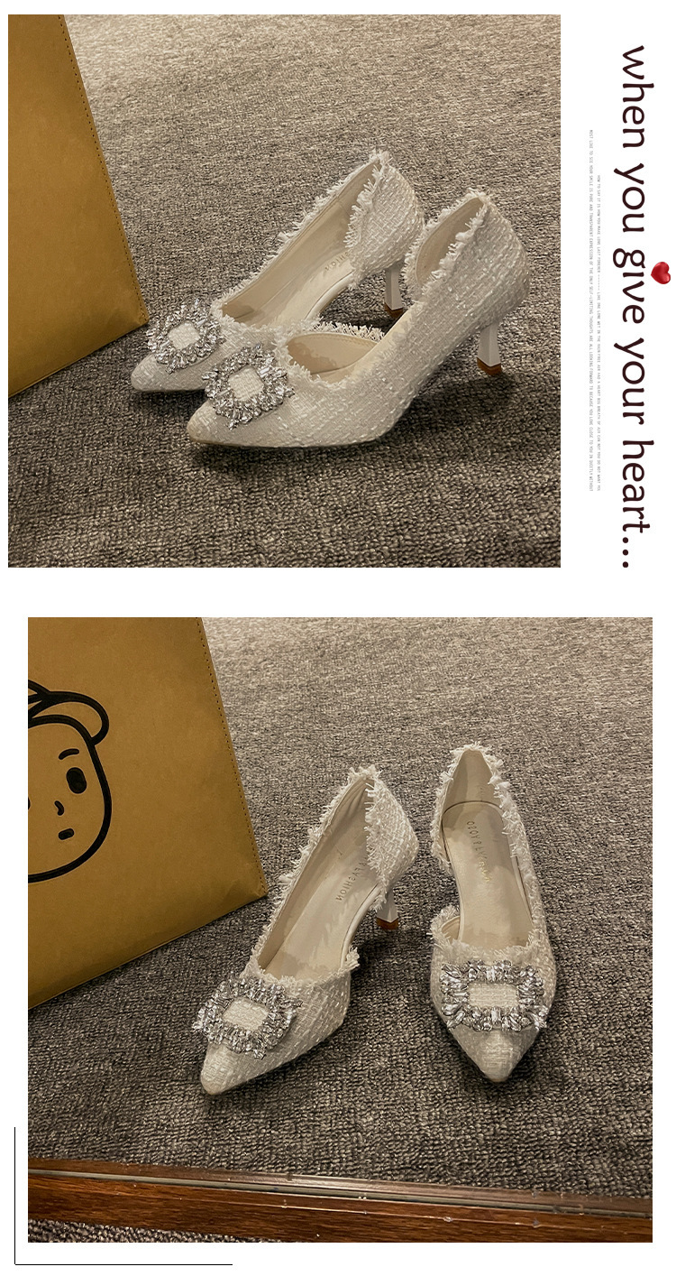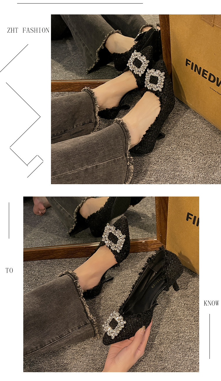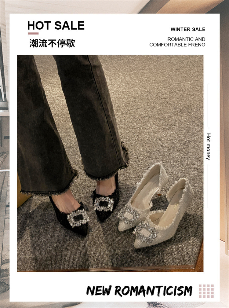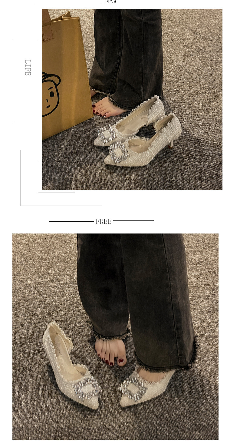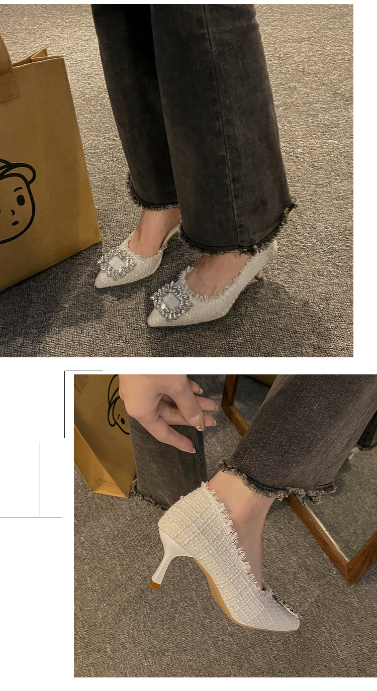 여성용 하이힐 2025 여름 새로운 틈새 디자인 프렌치 포인티드 슈즈 스틸레토 힐 작은 향기로운 모조 다이아몬드 슈즈스토어 가기