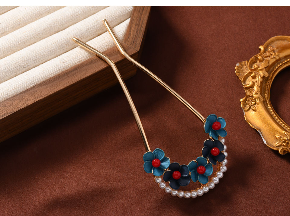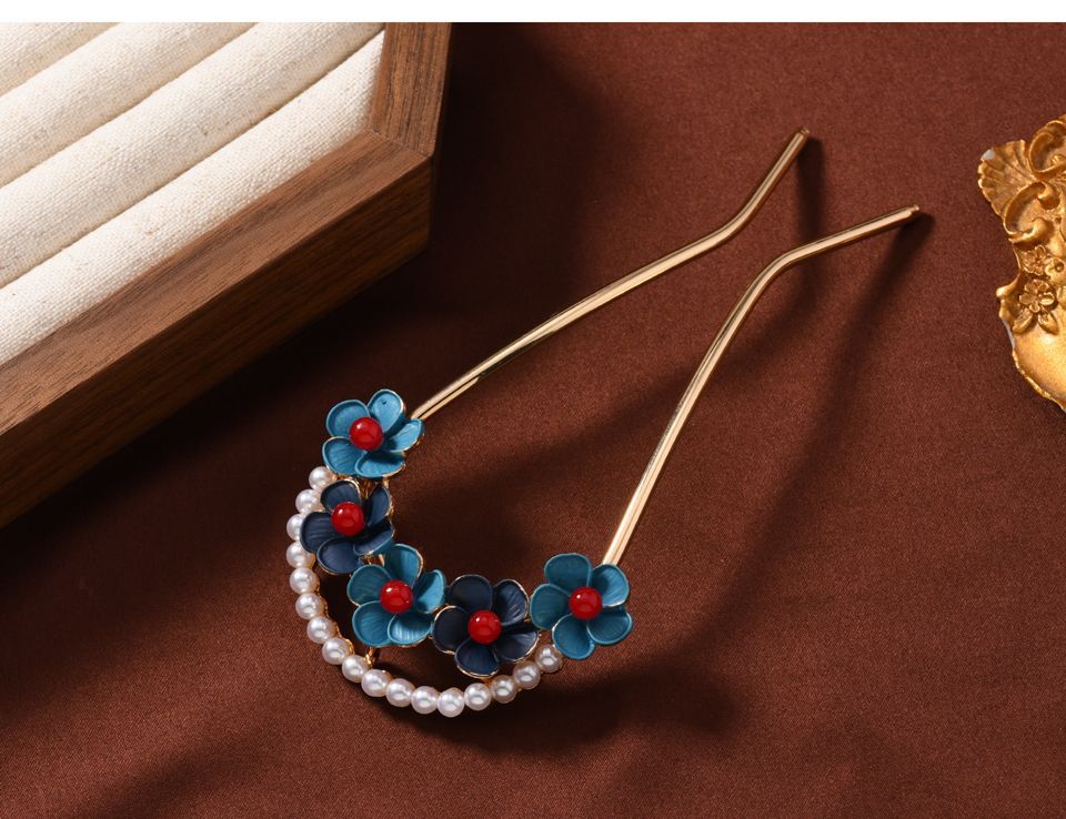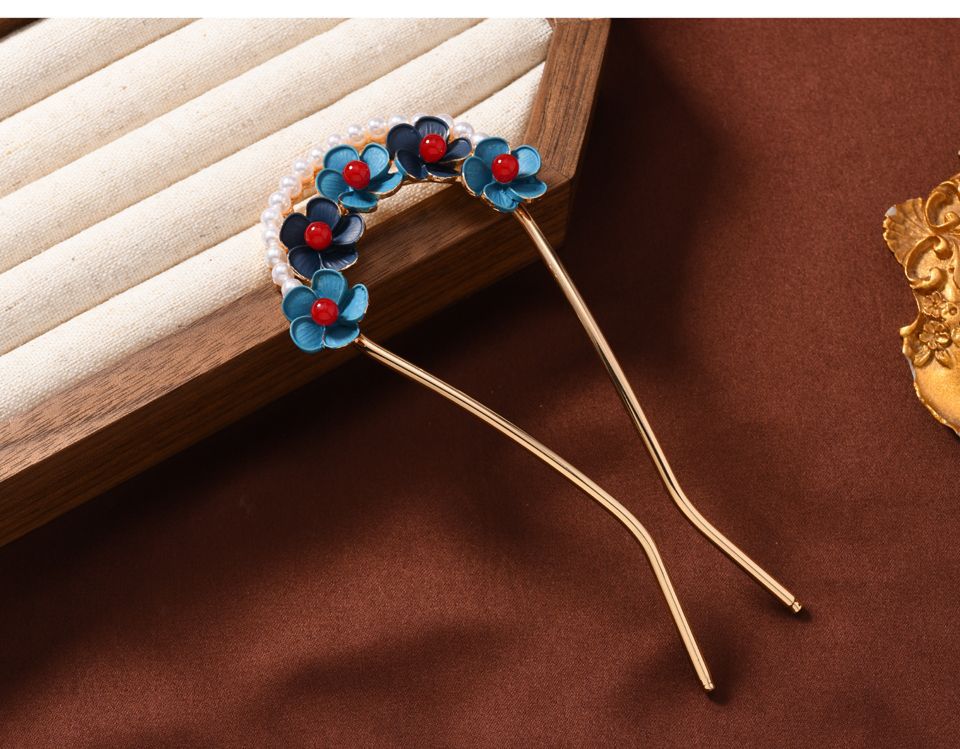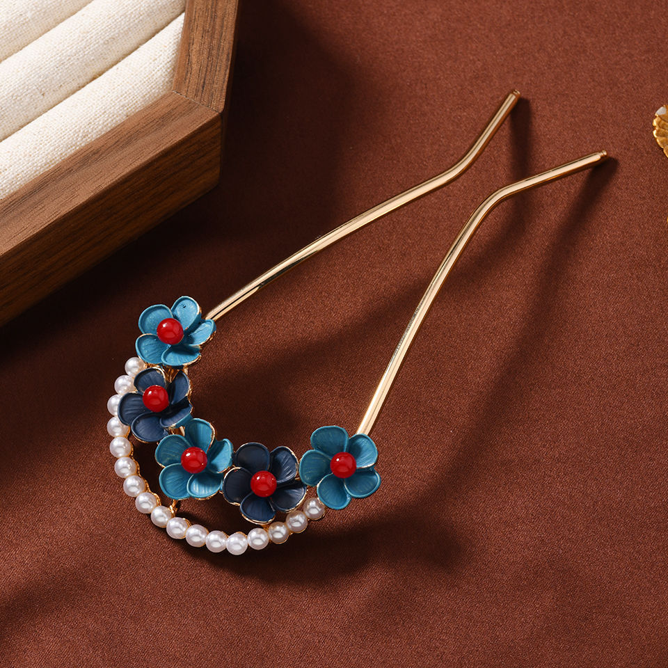 중국 스타일 모조 파란색 꽃 큰 U 머리핀 작은 진주 부서진 꽃 볼 머리 다목적 Hanfu 머리핀스토어 가기