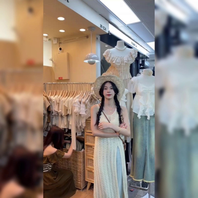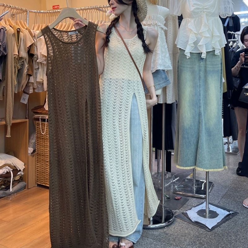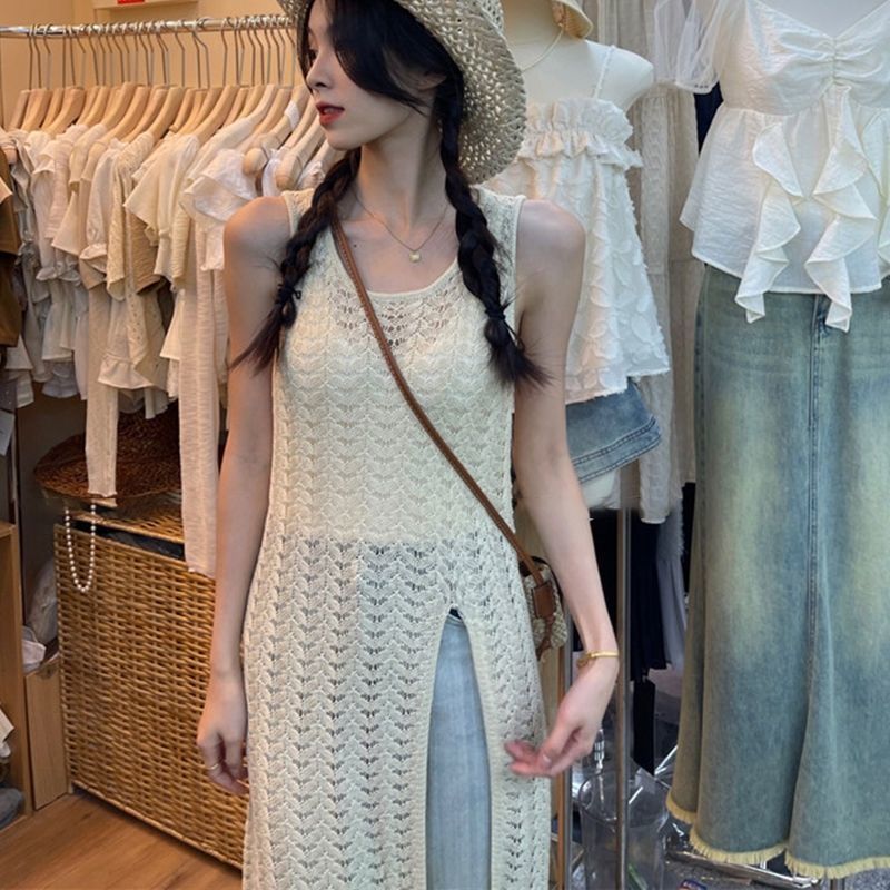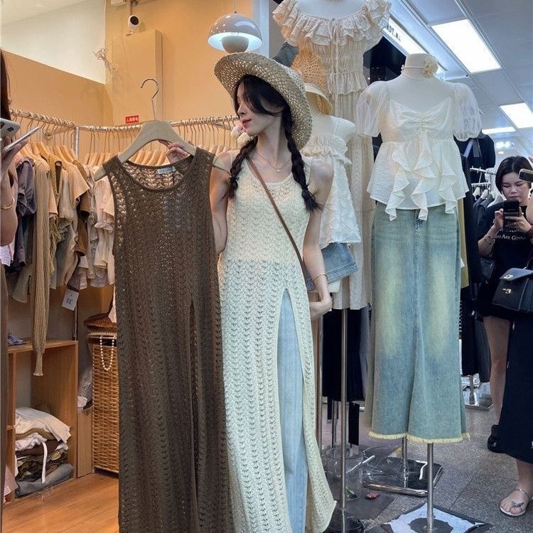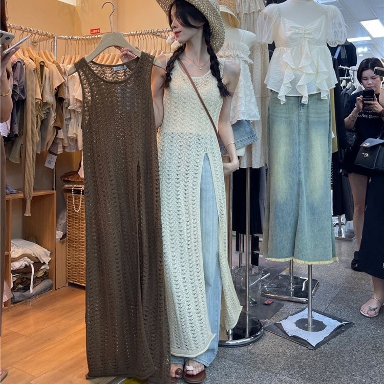 2025 새로운 여름 디자인 리조트 스타일 니트 무릎 위 스커트 여성용 중공 긴 슬릿 조끼 드레스스토어 가기