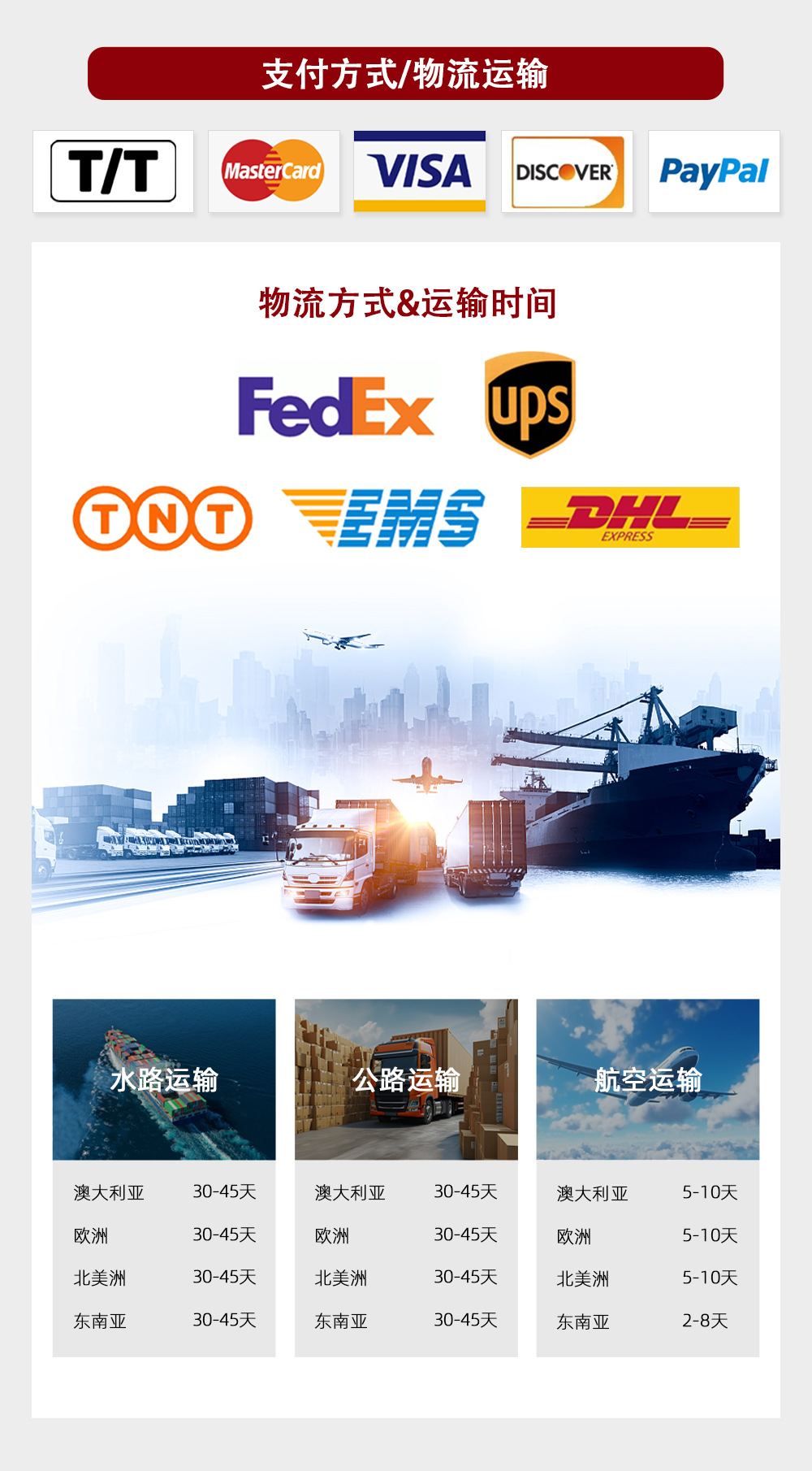我们接受多种付款方式,包括银行转账、信用卡和PayPal等。具体支付细节将在订单确认时提供。