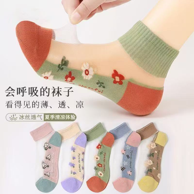 카시 꽃 레이스 양말 폴리 에스터 코튼 여성 여름 얇은 유리 실크 크리스탈 보트 양말 통기성 땀 흡수 양말 와이드스토어 가기