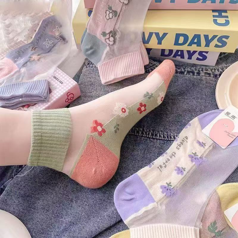 카시 꽃 레이스 양말 폴리 에스터 코튼 여성 여름 얇은 유리 실크 크리스탈 보트 양말 통기성 땀 흡수 양말 와이드