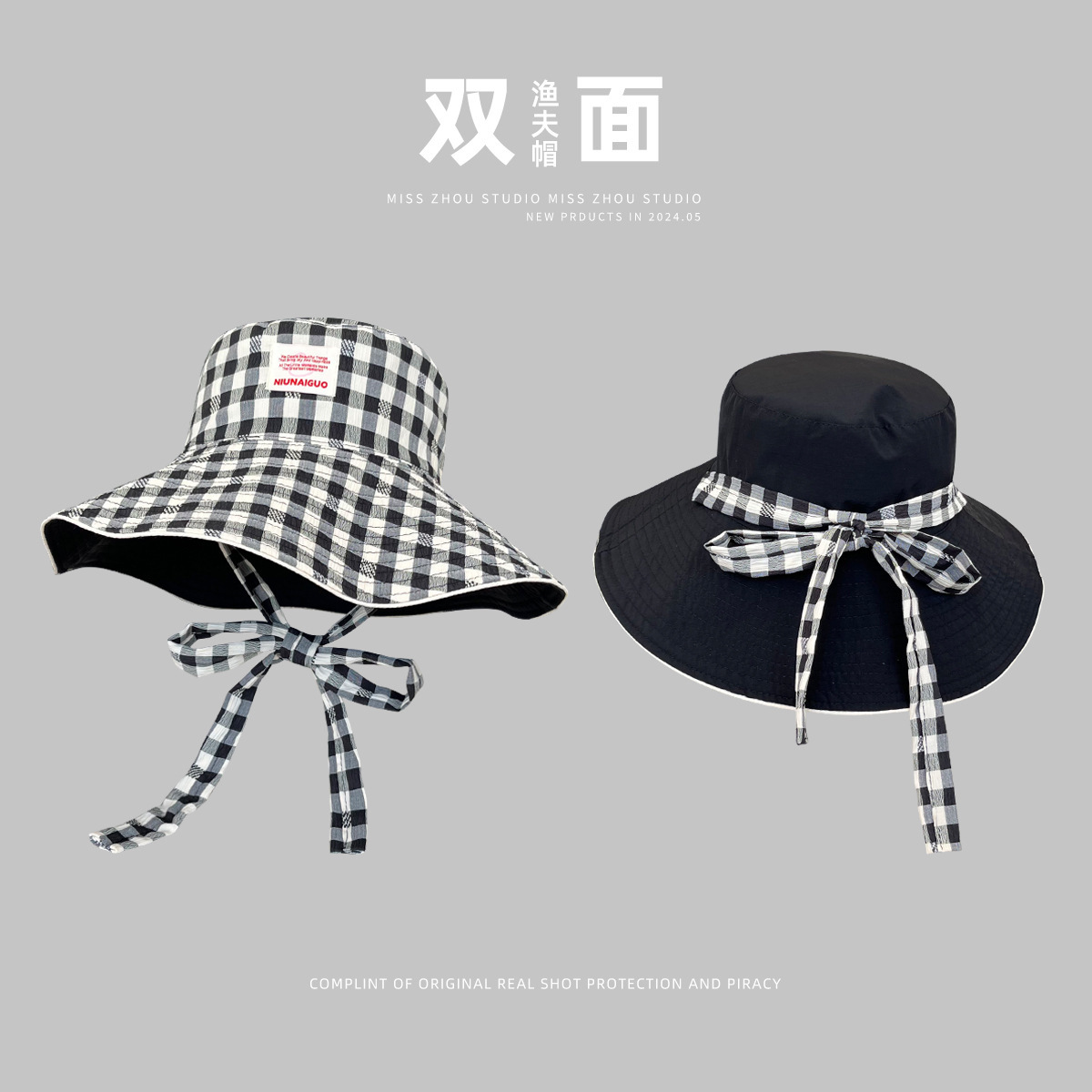 여름 새로운 양면 착용 가능한 격자 무늬 어부 모자 태양 보호 태양 모자 안티 UV 태양 모자 접이식 여성