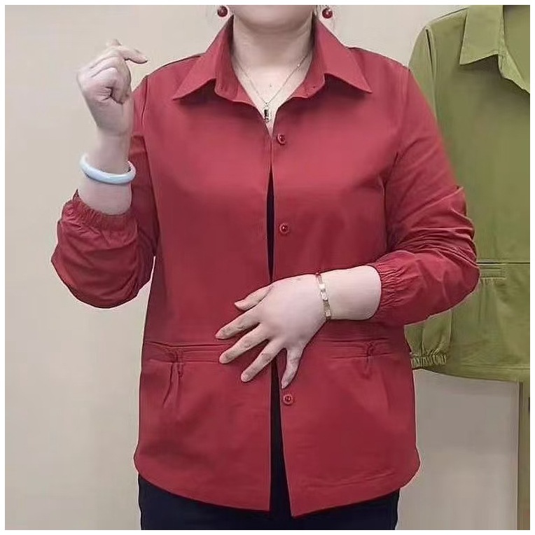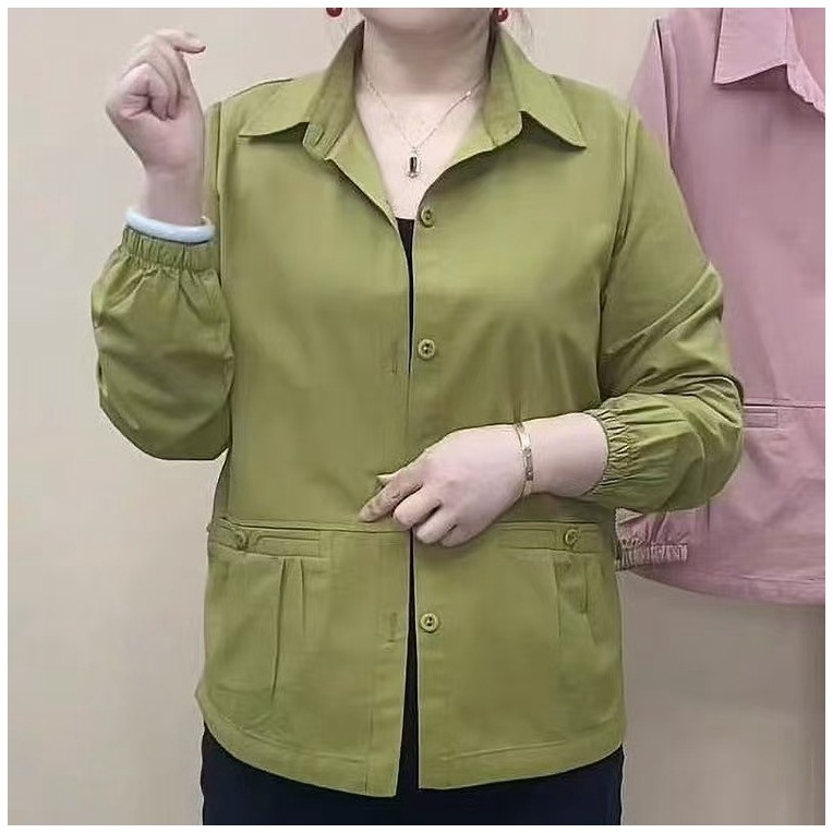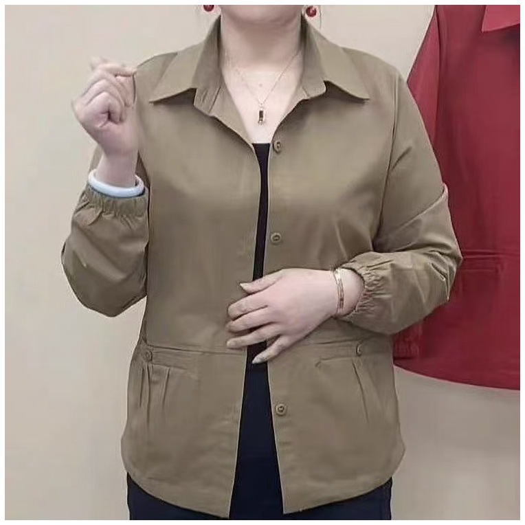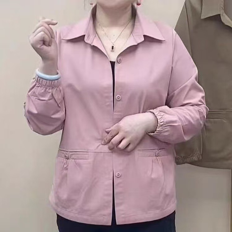 중년 및 노인 어머니 봄 새로운 단색 셔츠 칼라 캐주얼 코트 여성 느슨한 배꼽 플러스 사이즈 재킷 탑