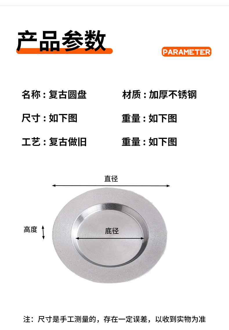 레트로 스테인레스 스틸 파스타 접시, 오래된 스테이크 접시, 호텔 과일 및 야채 접시, 상업용 원형 접시, 맞춤형 로고