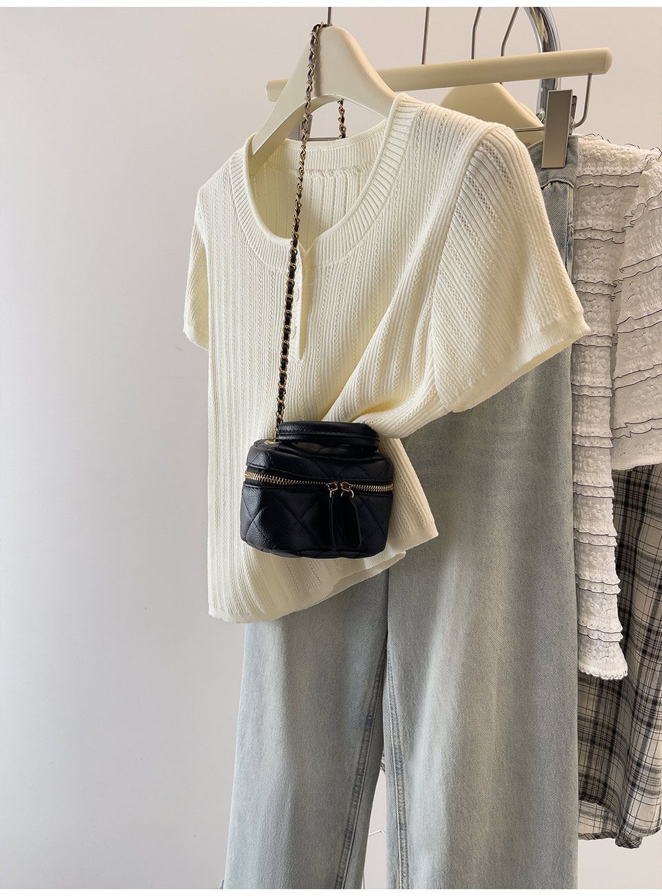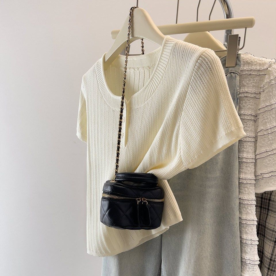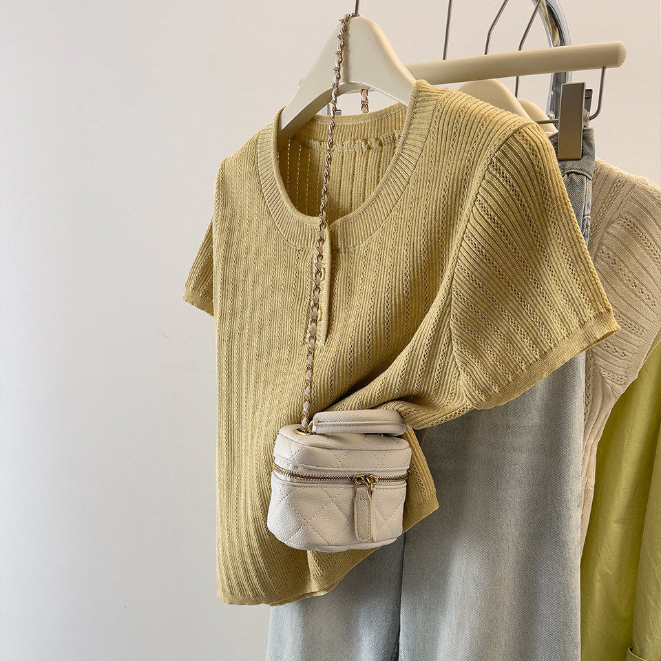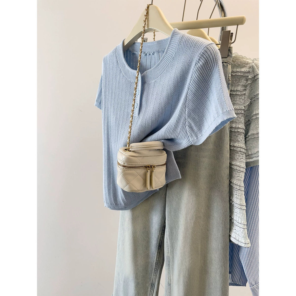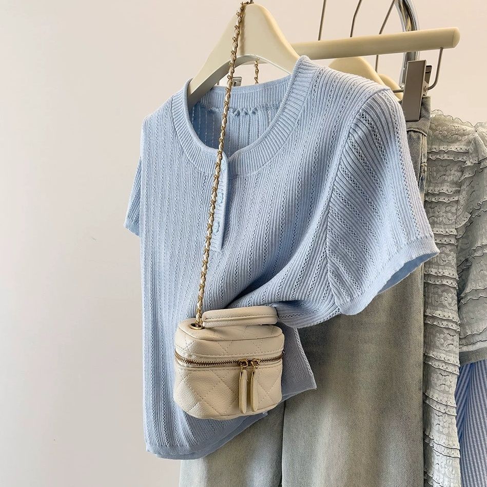 얇은 어깨 반팔 티셔츠 여자 2025 년 여름 새로운 아이스 실크 니트 스웨터 루즈 슬리밍 올 매치 쇼트 탑