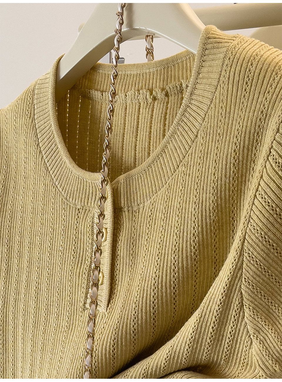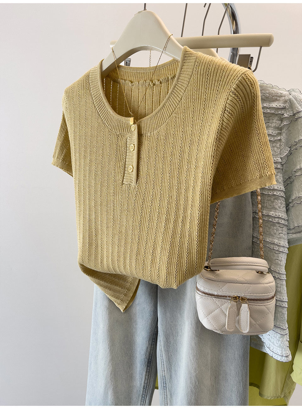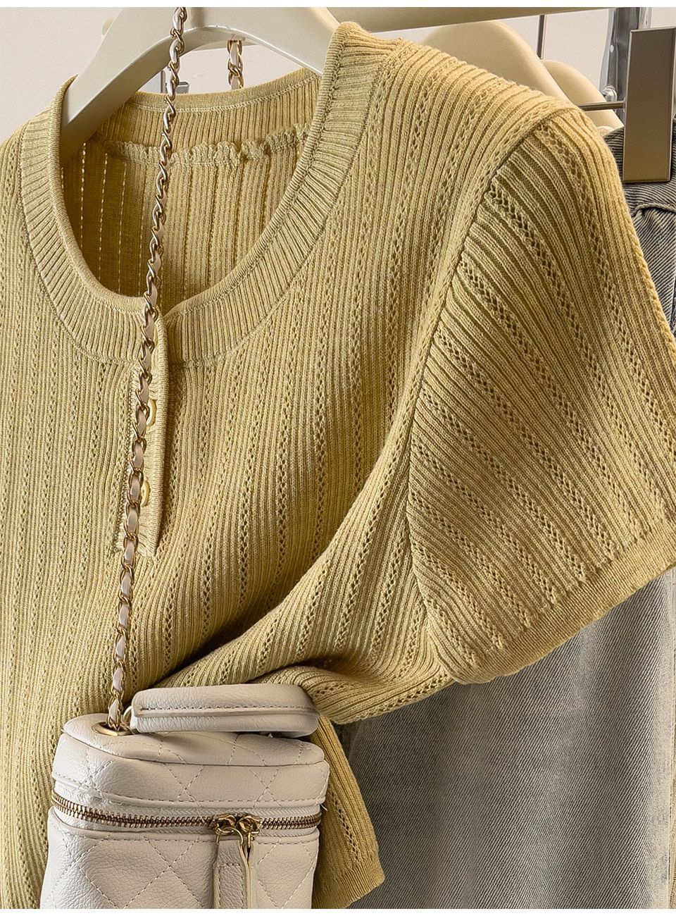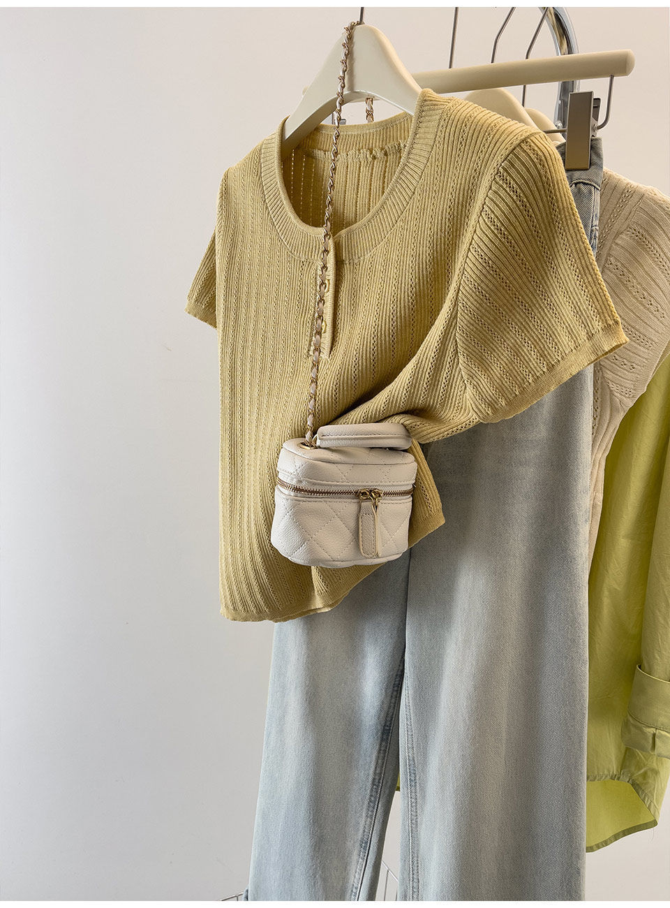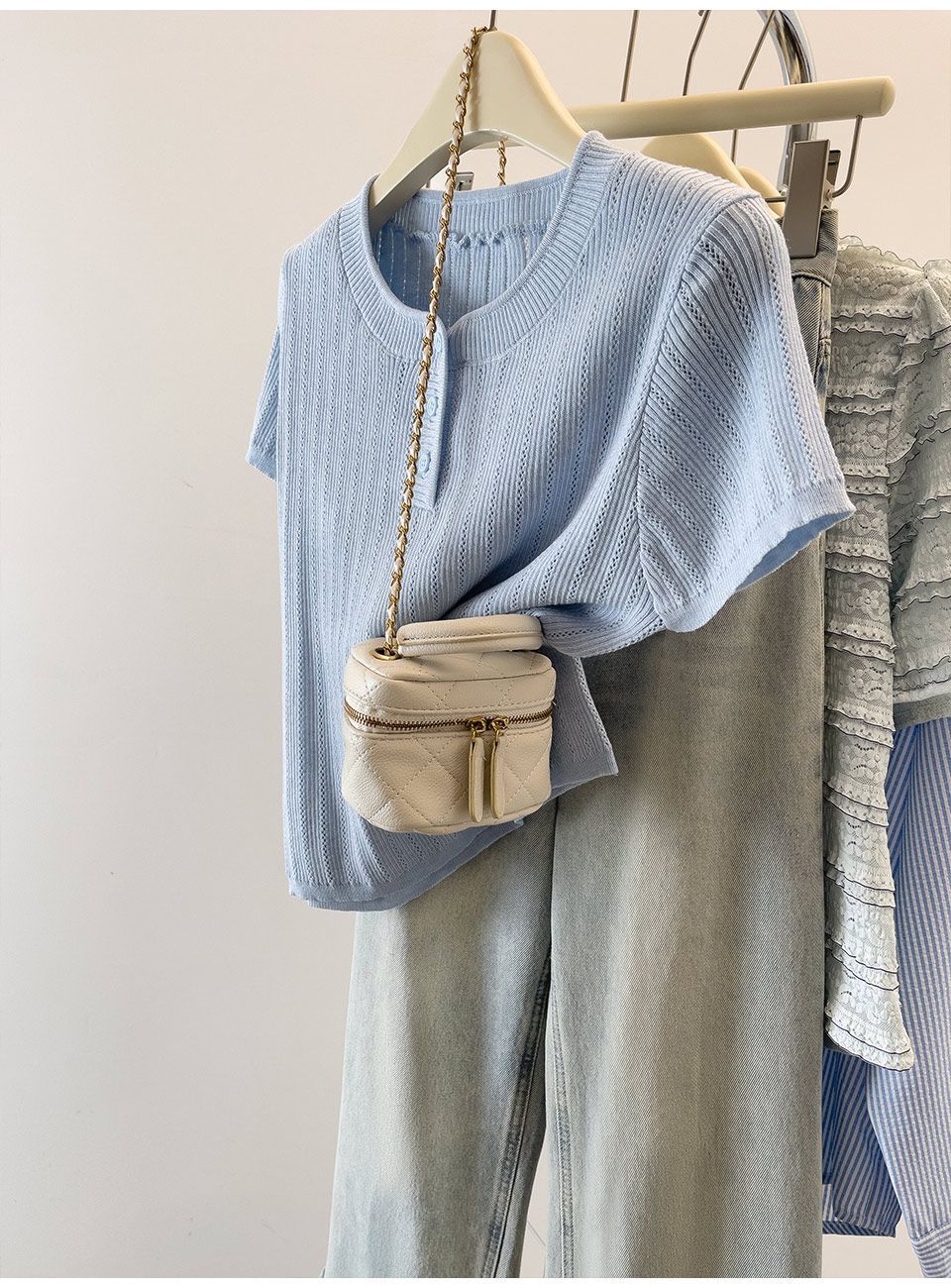 얇은 어깨 반팔 티셔츠 여자 2025 년 여름 새로운 아이스 실크 니트 스웨터 루즈 슬리밍 올 매치 쇼트 탑