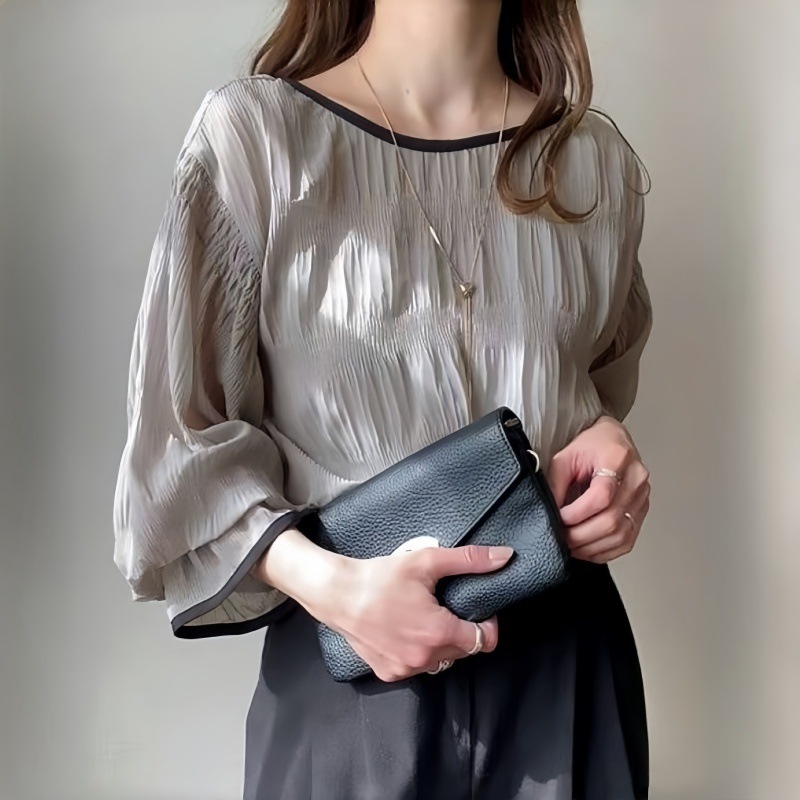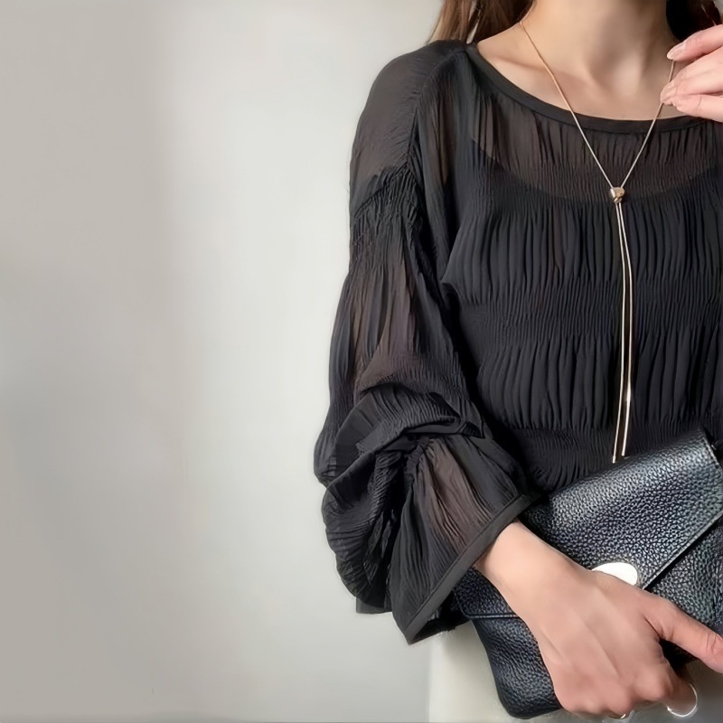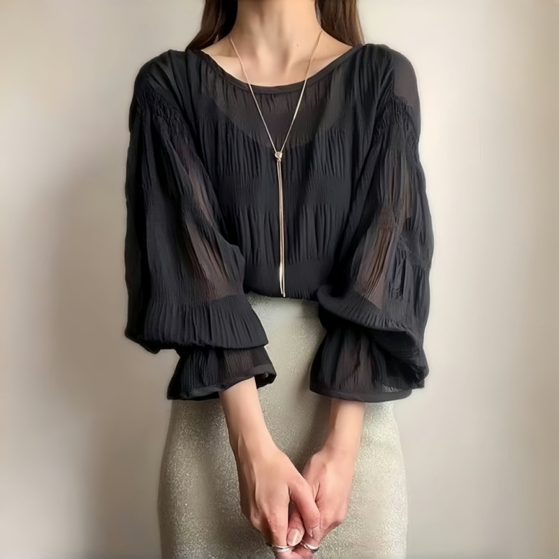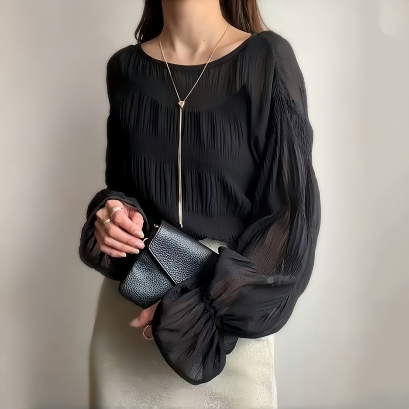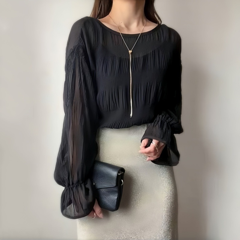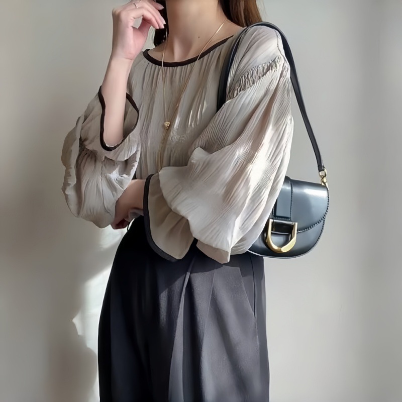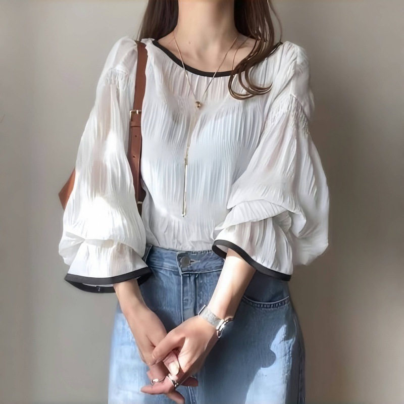 국경 간 일본과 한국 여름 새로운 단색 질감 주름 퍼프 슬리브 긴팔 라운드 넥 풀오버 쉬폰 셔츠 여성용스토어 가기