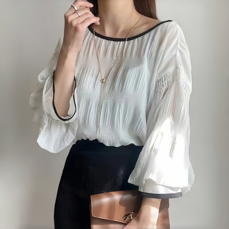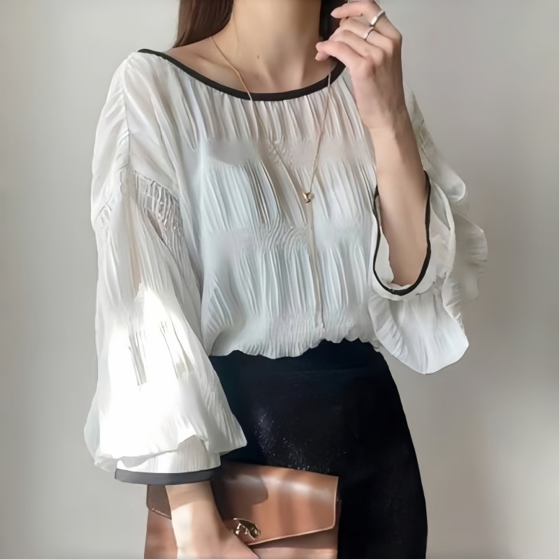 국경 간 일본과 한국 여름 새로운 단색 질감 주름 퍼프 슬리브 긴팔 라운드 넥 풀오버 쉬폰 셔츠 여성용