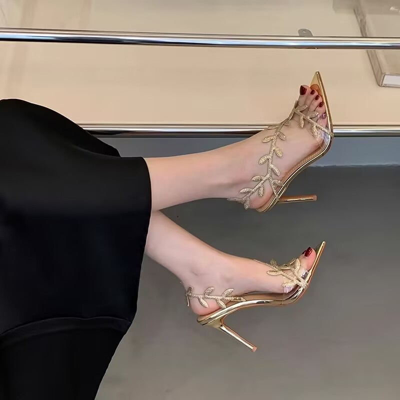 2025 봄과 가을 새로운 패션 다목적 틈새 디자인 골든 브랜치 하이힐 여성 스틸레토 오픈 토 샌들