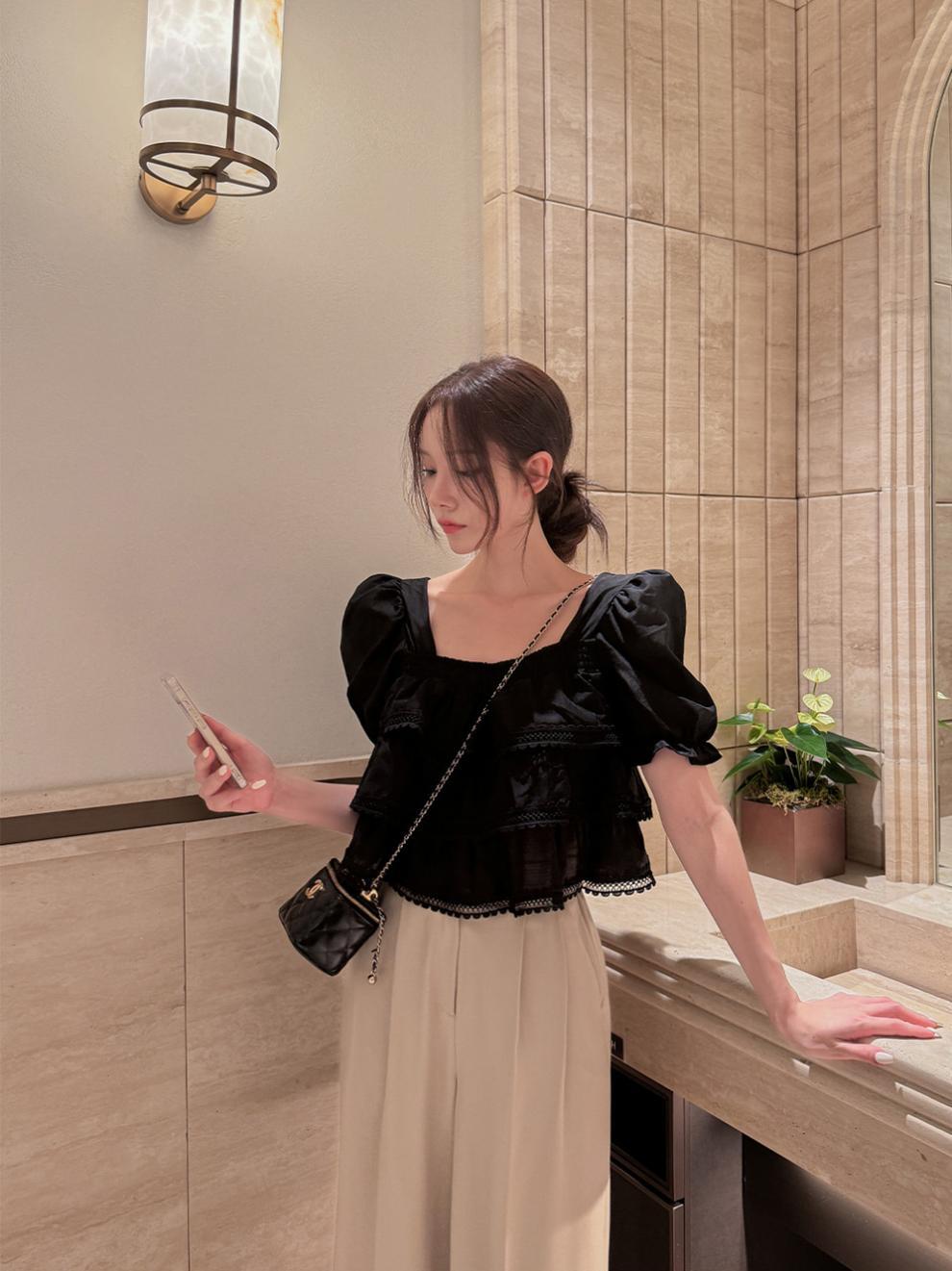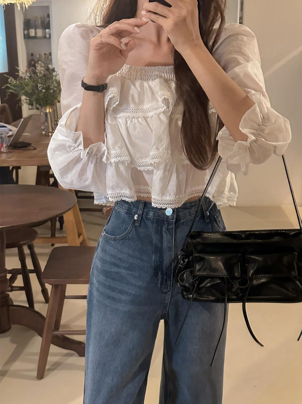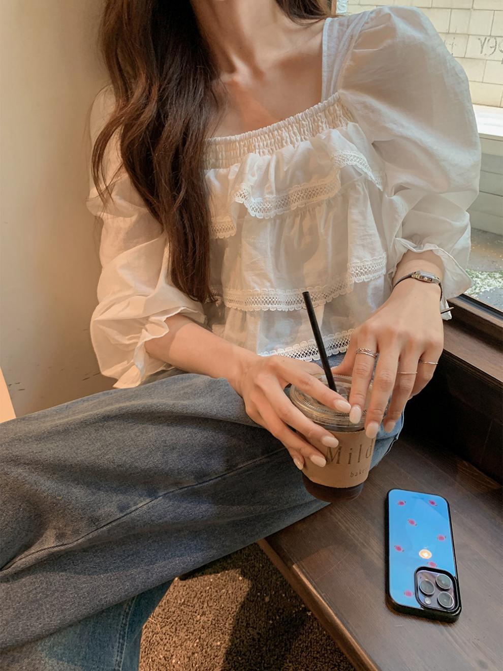헤비듀티 스위트 레이스 쉬폰 셔츠 한국 스타일 시크하고 가볍고 세련된 소녀들을 위한 독특한 디자인스토어 가기