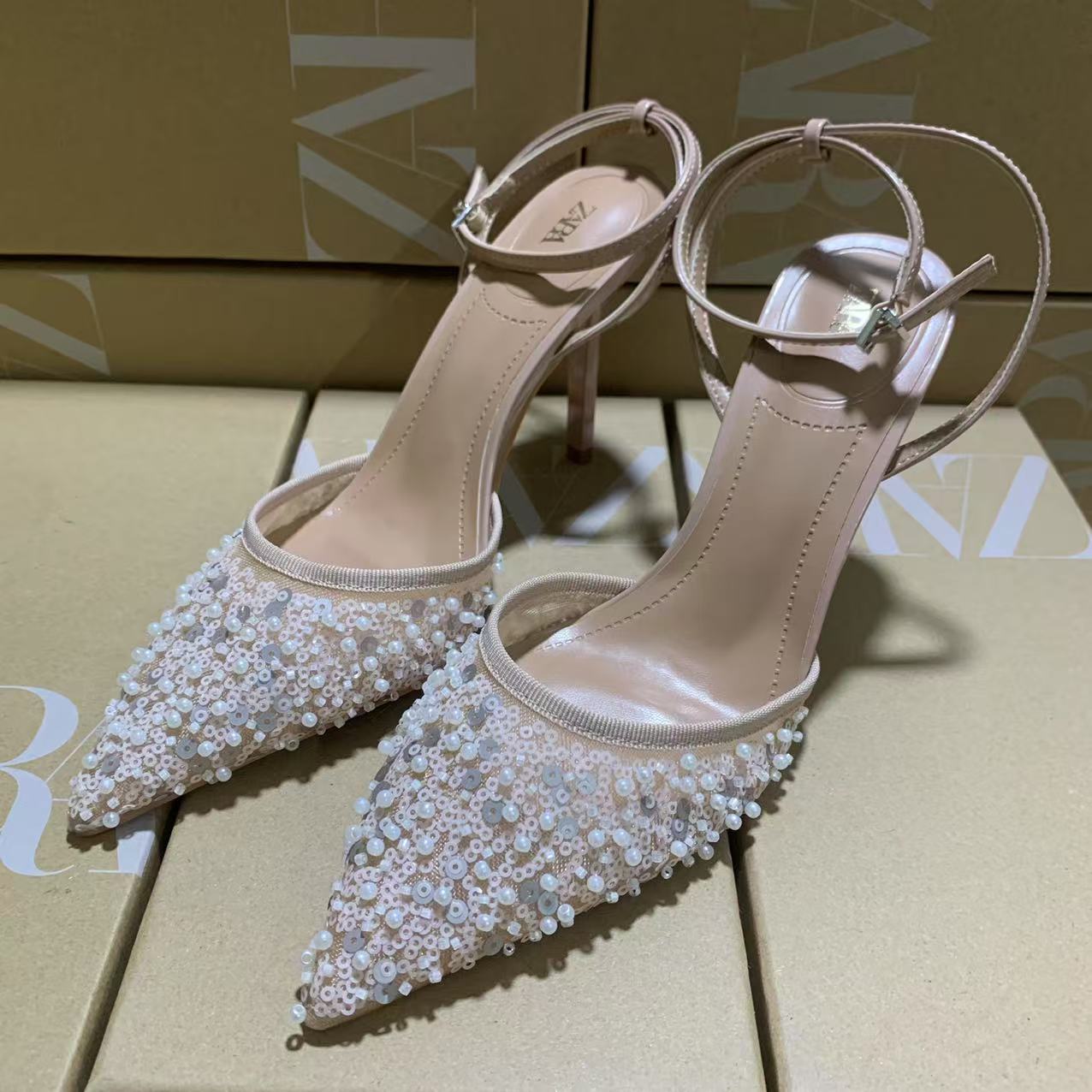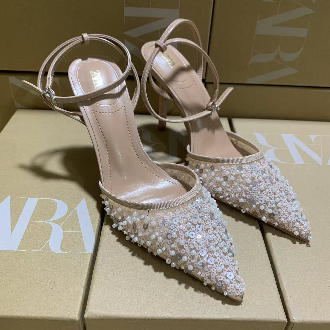 ZA의 2025년 신상 여성용 스팽글 스틸레토 하이힐, 섹시한 T자형 앞코와 뒷면이 빈 라인스톤 샌들스토어 가기