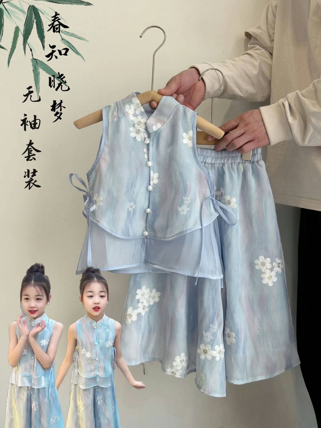 Spring Knows Dream 소녀용 민소매 버전 슈트, 꽃 자수 중국식 조끼, 와이드 팬츠, 텐셀 쉬폰, 부드럽고 편안함