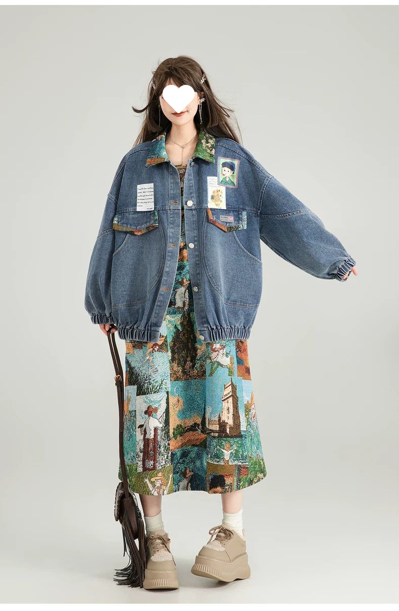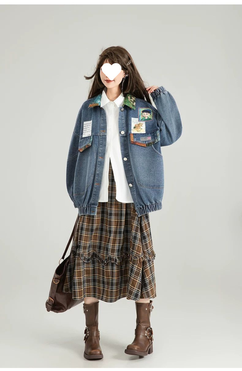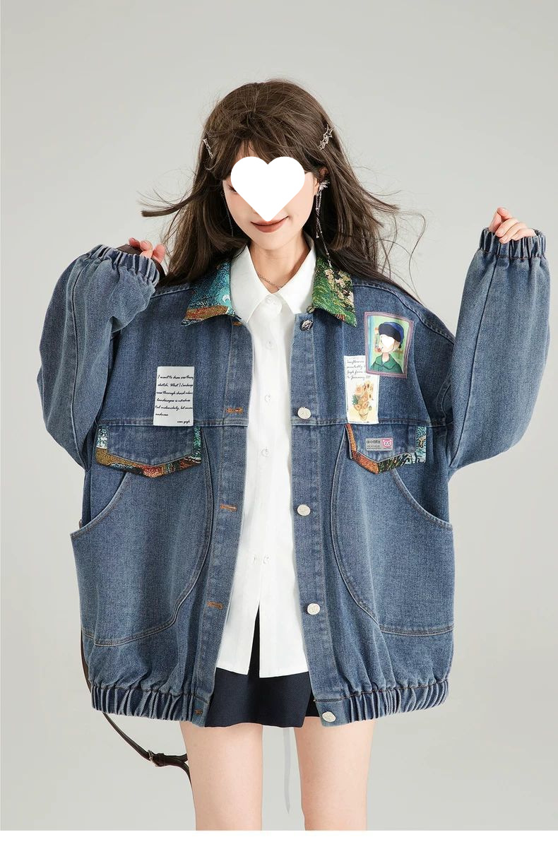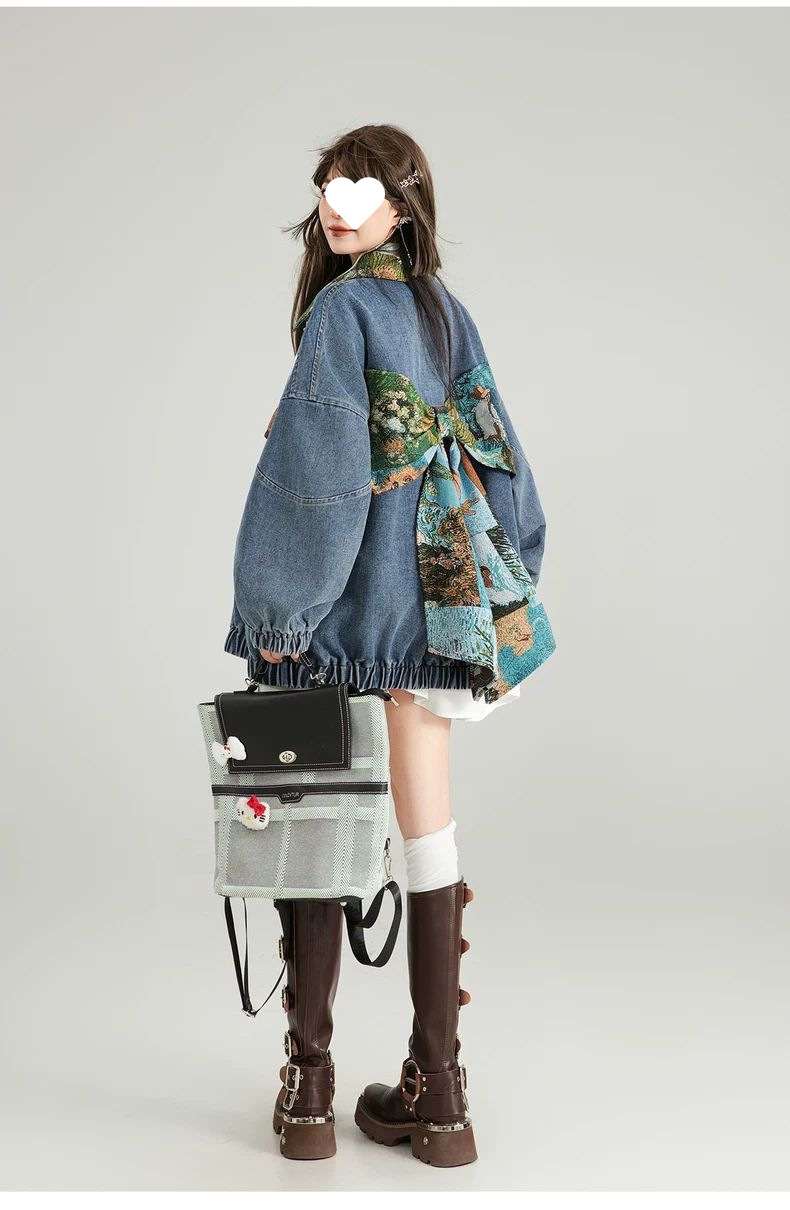 레트로 데님 자켓 여성 2025 가을 프랑스 문학 예술 자카드 보우 트림 자켓 탑 봄 가을스토어 가기