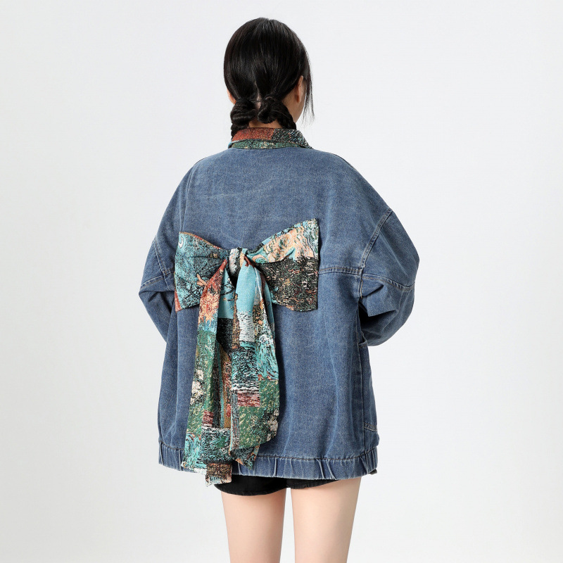 레트로 데님 자켓 여성 2025 가을 프랑스 문학 예술 자카드 보우 트림 자켓 탑 봄 가을