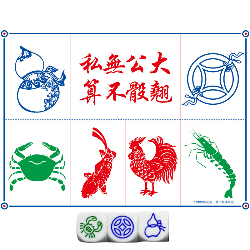 3.双骰的下注区域双骰下注是于两粒骰中有15种不同的组合以供选择下注。如出现所选图案获1:5之赔付。如出现所选图案,而其中一图案出现两次,获1:7之赔付。举例:如果你在这个区域下注了鱼+虾100远。如果3个骰子里面,庄家开出是(鱼,虾,葫芦)这样,那么你赢得500远。如果3个骰子里面,庄家开出是(鱼,鱼,虾)或者(鱼,虾,虾)这样,那么你赢得700远。