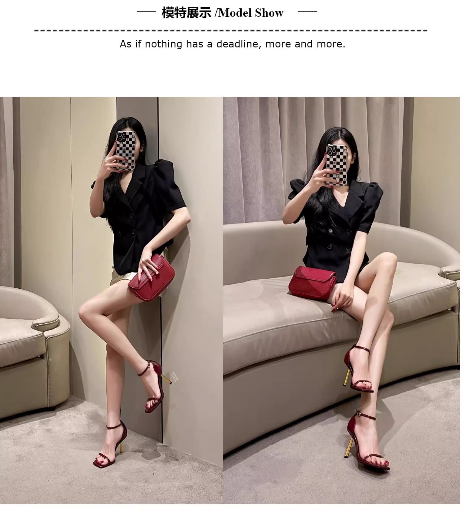 2025 년 여름 새로운 블랙 특허 가죽 하이힐, 스퀘어 토 여성용 스틸레토 힐 샌들 올 매치 골드 힐 오픈 발가락스토어 가기