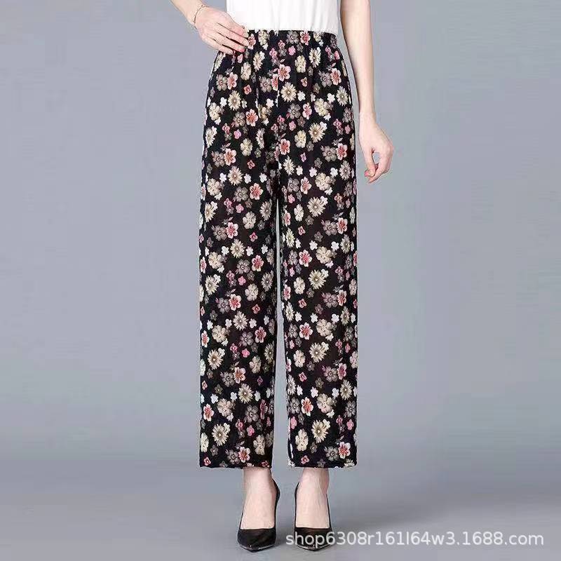 중년 및 노인 여성 꽃 바지 여름 아이스 실크 나인포인트 얇은 캐주얼 중년 및 노인 플러스 지방 높은 허리 느슨한 모기 방지 엄마 바지
