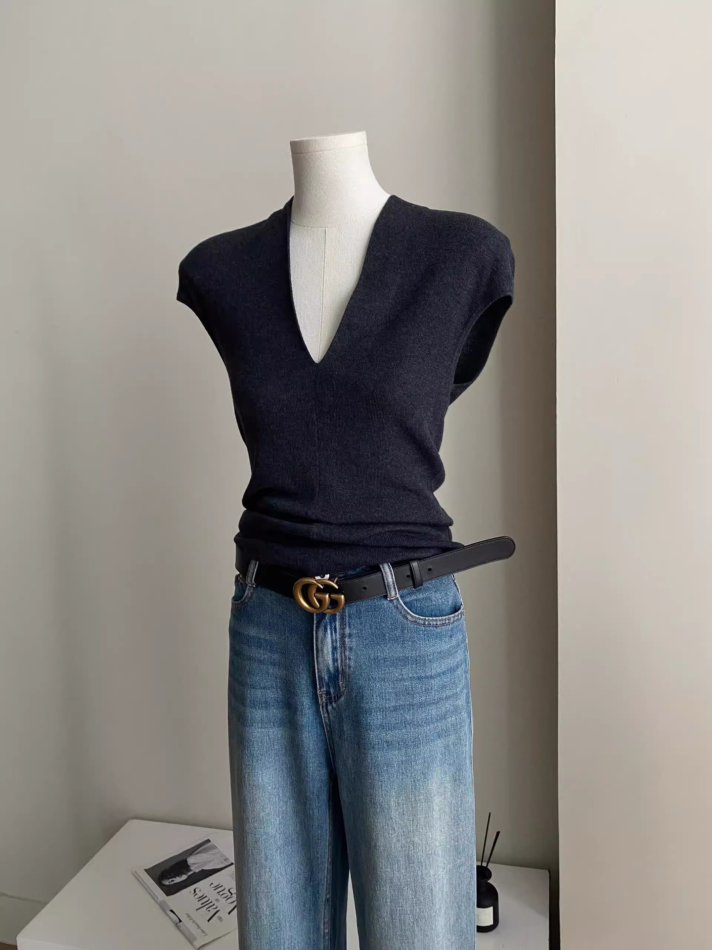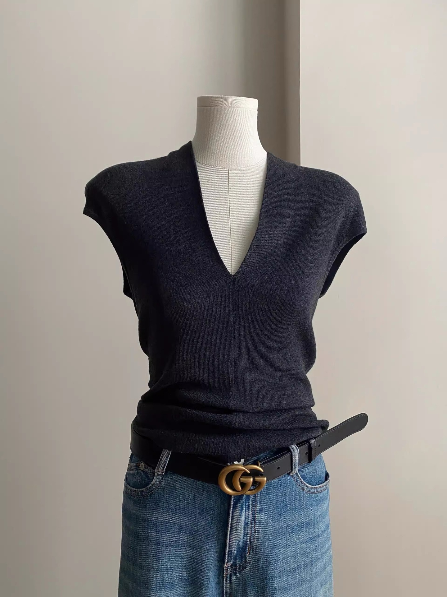 欧货灰色v领小飞袖冰丝针织t恤女夏季短款修身显瘦薄款背心上衣夏