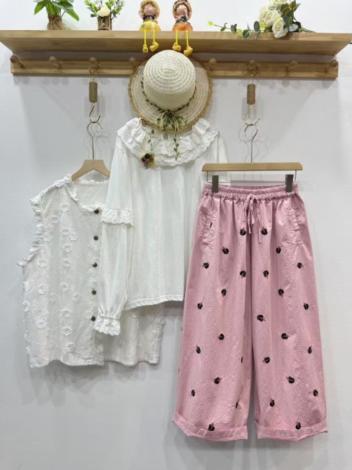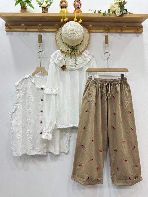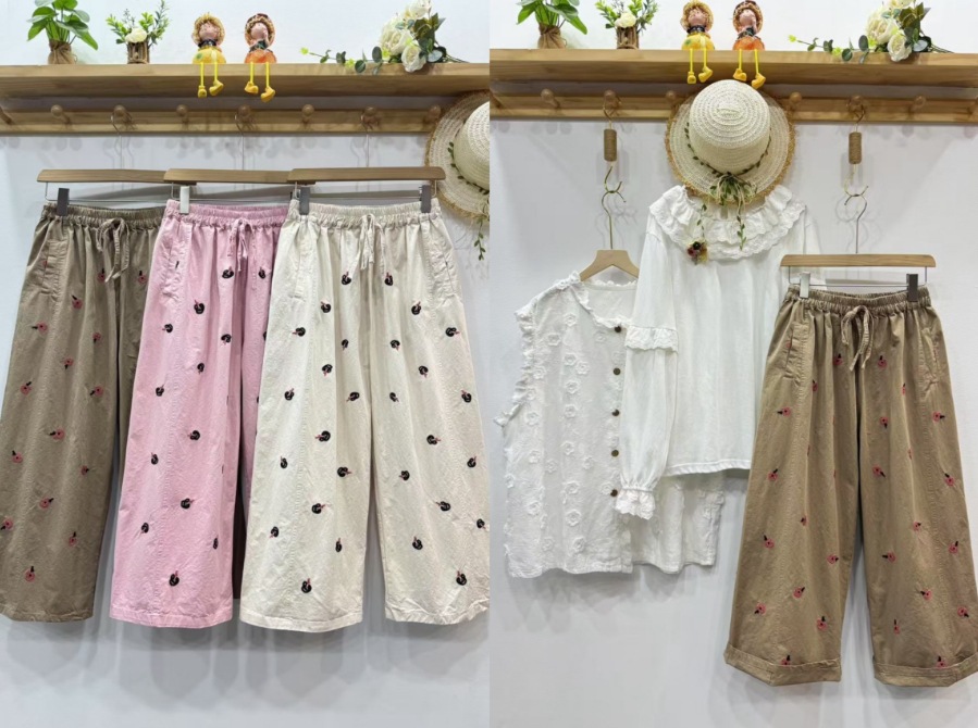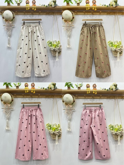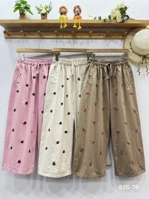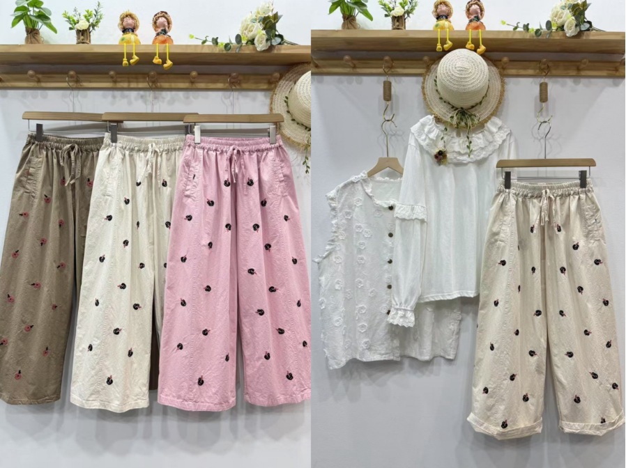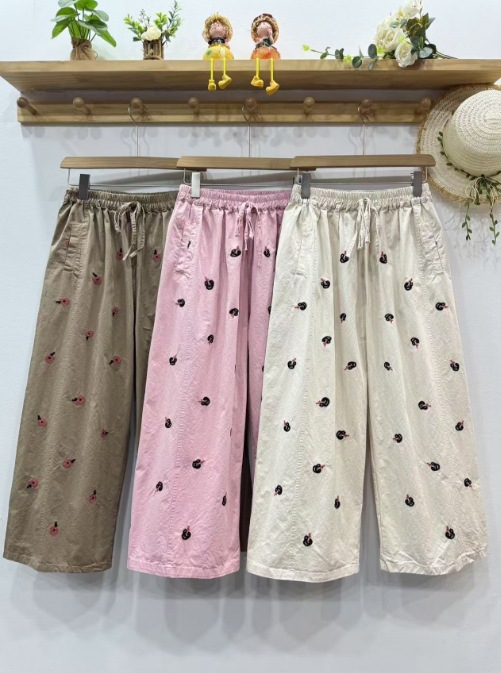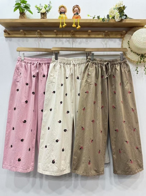 한국식 여성 새 도착 올매치 슬림 자수 엘레 허리 드로우 스트링 느슨한 스트레이트 다리 바지 여성용 캐주얼 바지스토어 가기